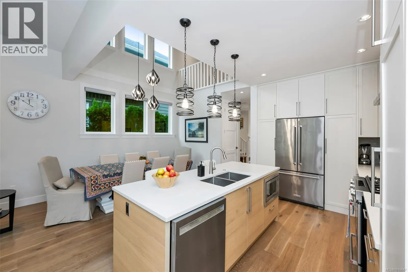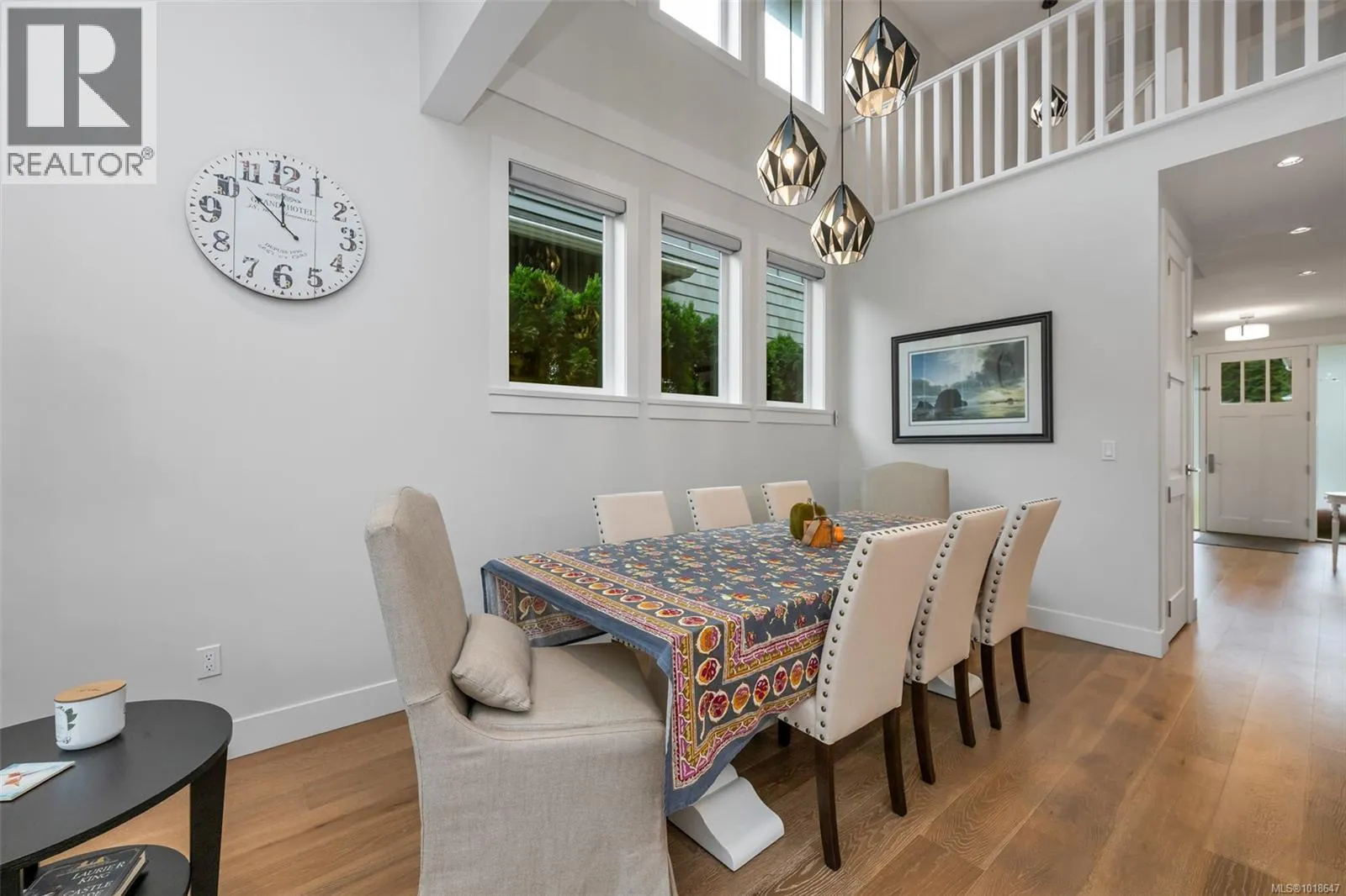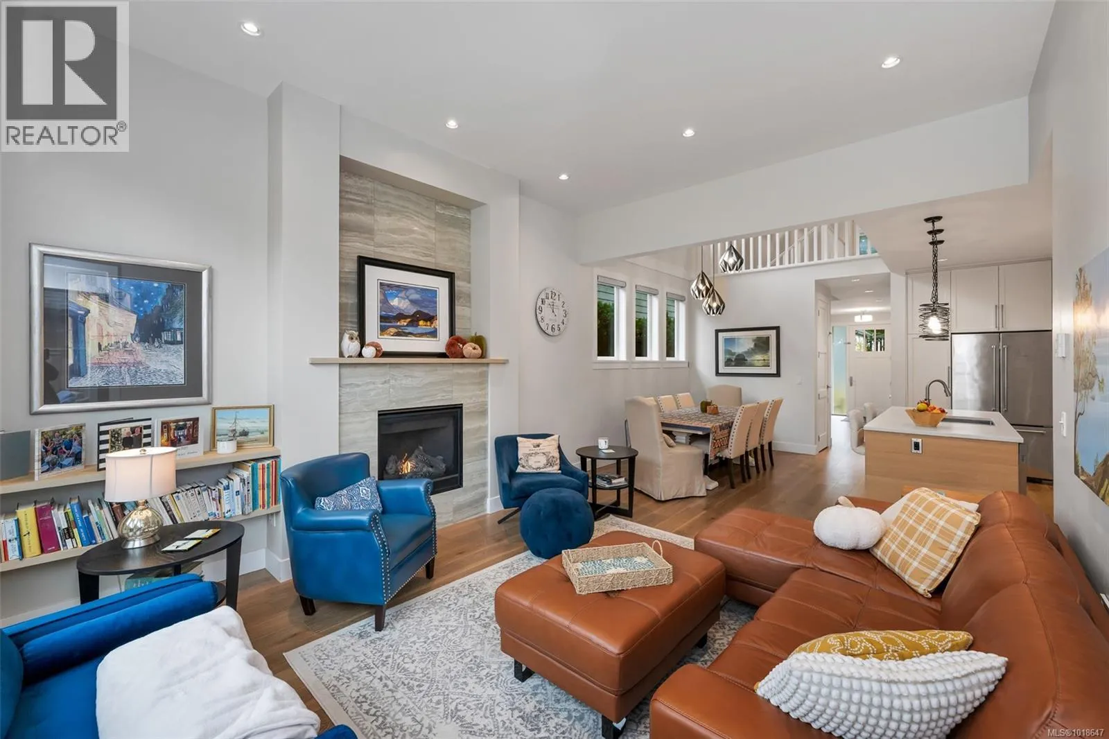 Welcome to this beautifully designed 3 bed, 3 bath single-family home in the heart of Saanichton. With vaulted ceilings and expansive windows, this home is filled with natural light and an airy, inviting atmosphere. The open-concept main level features oak flooring, a cozy gas fireplace, and a stunning kitchen with ss appliances, large island with breakfast bar, and sleek modern finishes. The primary suite, located on the ground level, offers a spacious walk-in closet, as well as a spa-inspired ensuite featuring a separate soaker tub, walk-in shower, and dual vanity. Upstairs are two additional bedrooms and a versatile loft-style family room. Outside, unwind on the spacious west-facing patio and take in the beautiful evening sunsets. Additional features include efficient heat pumps with air conditioning, a pantry/laundry room, garage, and carport. Located just a short stroll from local amenities, including groceries, a Pharmacy, cafes, and restaurants. Don't miss this modern gem in the heart of Saanichton. (id:27476)