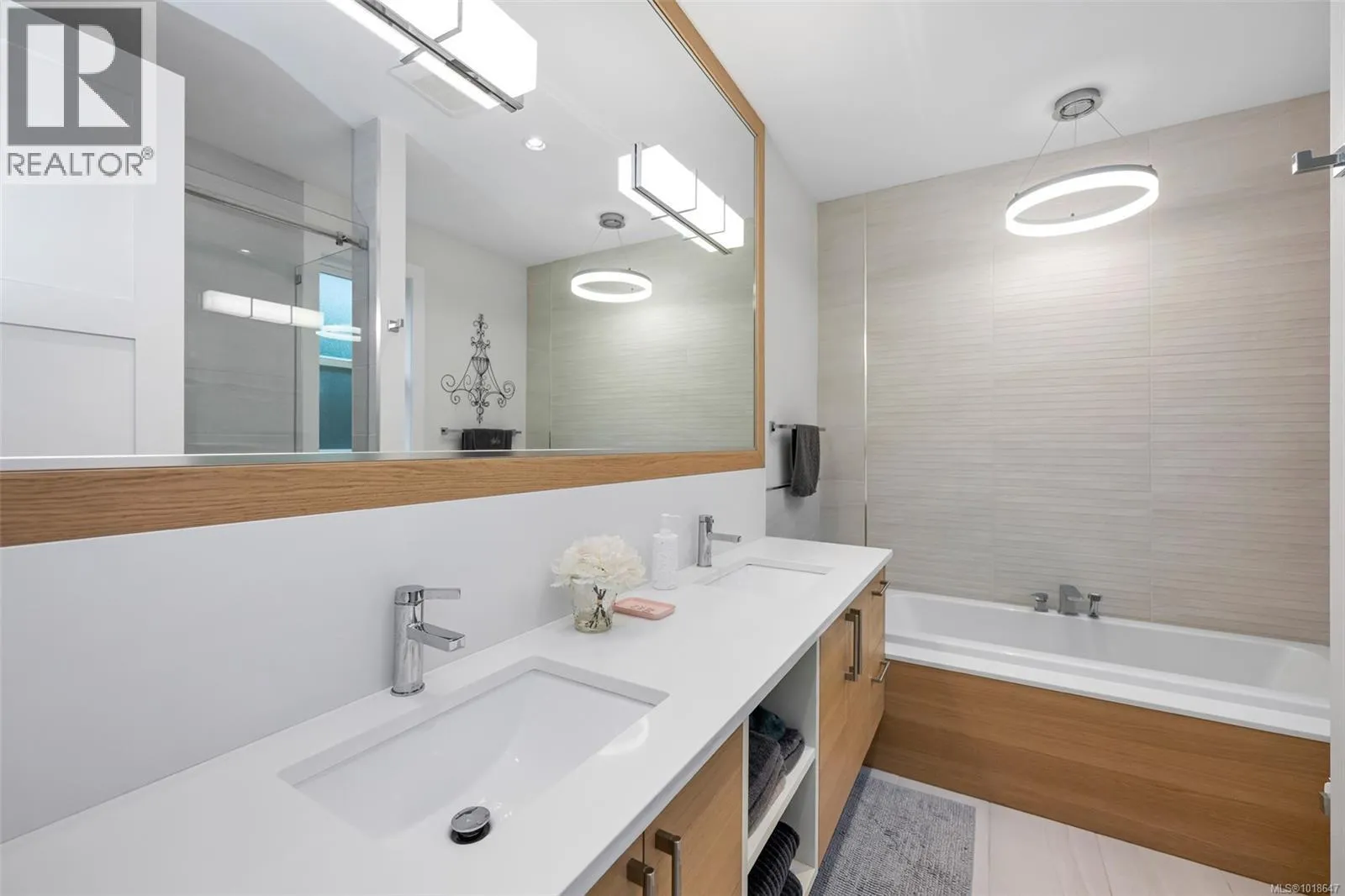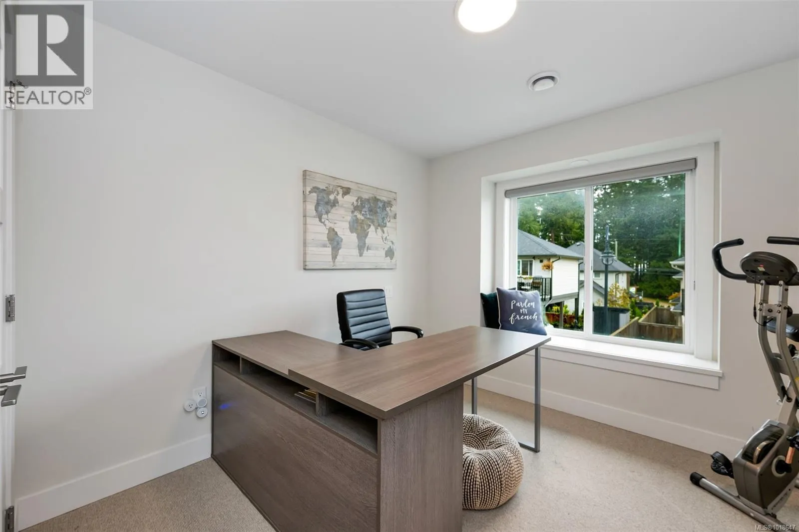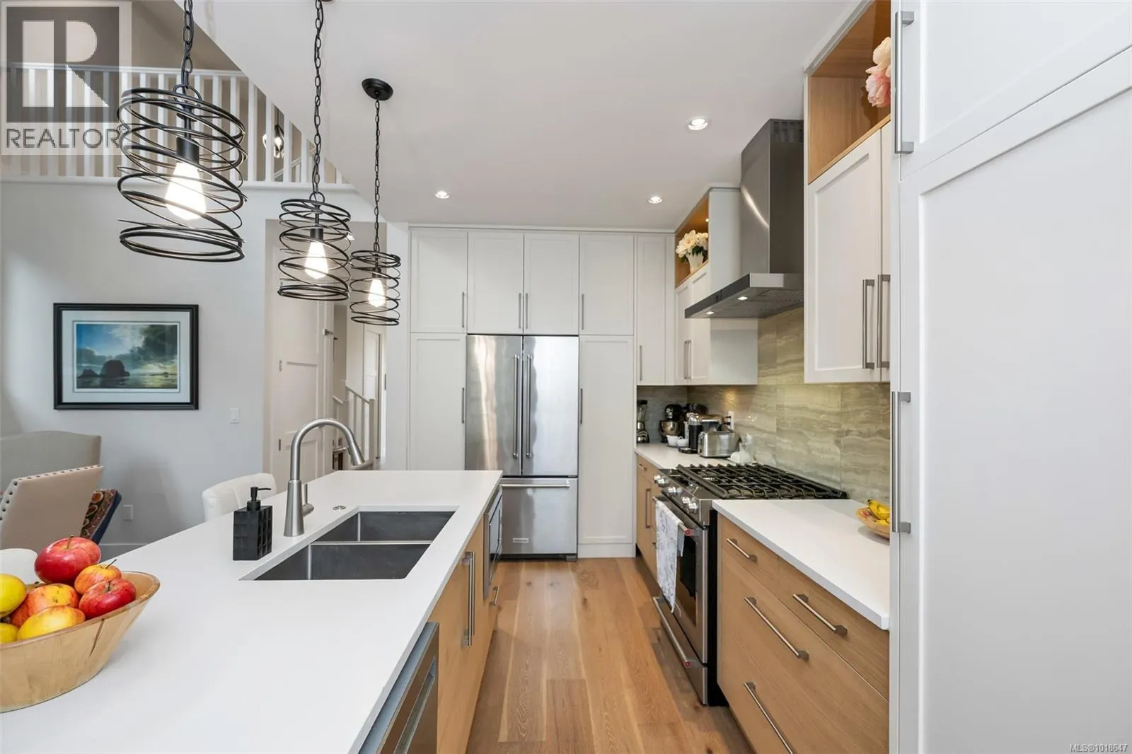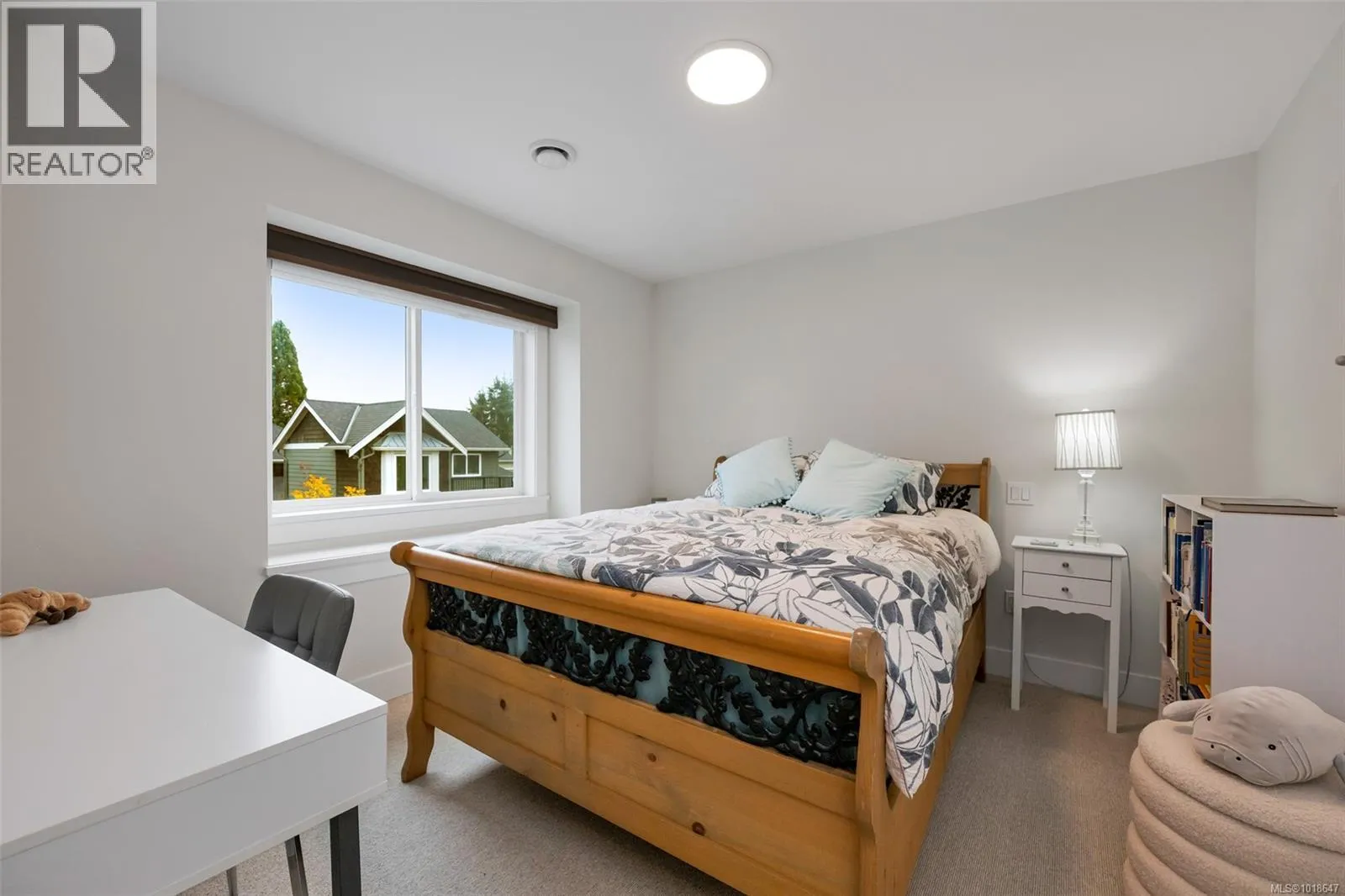 Welcome to this beautifully designed 3 bed, 3 bath single-family home in the heart of Saanichton. With vaulted ceilings and expansive windows, this home is filled with natural light and an airy, inviting atmosphere. The open-concept main level features oak flooring, a cozy gas fireplace, and a stunning kitchen with ss appliances, large island with breakfast bar, and sleek modern finishes. The primary suite, located on the ground level, offers a spacious walk-in closet, as well as a spa-inspired ensuite featuring a separate soaker tub, walk-in shower, and dual vanity. Upstairs are two additional bedrooms and a versatile loft-style family room. Outside, unwind on the spacious west-facing patio and take in the beautiful evening sunsets. Additional features include efficient heat pumps with air conditioning, a pantry/laundry room, garage, and carport. Located just a short stroll from local amenities, including groceries, a Pharmacy, cafes, and restaurants. Don't miss this modern gem in the heart of Saanichton. (id:27476)