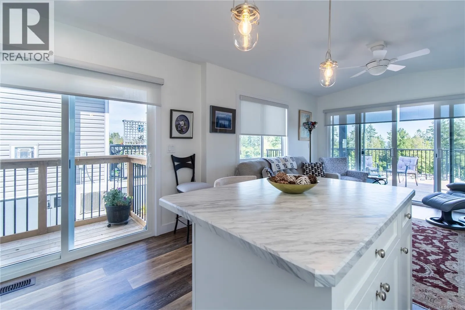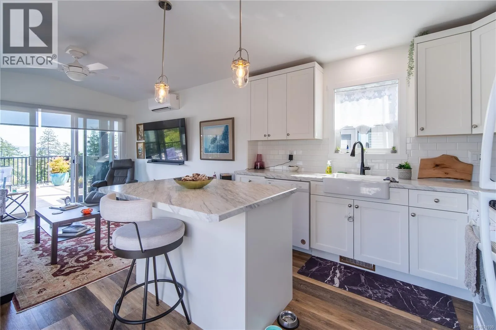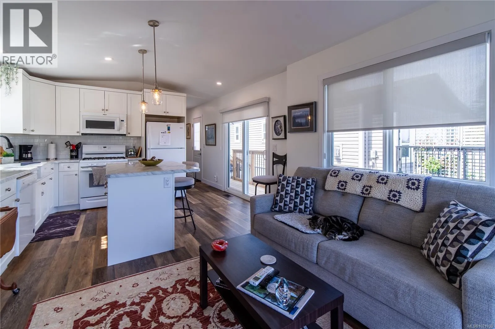 Welcome to coastal living in this 2023-built, 516 sq ft manufactured home offering bright, single-level comfort. One bedroom, one bath, and an open-concept design with vaulted ceilings and remote blinds create a spacious feel. The kitchen features a propane stove, above-range microwave, fridge, dishwasher and island. The home also includes a built-in washer/dryer. Enjoy sweeping ocean views of James Island to the San Juans from the living room, kitchen, and front deck through full sliding glass doors, plus a second slider off the kitchen to a side deck. Extras include a ceiling fan, heat pump with air conditioning, on-site parking, clubhouse, laundry/shower facilities, and underground services. (id:27476)