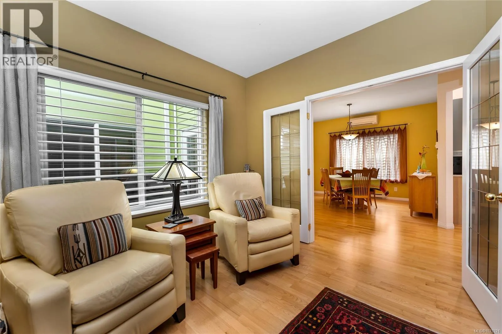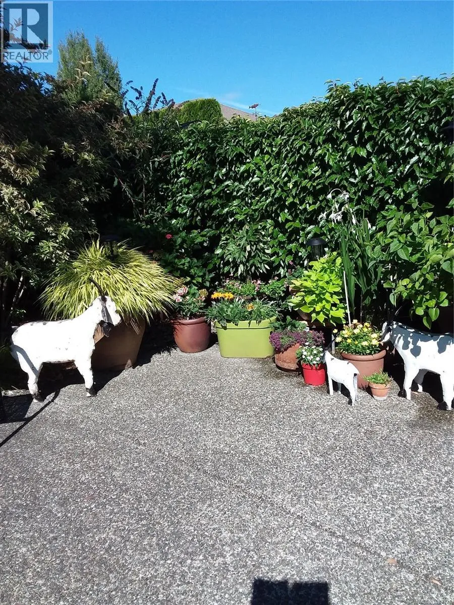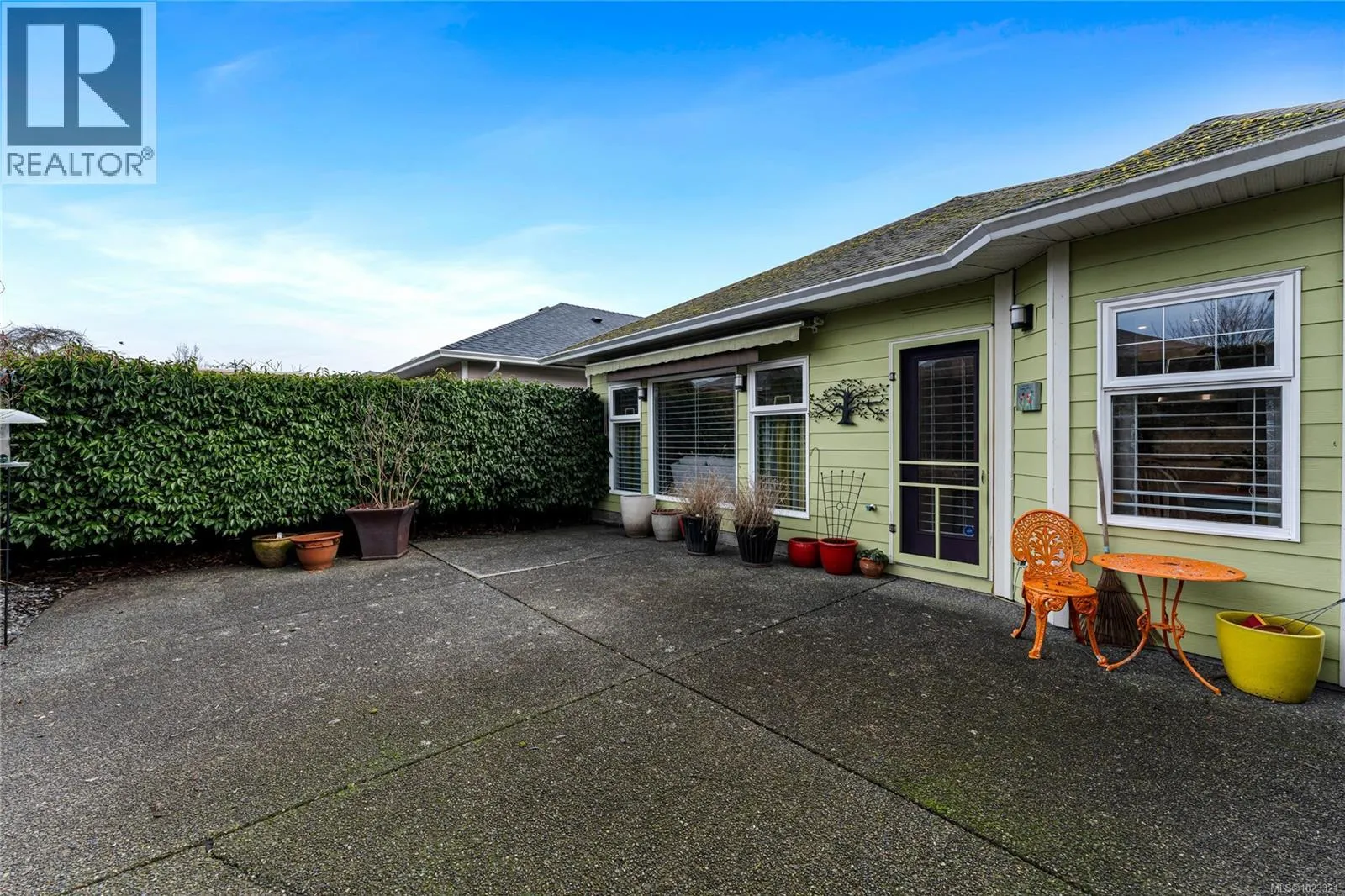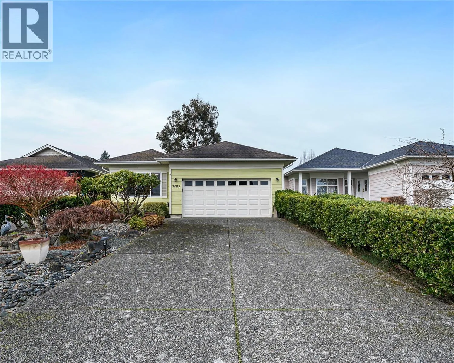 This beautifully maintained home offers a thoughtfully designed 2-bedroom plus den, 2-bathroom layout. Interior features include hardwood floors, a cozy gas fireplace, and a unique central atrium that fills the home with natural light. The kitchen was updated in 2024 and features quartz countertops, new appliances, including an AEG steam oven, and an inviting eating nook. Both bathrooms were also beautifully renovated in 2022. Other quality highlights include a Miele washer and dryer, a heat pump and air conditioning unit, a double garage, and an efficient sprinkler system. Step outside to an incredibly private, easy-care sanctuary: a sun-drenched patio with a retractable awning, vibrant spring blooms, and a dedicated space for a vegetable garden, complete with a garden shed. Located in a quiet, peaceful area of Central Saanich, yet just minutes to shops, transit, and all the local amenities. (id:27476)