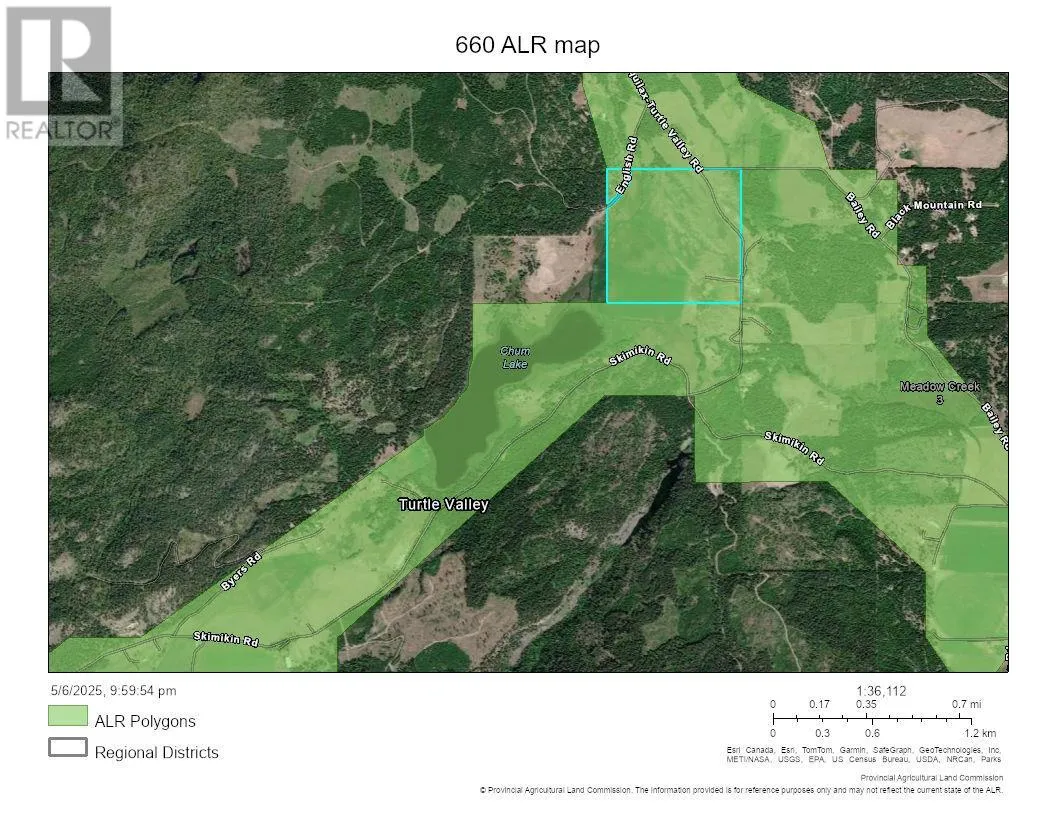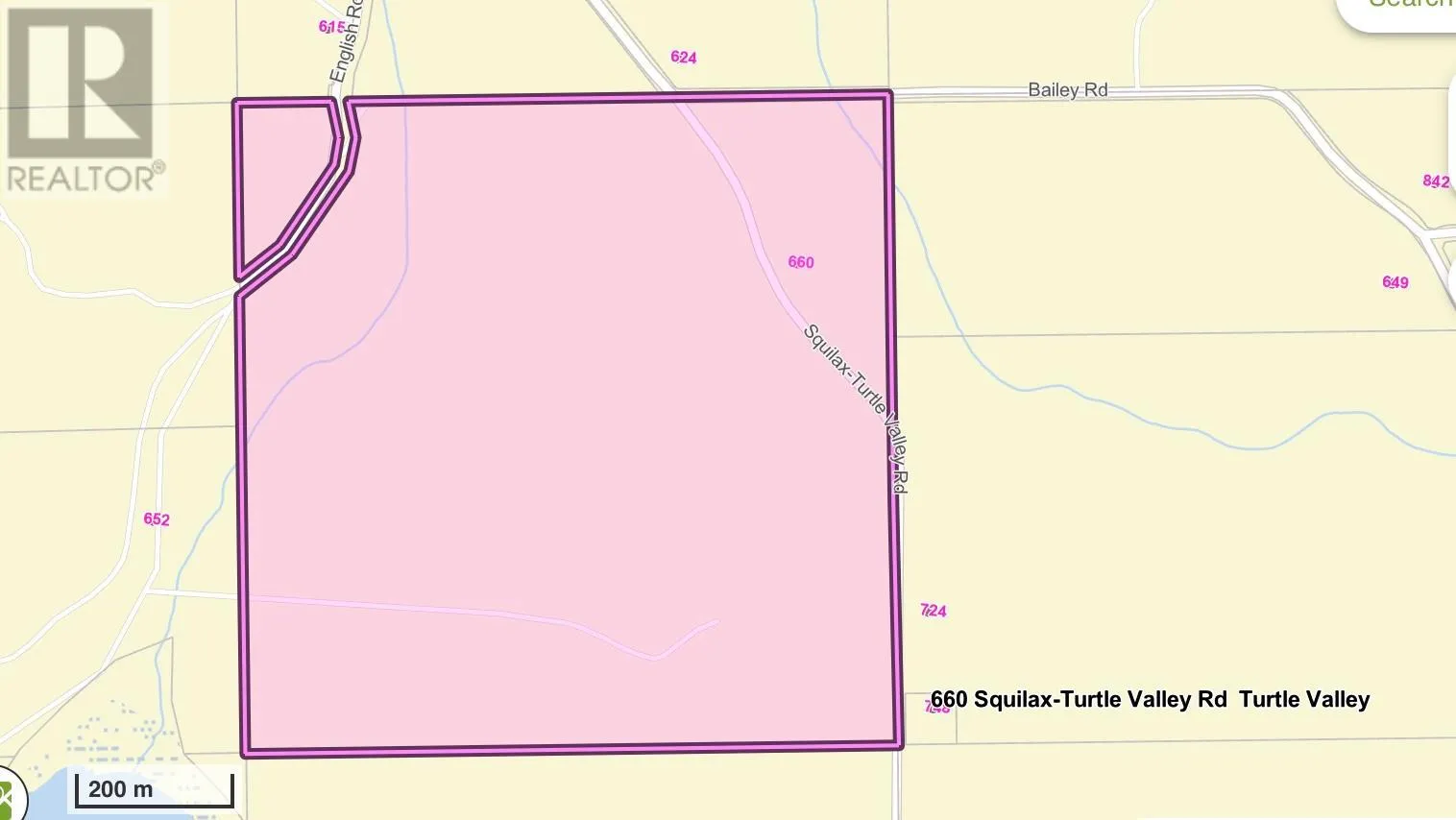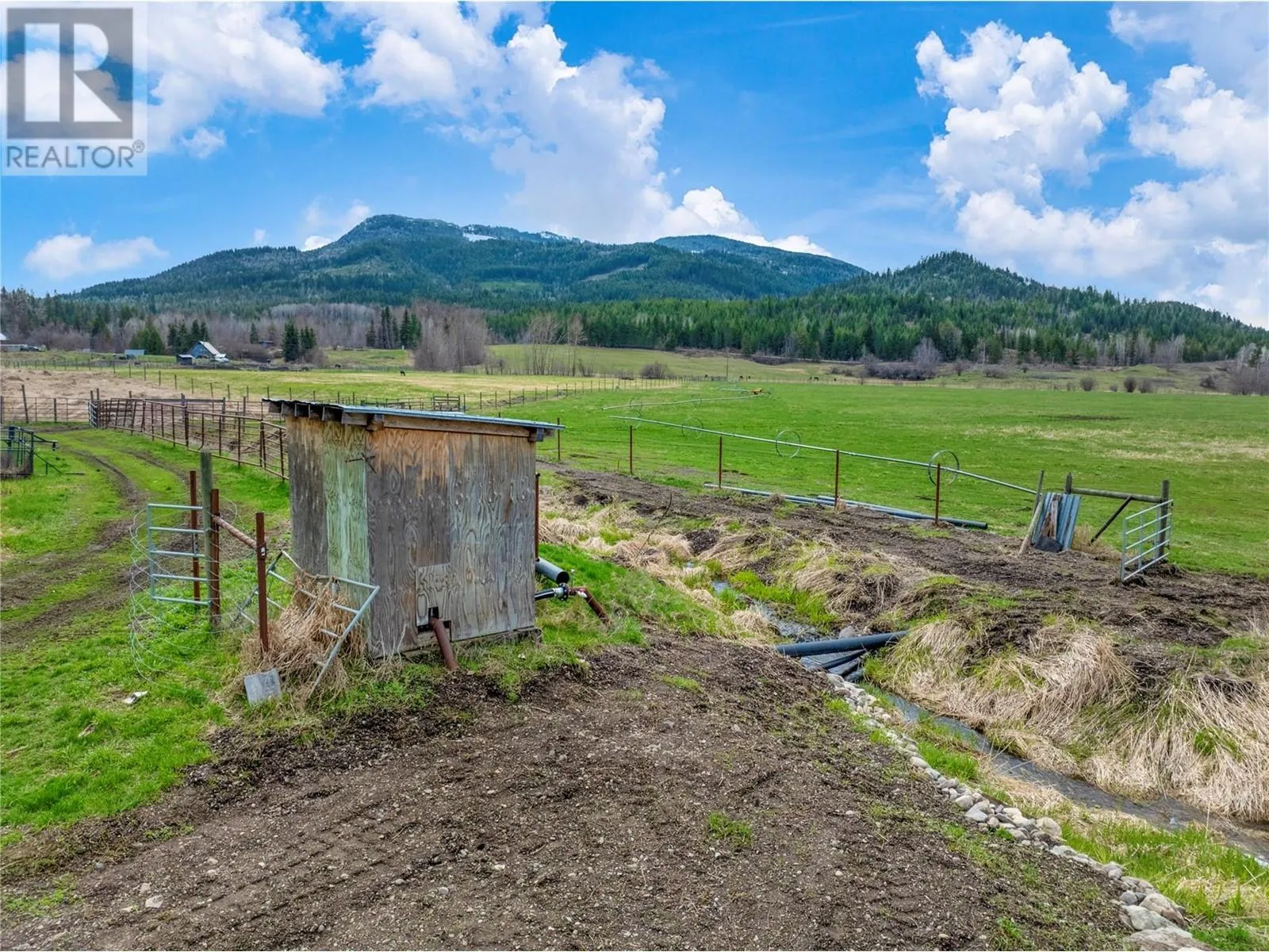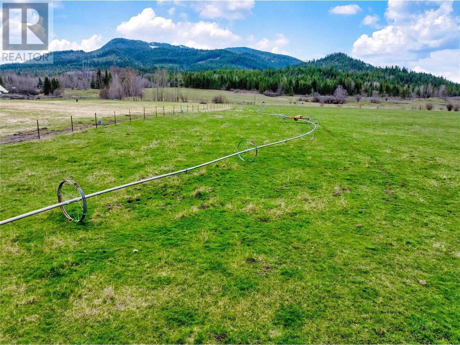 This 1/4 section of ALR land is nestled in the scenic farming location of Turtle Valley, less than one hour from Kamloops and just outside the town of Chase. It includes approximately 110 acres of irrigated farmland and a newly installed pivot irrigation system in 2024. The NE 13-acre corner includes a test well site with a confirmed high-flow water source (artesian well). This has a water line connected that would allow for development of a residential dwelling with a panoramic view of the valley overlooking Chum Lake and Creek. There are 4 water licences on the property: 2 irrigation licences with stream storage sites on Chum Creek, one irrigation from Trail Creek, and one land improvement licence for the drainage ditch from Eva Creek. There is also an easement on title for access across 652 English Road property for use of the pumphouse/dam storage site on Chum Creek. Previously used for bison pasture as well as hay production, this property is partially fenced with 5-foot game fencing. Structures include an L-shaped calving shed as part of a livestock finishing operation. It is also serviced for livestock watering with 4 troughs linked in a gravitational feed system. A secondary booster pump house and associated underground water lines and 6 hydrants add extra irrigation capacity to areas not serviced by the pivot. (id:27476)