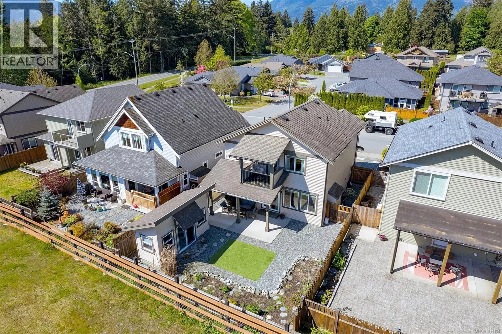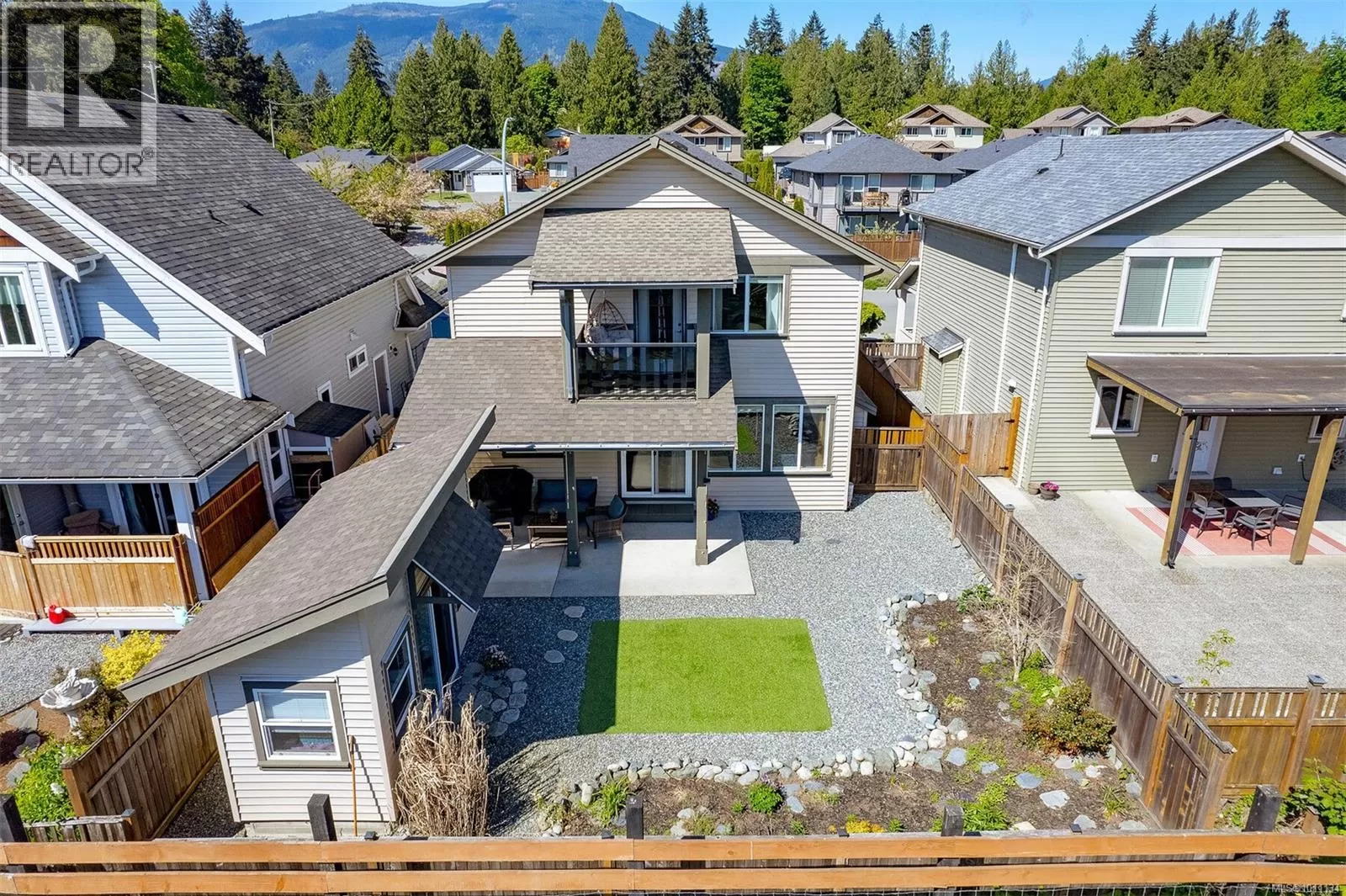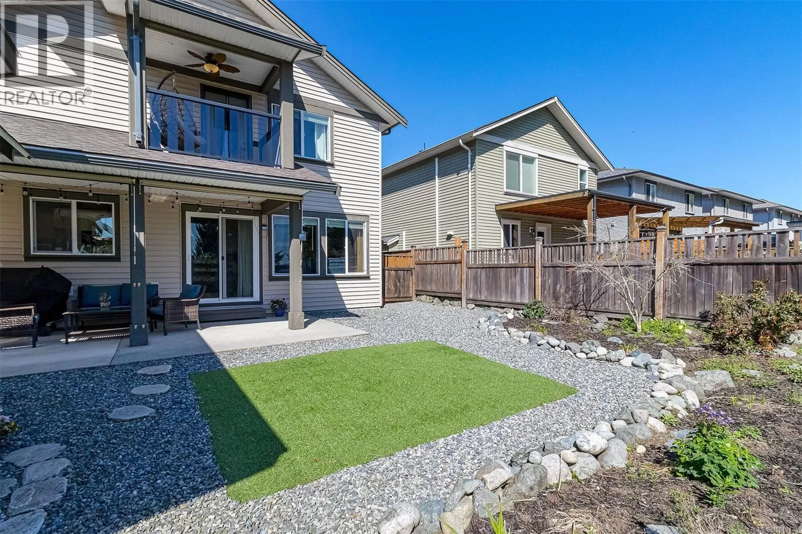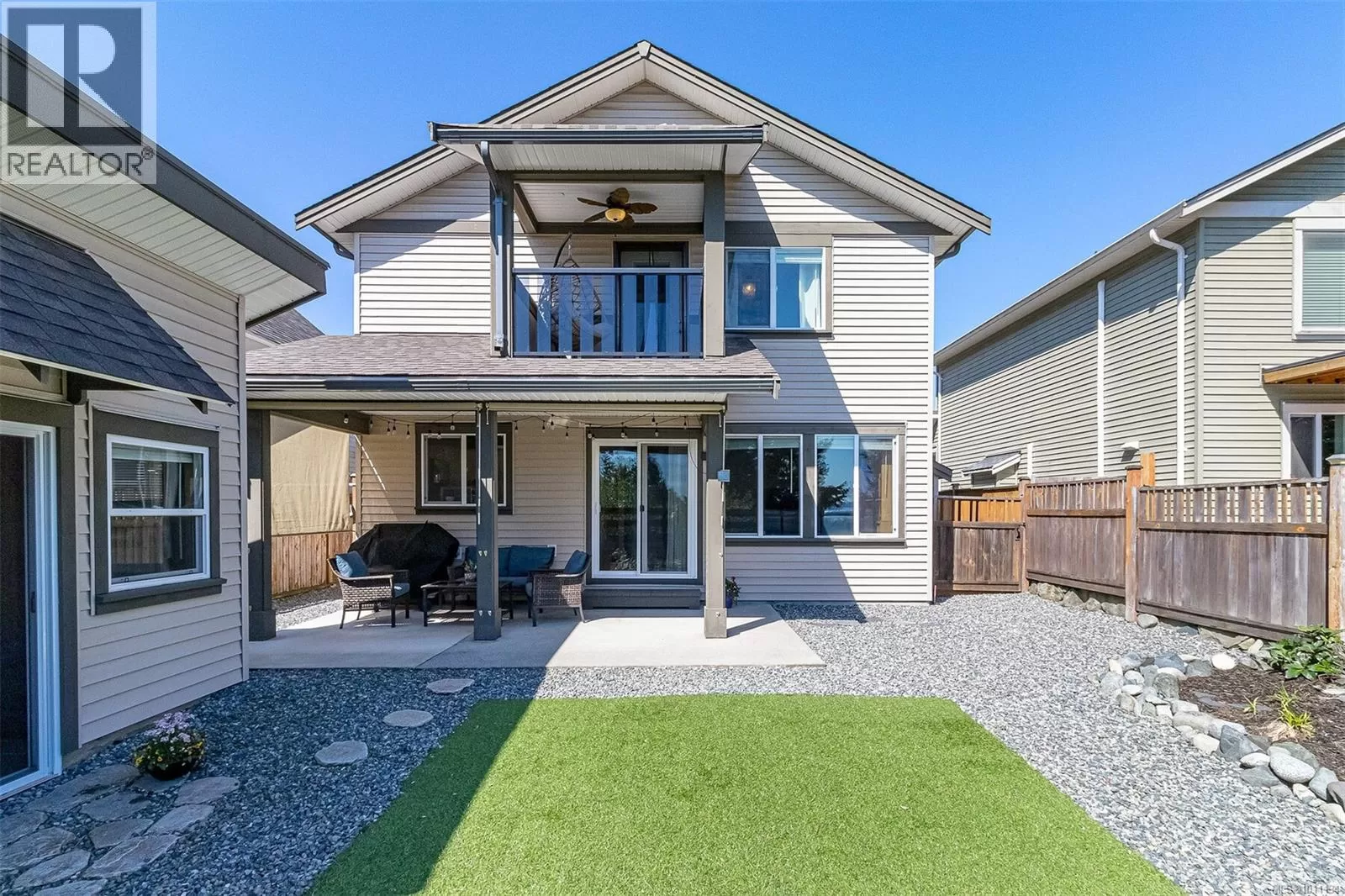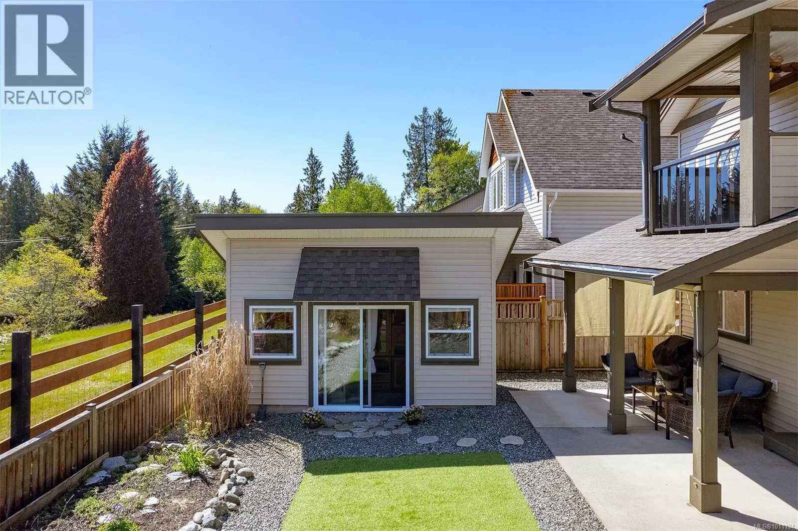 Exquisite 3 bedroom , 3 bath home in historic Chemainus with distant ocean views. The primary suite boasts a private balcony, spa-inspired- 4 pce ensuite, and a huge walk in closet. Two additional spacious bedrooms complete the upper level. Featuring wood floors, tiled bathrooms, and a floor to ceiling stone fireplace in the living room, this home blends warmth and elegance. The modern kitchen offers newer stainless steel appliances, a large sit in island , and direct access to a covered deck overlooking the serene backyard. A detached studio with in floor heating, and ready to be plumbed, adds endless possibilities. Oversized single garage plus extra driveway parking. Walking distance to town and all amenities in a highly sought after neighborhood. This home has lots of extras and great value! (id:27476)