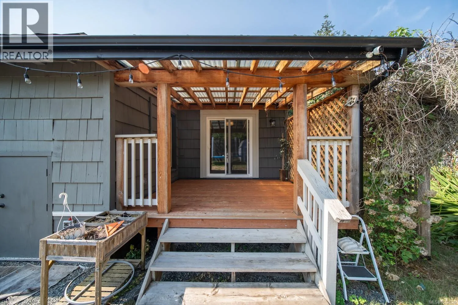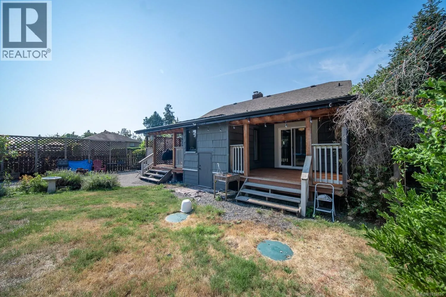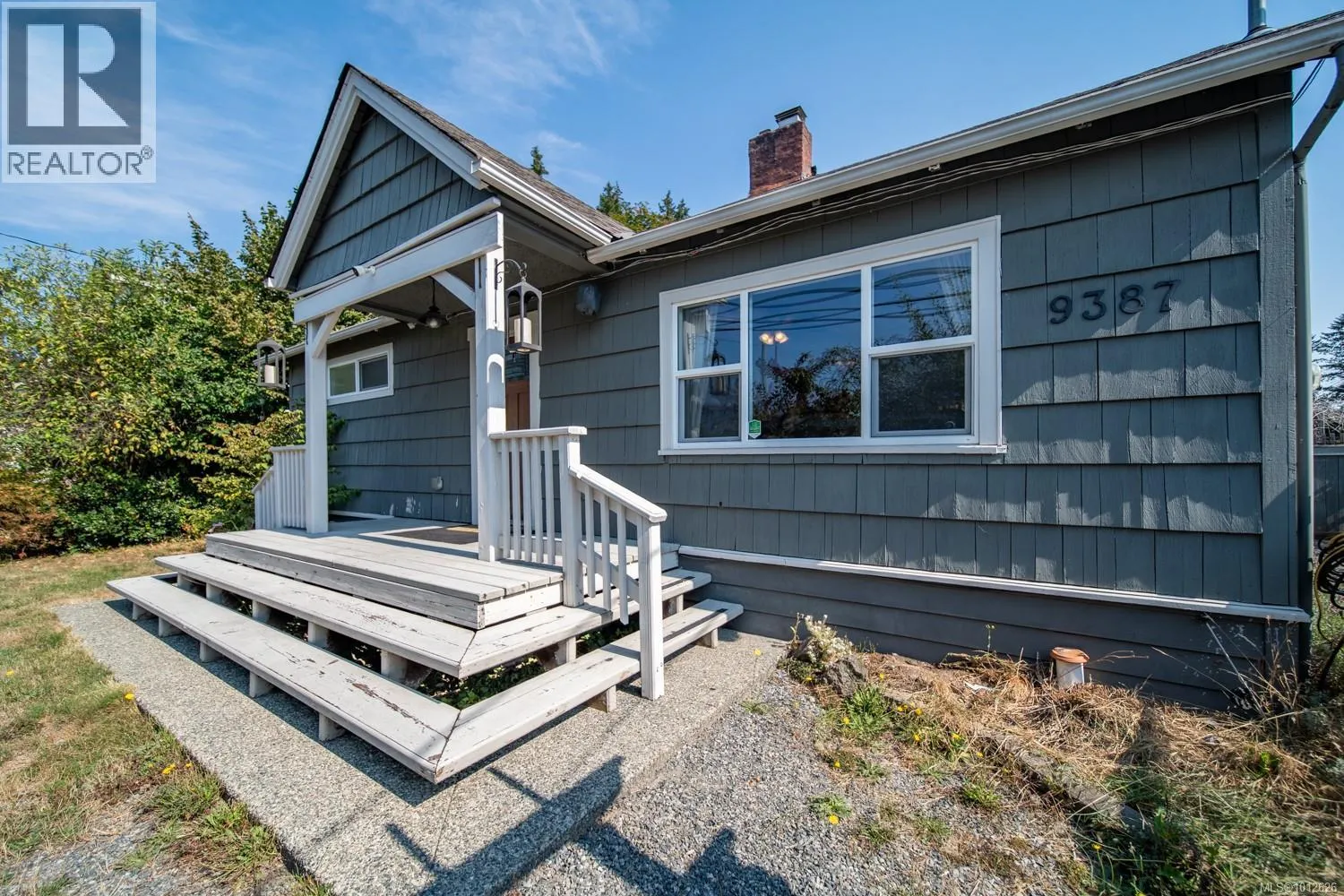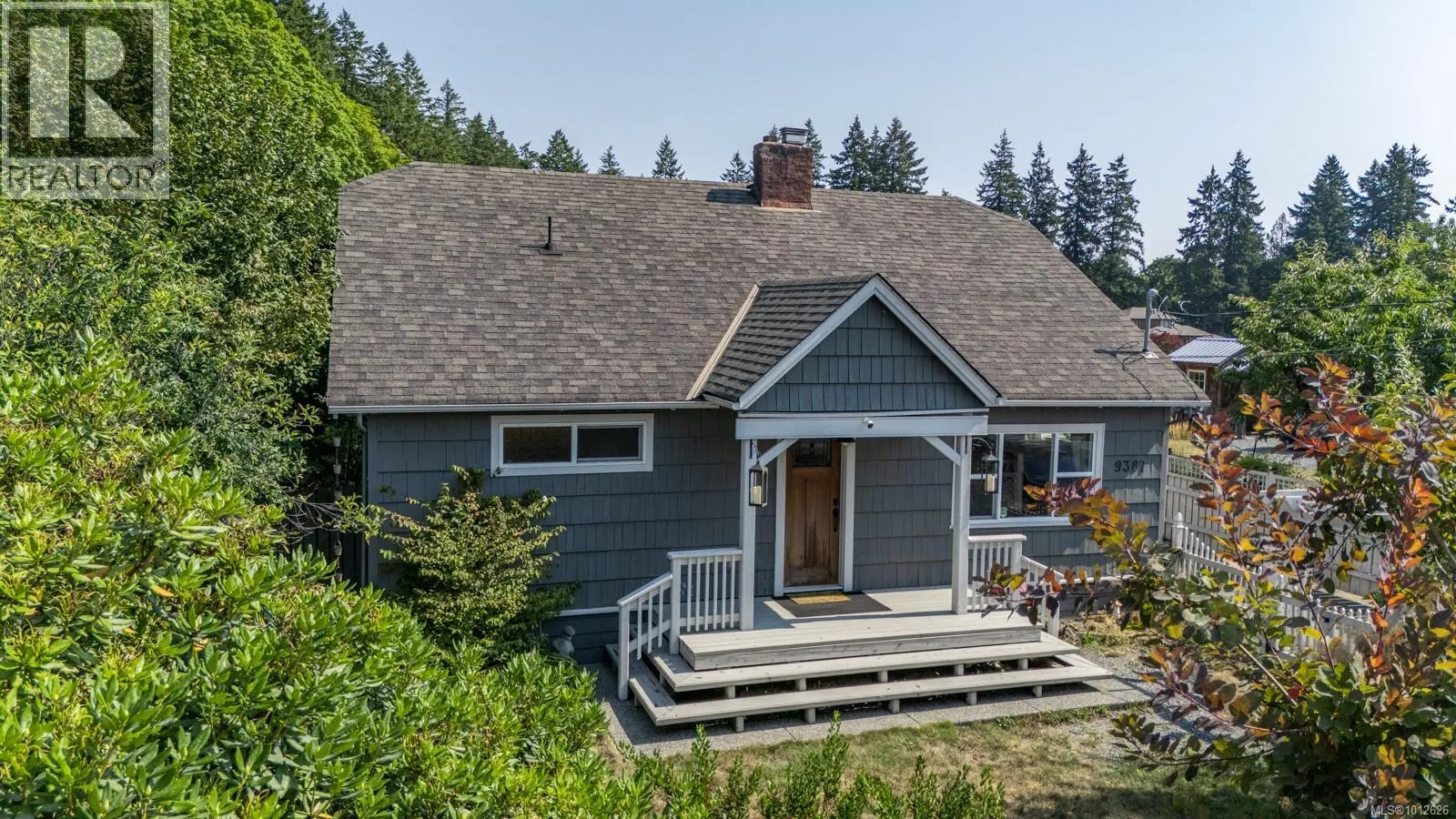 Welcome to 9387 Chemainus Road, a charming 3-bedroom, 1-bath home on a spacious 7,405 sq ft lot backing onto a private acreage for a peaceful setting. The inviting living room with a cozy gas fireplace flows into the bright kitchen with eating nook, leading to a sunroom and covered patio overlooking the large backyard. A 4-piece bath with soaker tub, office area, and primary bedroom with its own covered patio complete the main floor. Upstairs offers two bedrooms and an electric fireplace for warmth and character. Outside, enjoy a detached workshop and ample space for hobbies or storage. With multiple patio areas, a generous yard, and backing onto nature, this property is perfect for those who value indoor-outdoor living. Efficiently heated and cooled with a heat pump, this home combines comfort, charm, and privacy in the heart of Chemainus. (id:27476)