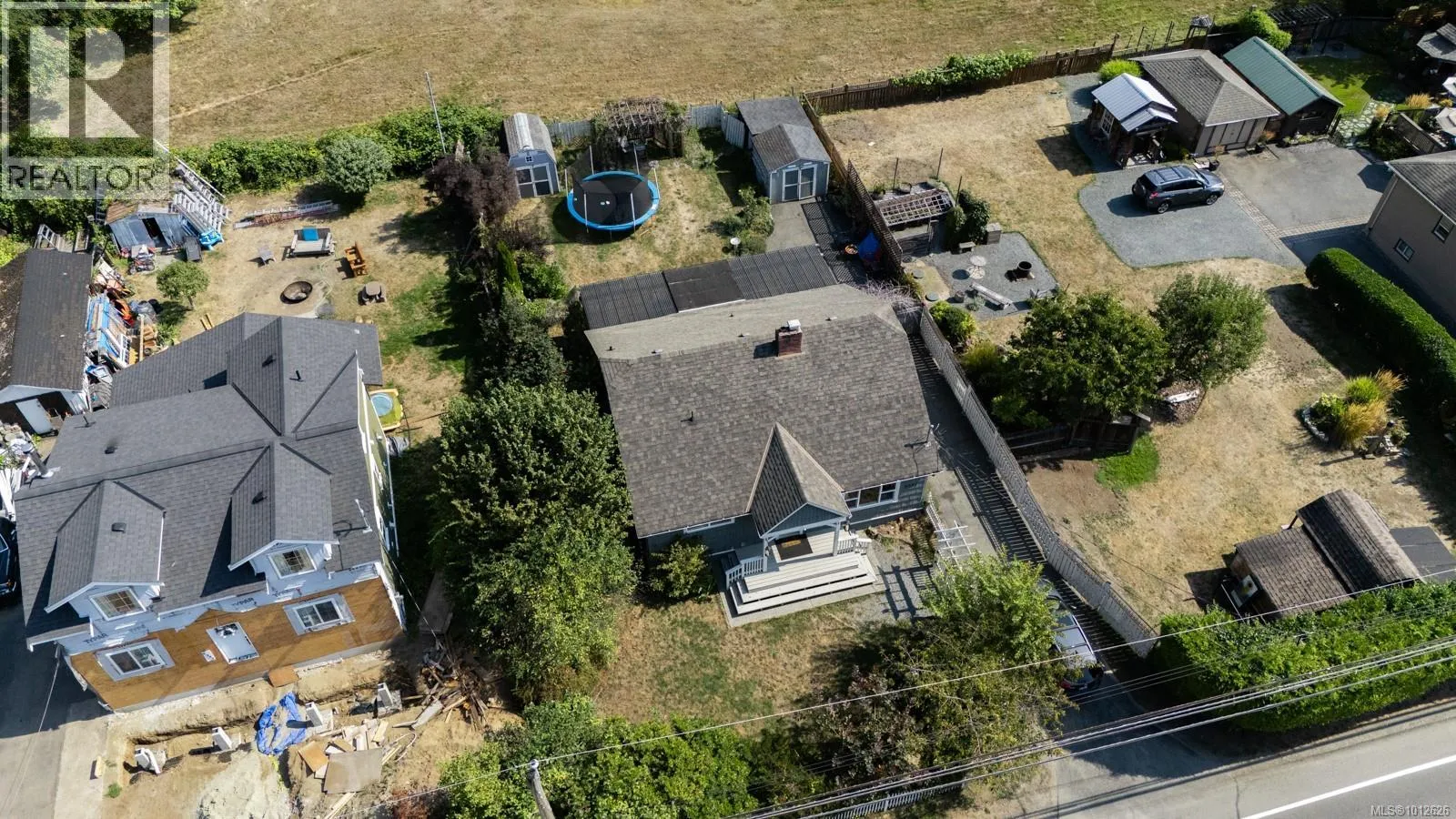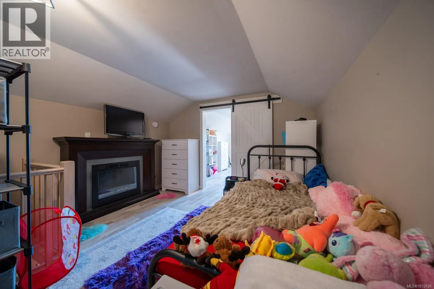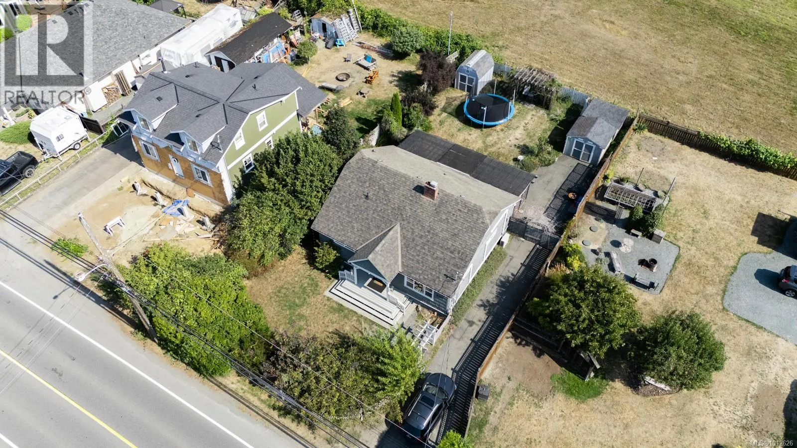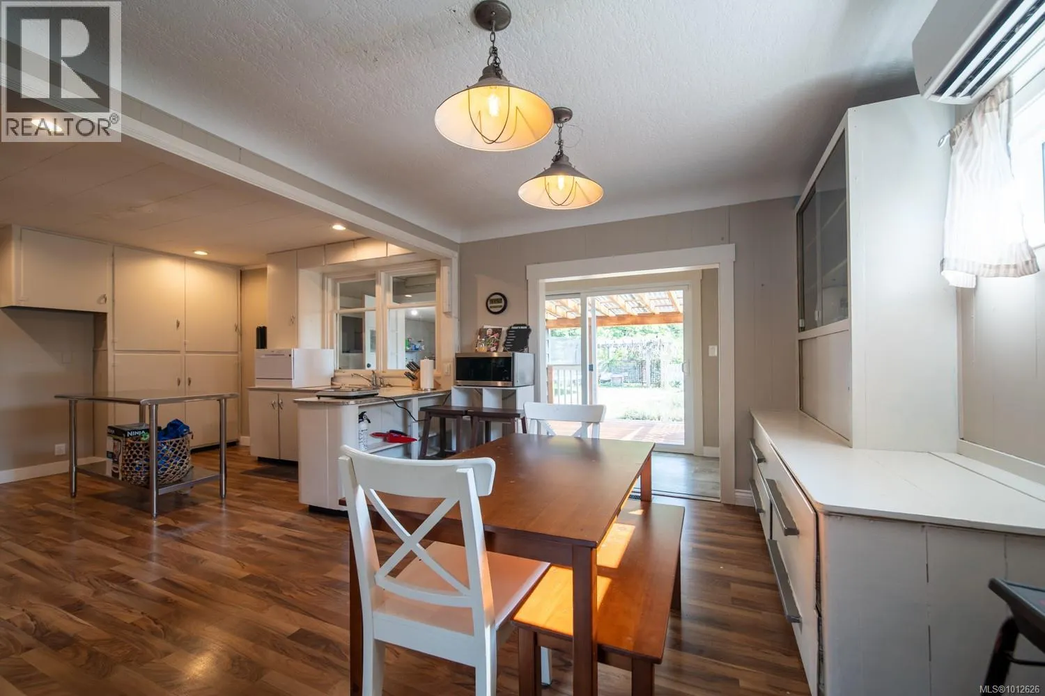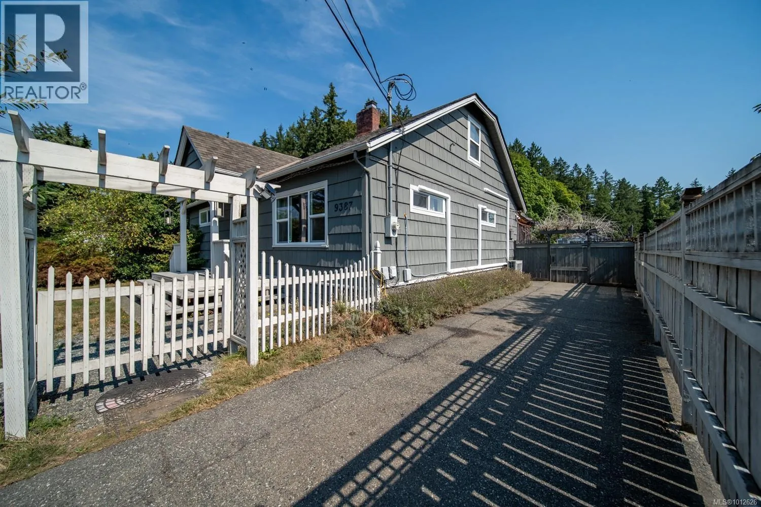 Welcome to 9387 Chemainus Road, a charming 3-bedroom, 1-bath home on a spacious 7,405 sq ft lot backing onto a private acreage for a peaceful setting. The inviting living room with a cozy gas fireplace flows into the bright kitchen with eating nook, leading to a sunroom and covered patio overlooking the large backyard. A 4-piece bath with soaker tub, office area, and primary bedroom with its own covered patio complete the main floor. Upstairs offers two bedrooms and an electric fireplace for warmth and character. Outside, enjoy a detached workshop and ample space for hobbies or storage. With multiple patio areas, a generous yard, and backing onto nature, this property is perfect for those who value indoor-outdoor living. Efficiently heated and cooled with a heat pump, this home combines comfort, charm, and privacy in the heart of Chemainus. (id:27476)