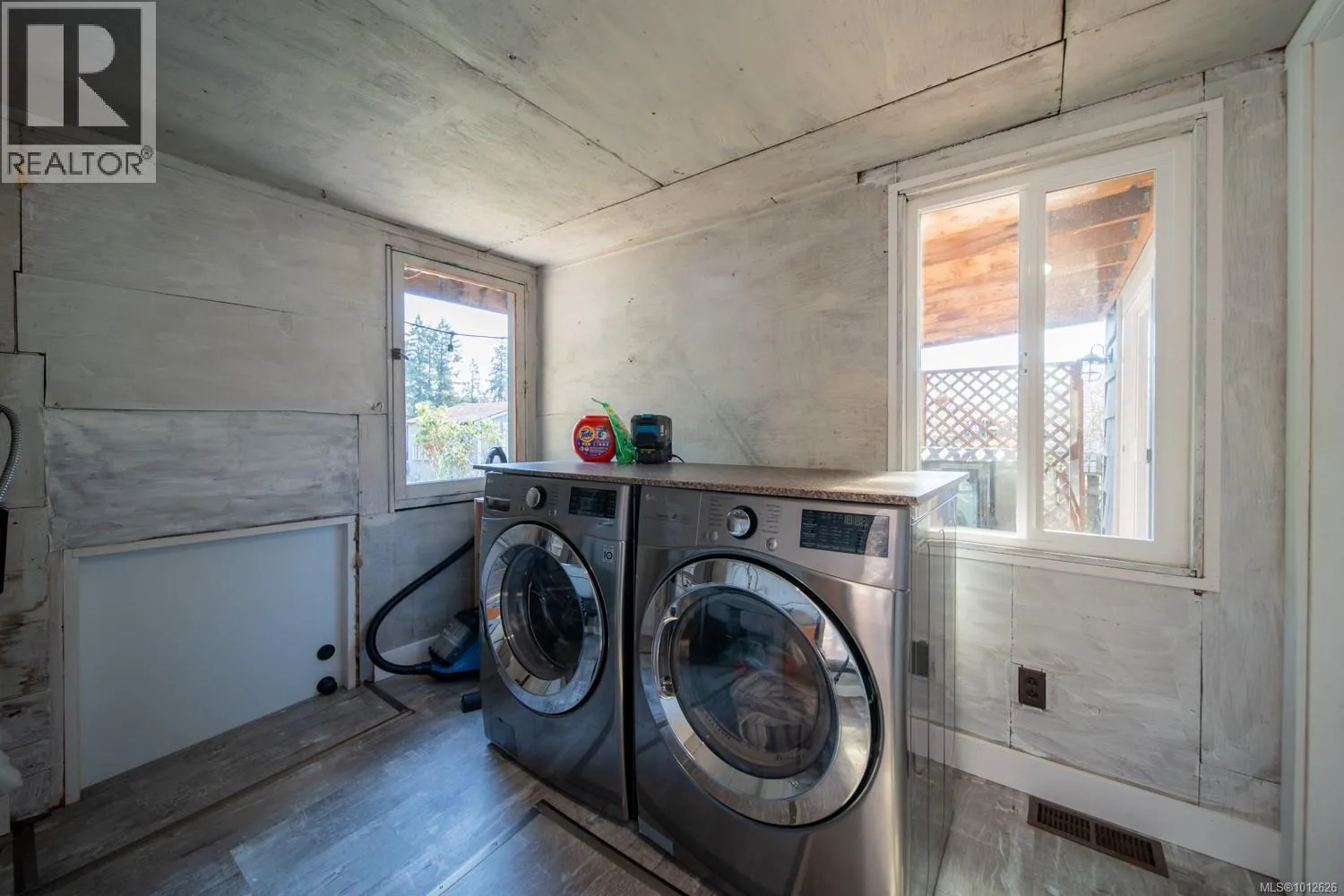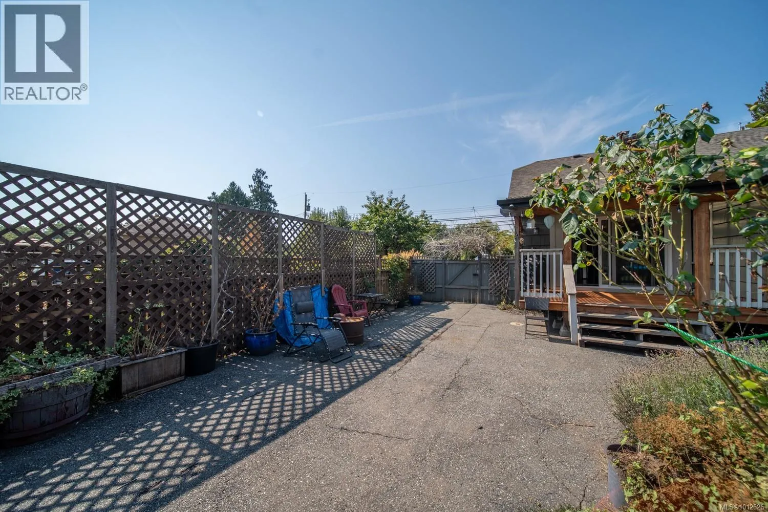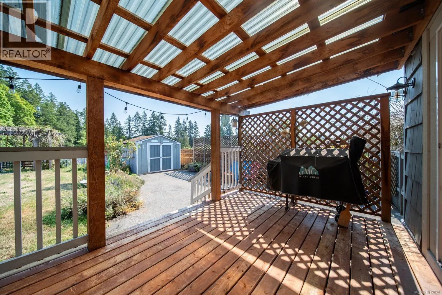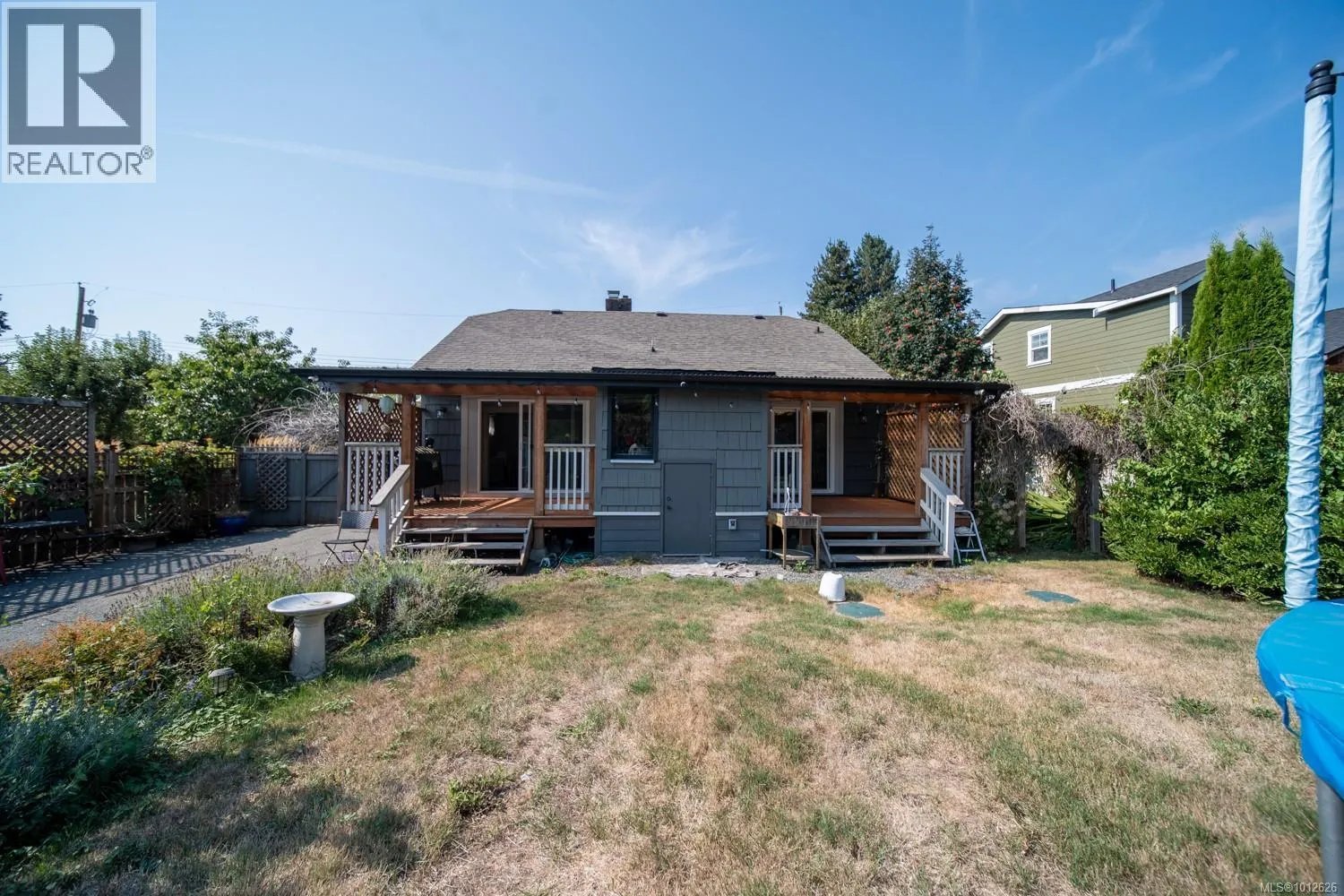 Welcome to 9387 Chemainus Road, a charming 3-bedroom, 1-bath home on a spacious 7,405 sq ft lot backing onto a private acreage for a peaceful setting. The inviting living room with a cozy gas fireplace flows into the bright kitchen with eating nook, leading to a sunroom and covered patio overlooking the large backyard. A 4-piece bath with soaker tub, office area, and primary bedroom with its own covered patio complete the main floor. Upstairs offers two bedrooms and an electric fireplace for warmth and character. Outside, enjoy a detached workshop and ample space for hobbies or storage. With multiple patio areas, a generous yard, and backing onto nature, this property is perfect for those who value indoor-outdoor living. Efficiently heated and cooled with a heat pump, this home combines comfort, charm, and privacy in the heart of Chemainus. (id:27476)