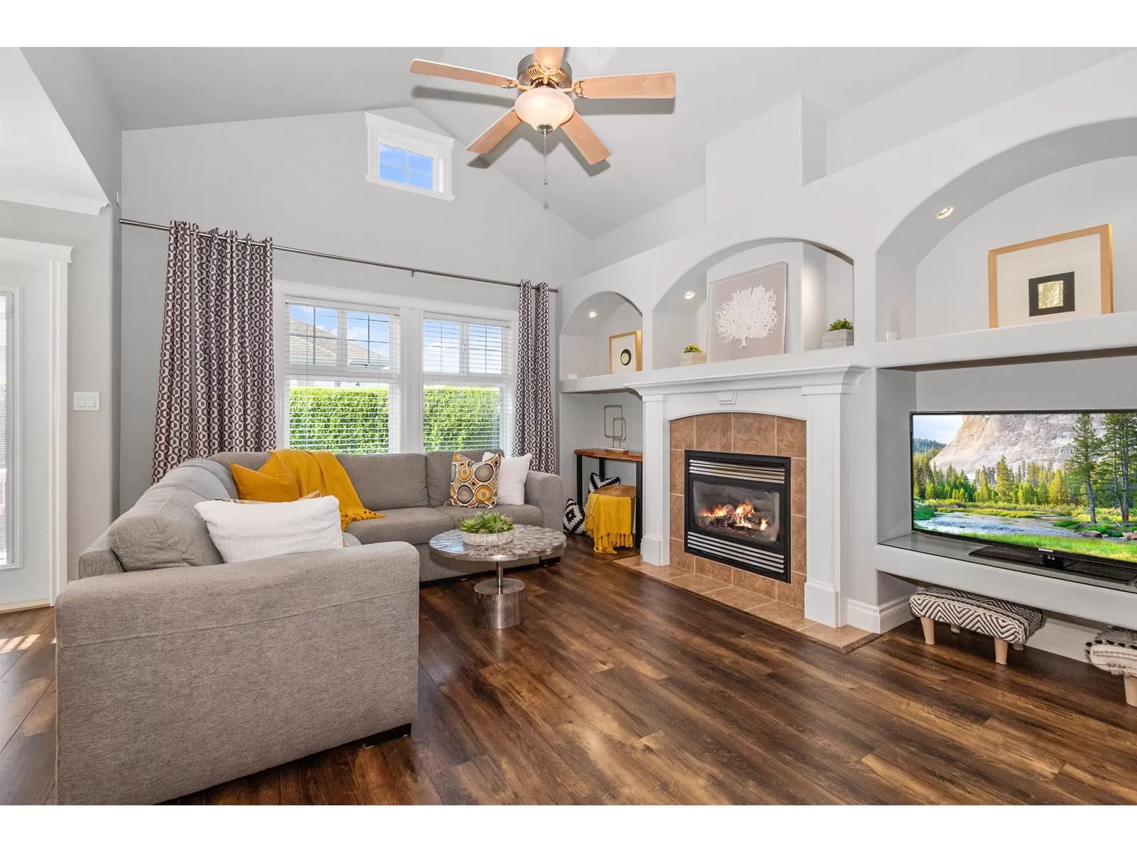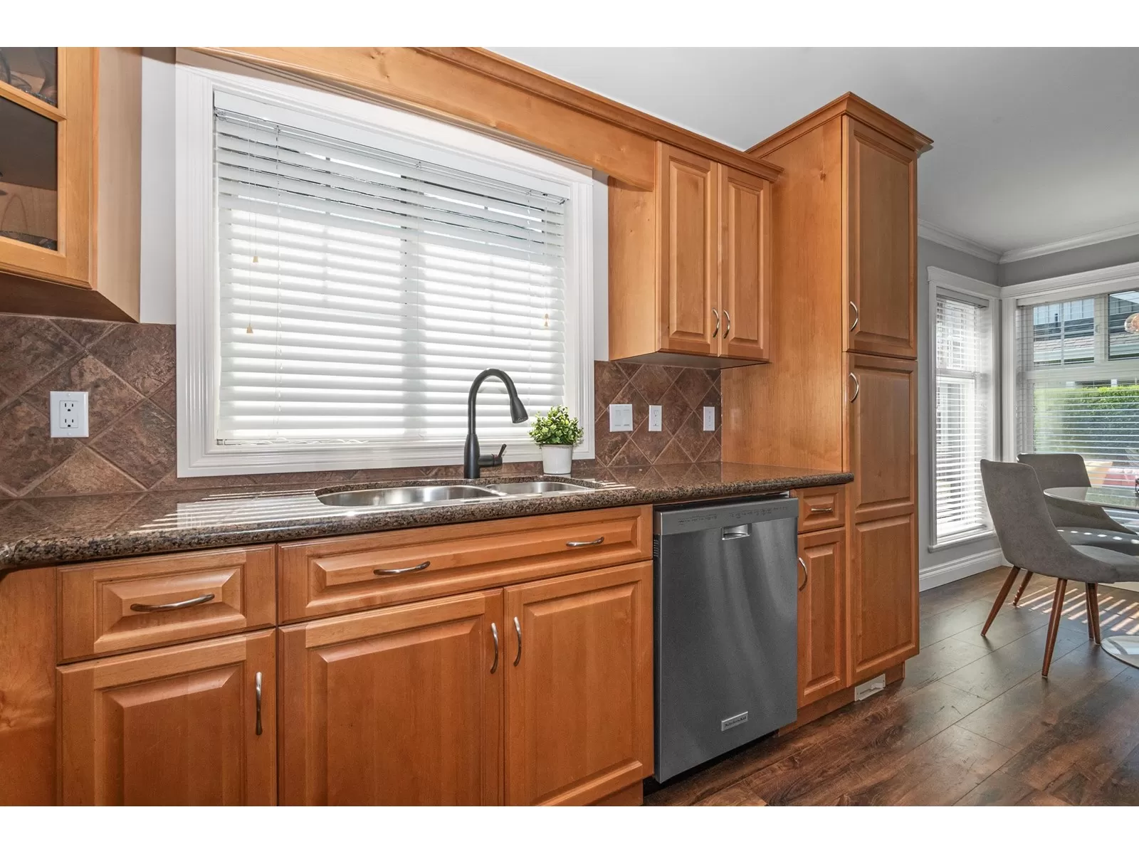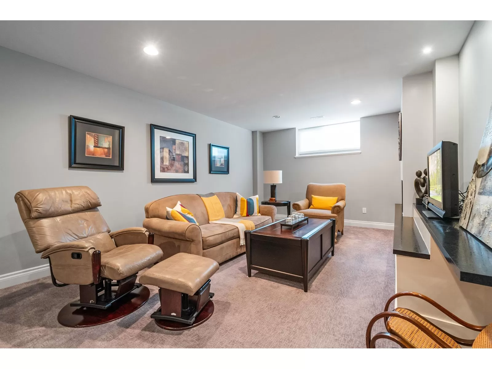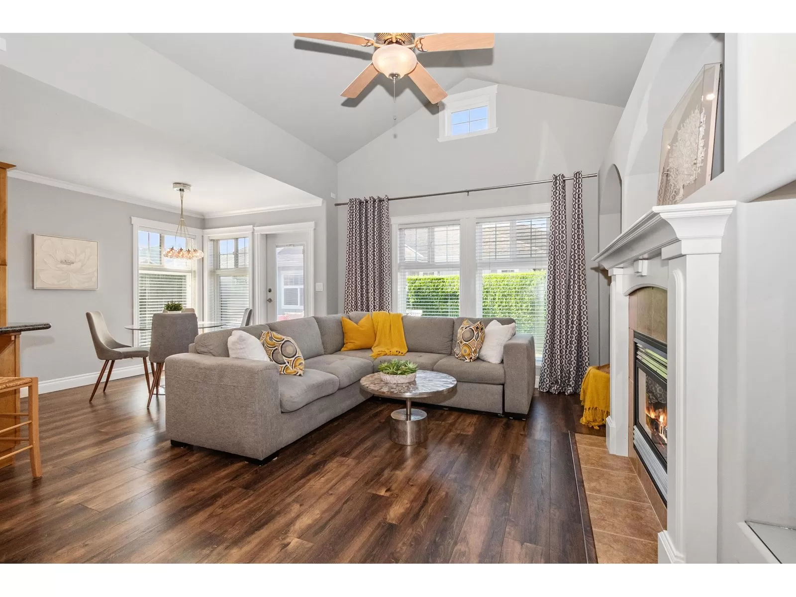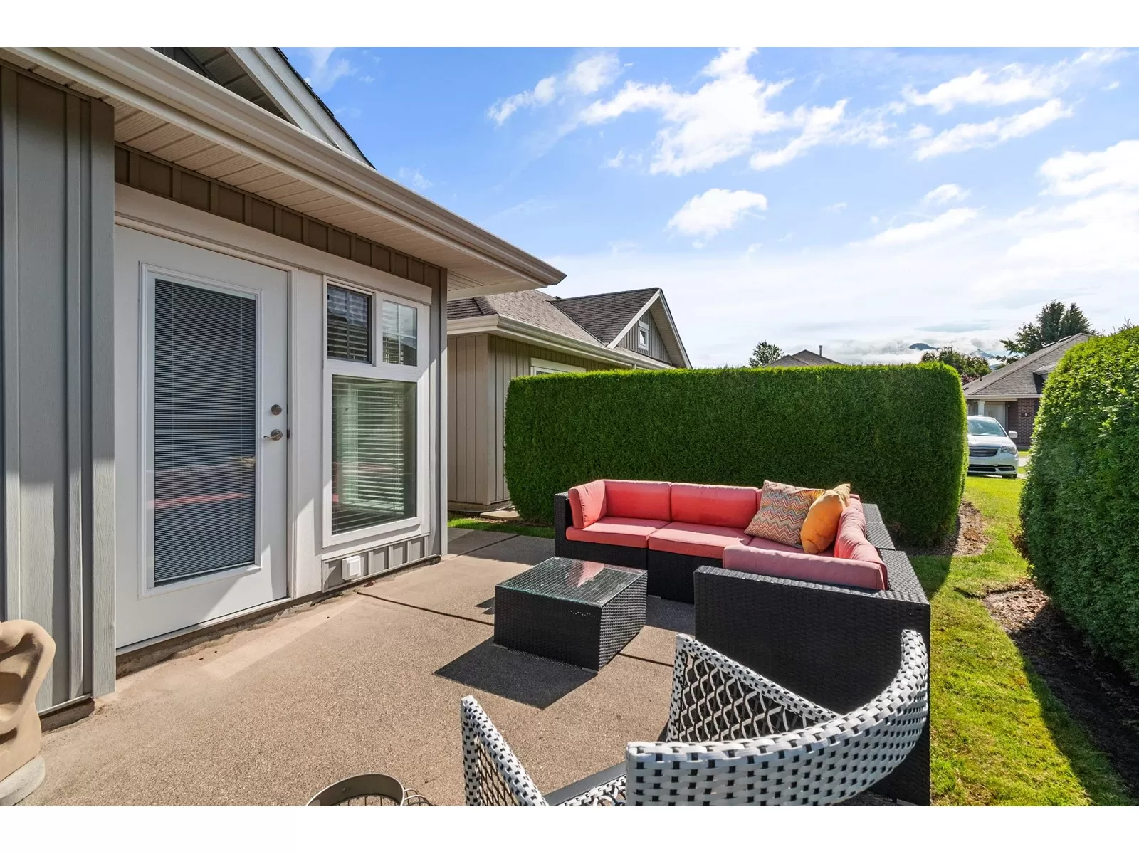 Welcome to Stevenson Villas, gated 55+ community in the heart of Sardis. This well-kept 2Bed + Den, 3 Bath Rancher w/full bsmt offers a smart layout & rare combo of space, style & privacy. Cozy den (w gas FP) just off entry; perfect for office or flex. The main living area feat vaulted ceilings, dark wood flrs & welcoming family rm w/gas FP & custom built-ins. The kitchen has maple cabs, granite counters & SS appls, flowing into a bright eat-in area. The formal dining rm is a rare find in this complex. The primary suite located on the main flr. Downstairs, the finished bsmt incl lrg rec rm (w/FP), 2nd bdrm, full bath & unfin storage space, workshop, gym or more Bdrms. Enjoy a private yard backing greenspace. The oversized dbl garage incls a workspace. Strata $408.45/mo, 1 pet ok. (id:27476)