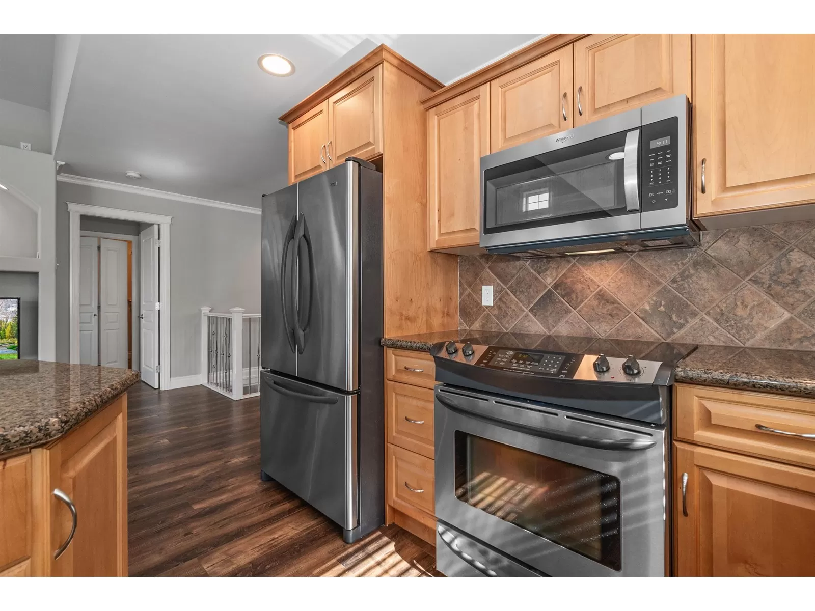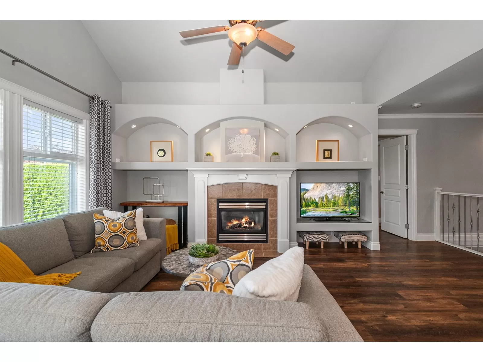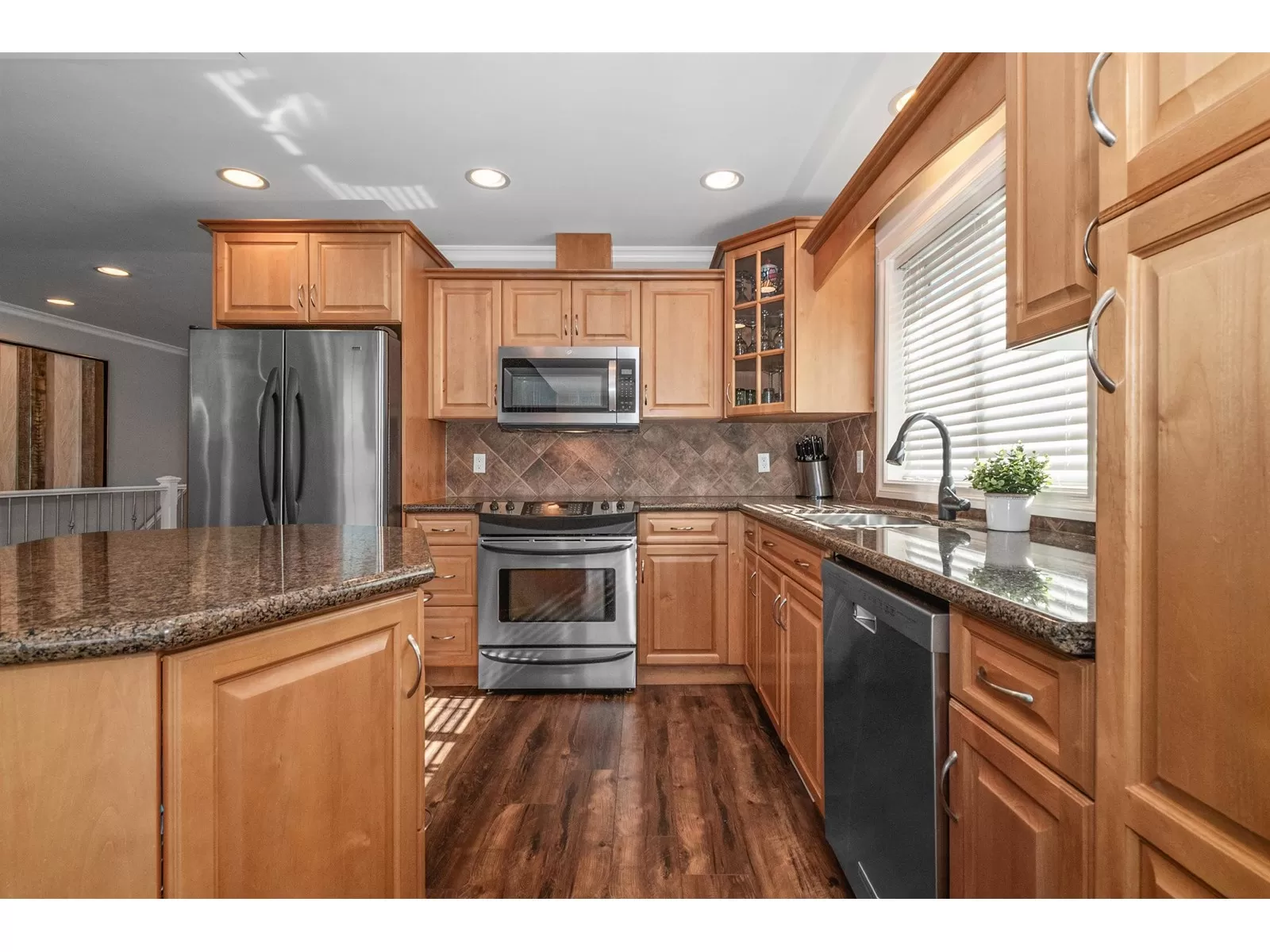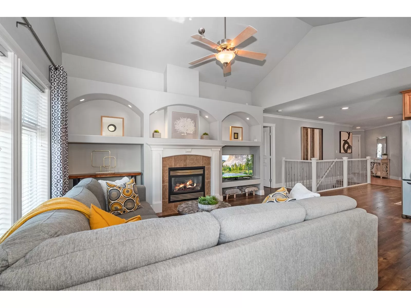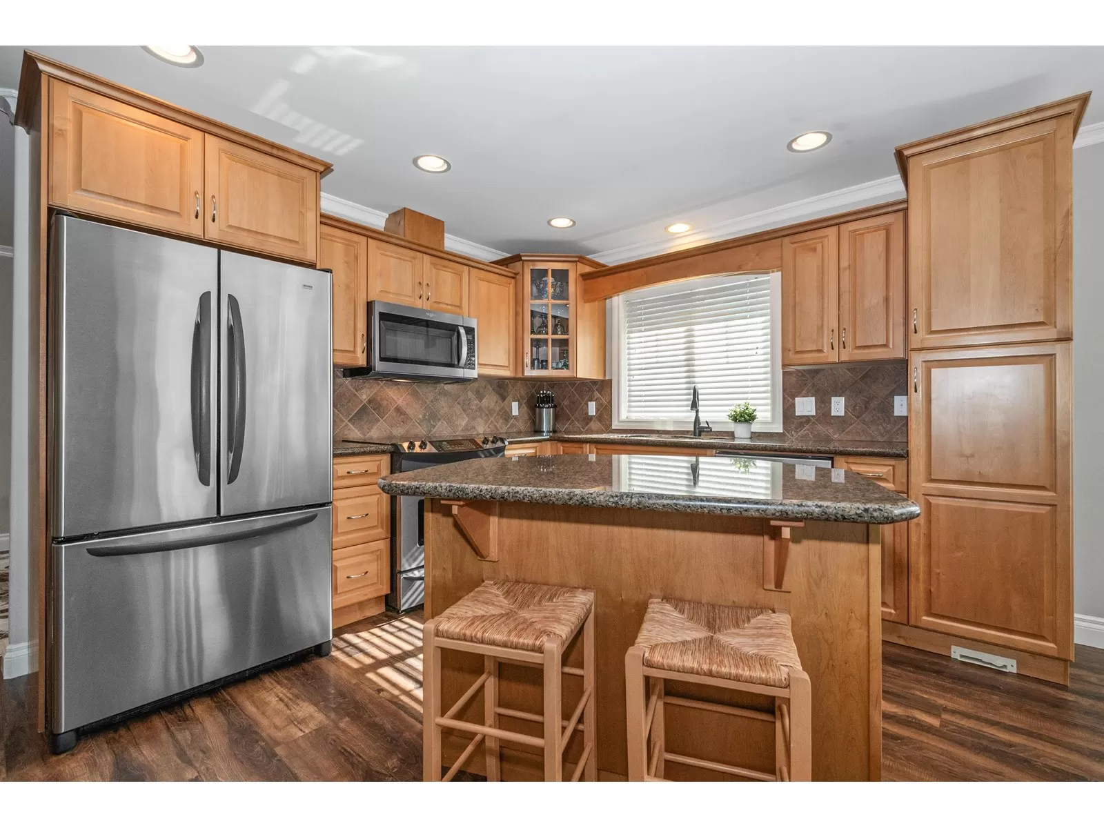 Welcome to Stevenson Villas, gated 55+ community in the heart of Sardis. This well-kept 2Bed + Den, 3 Bath Rancher w/full bsmt offers a smart layout & rare combo of space, style & privacy. Cozy den (w gas FP) just off entry; perfect for office or flex. The main living area feat vaulted ceilings, dark wood flrs & welcoming family rm w/gas FP & custom built-ins. The kitchen has maple cabs, granite counters & SS appls, flowing into a bright eat-in area. The formal dining rm is a rare find in this complex. The primary suite located on the main flr. Downstairs, the finished bsmt incl lrg rec rm (w/FP), 2nd bdrm, full bath & unfin storage space, workshop, gym or more Bdrms. Enjoy a private yard backing greenspace. The oversized dbl garage incls a workspace. Strata $408.45/mo, 1 pet ok. (id:27476)