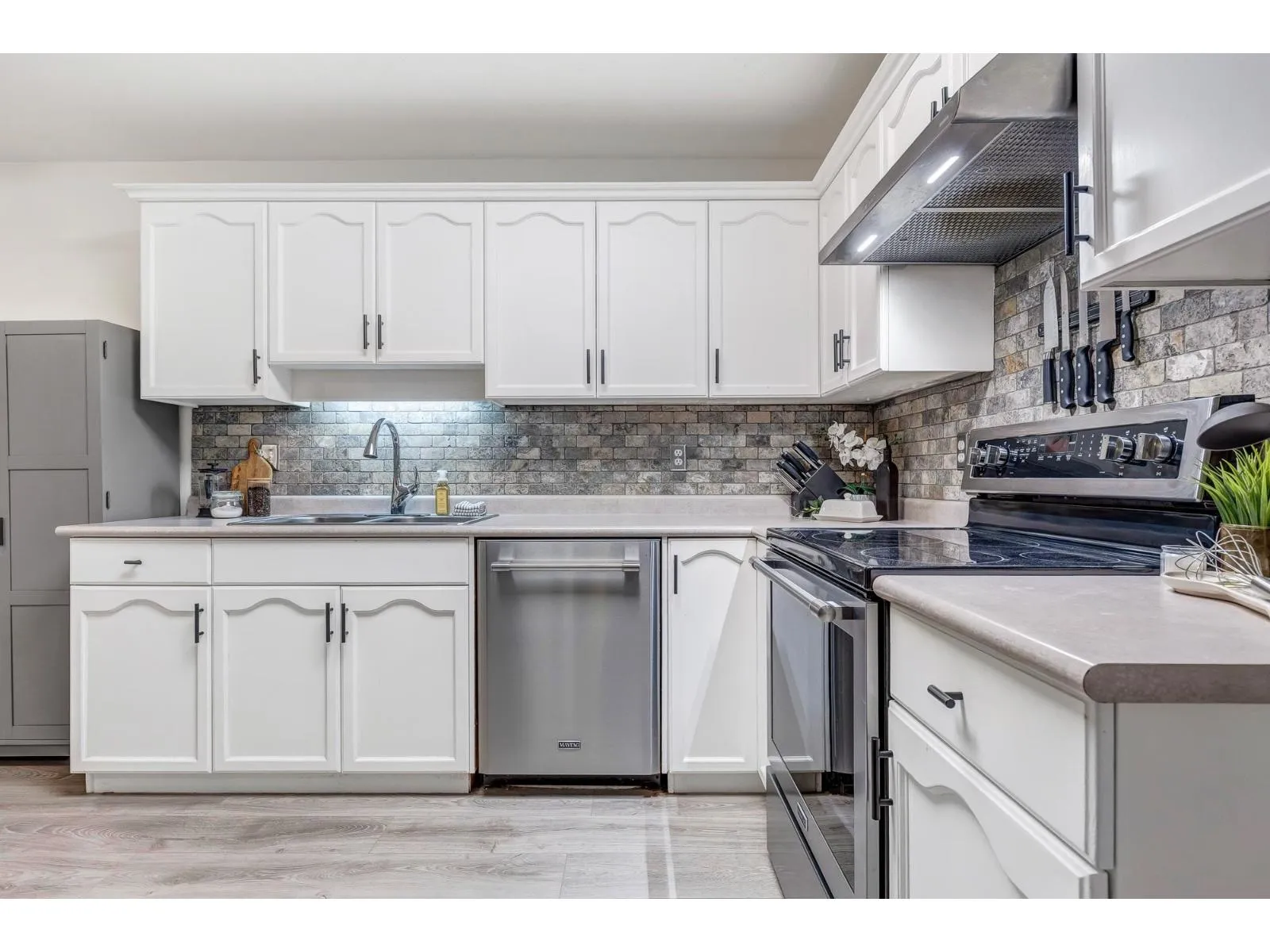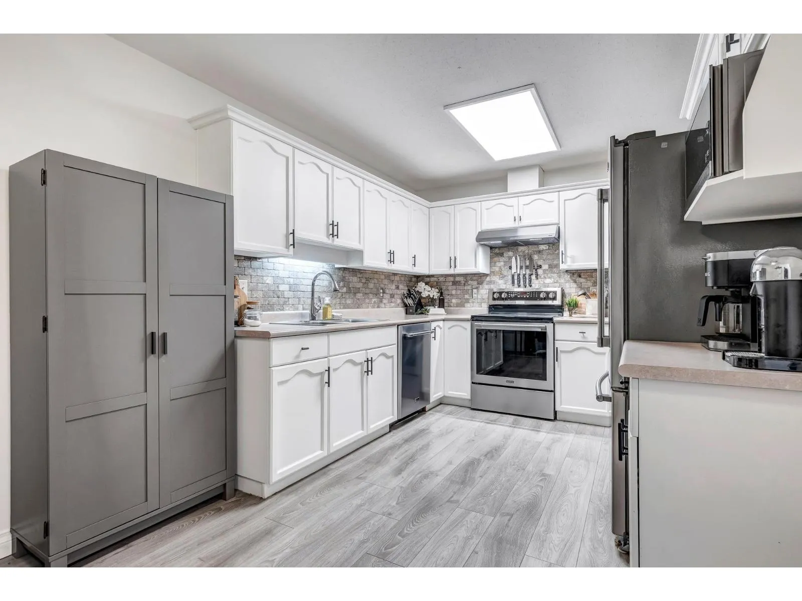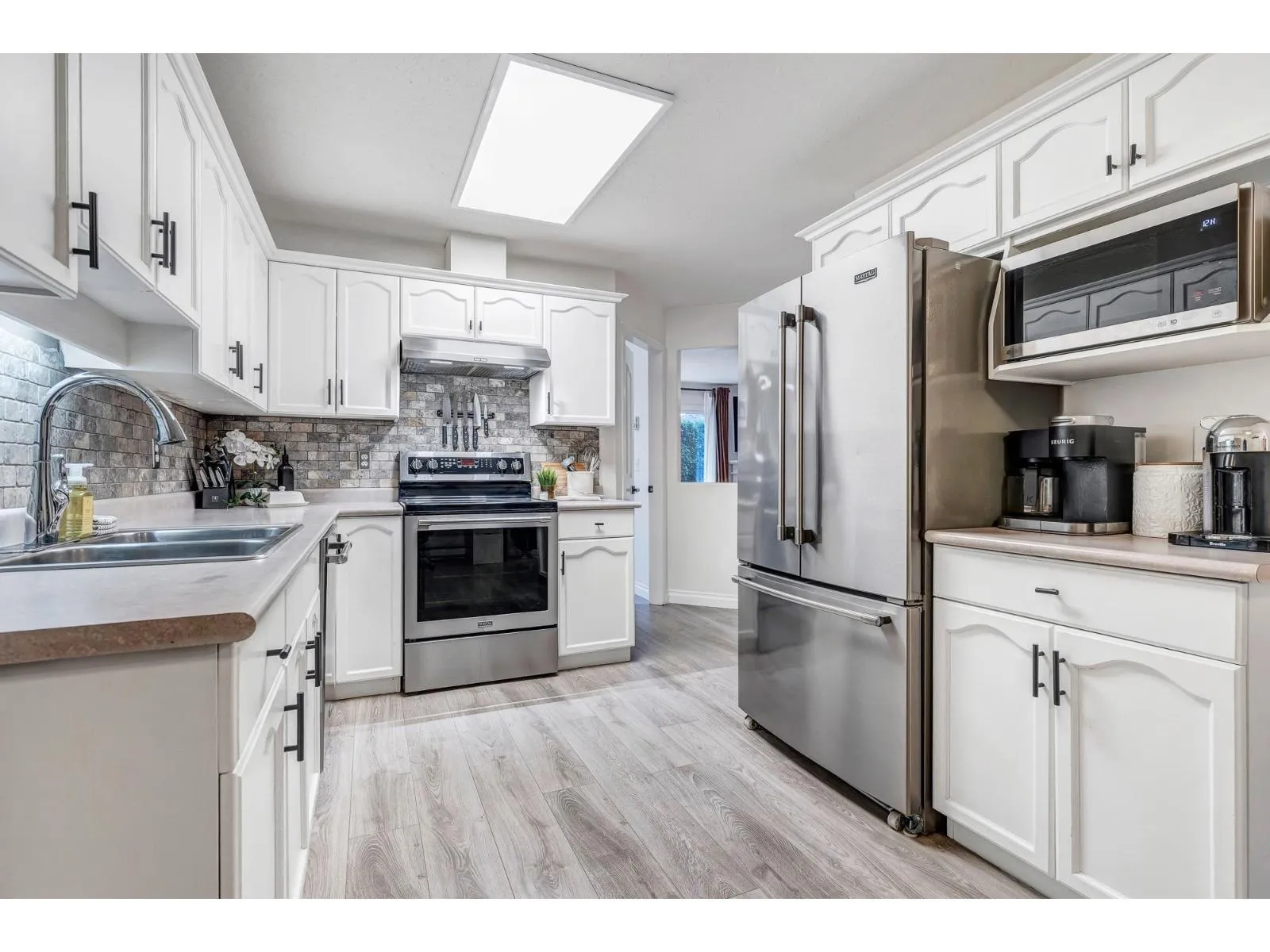 CHARMING 2 bed, 2 bath townhouse in a PRIME location - close to schools, transit, shopping AND MORE! This lovely unit boasts a FABULOUS layout w/laminate flooring and AMPLE natural light throughout! The pristine kitchen features nice white cabinets, chic tiled backsplash, stainless steel appliances, and TONS of room to cook OR entertain! The cozy living area has easy access to the back patio area and a gas f/p - not to mention, a generous dining area. Enjoy the stylish master bedroom w/grey wainscoting, large windows for extra daylight, and a 2 pc ensuite! Followed by another sizable bedroom, full 4 pc bath, large laundry room w/b.i. shelving, newer washer and dryer, AND room for storage! Don't let this one get away from you - book your showing today! * PREC - Personal Real Estate Corporation (id:27476)