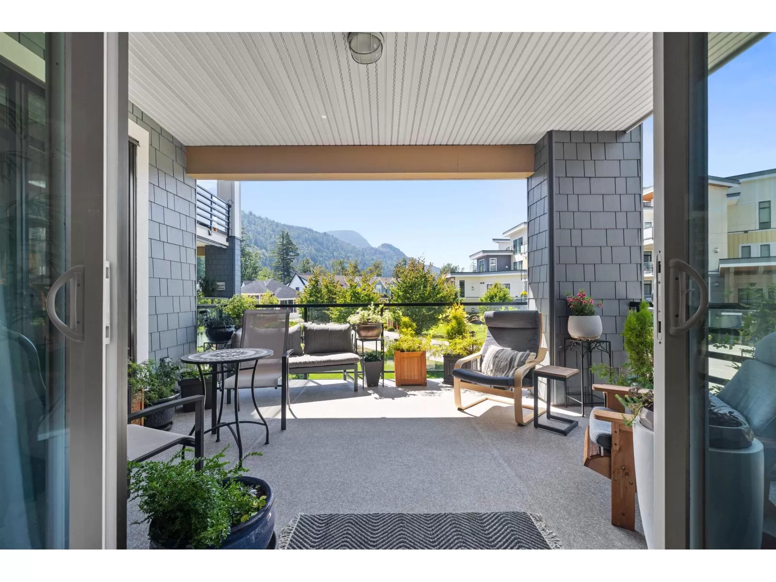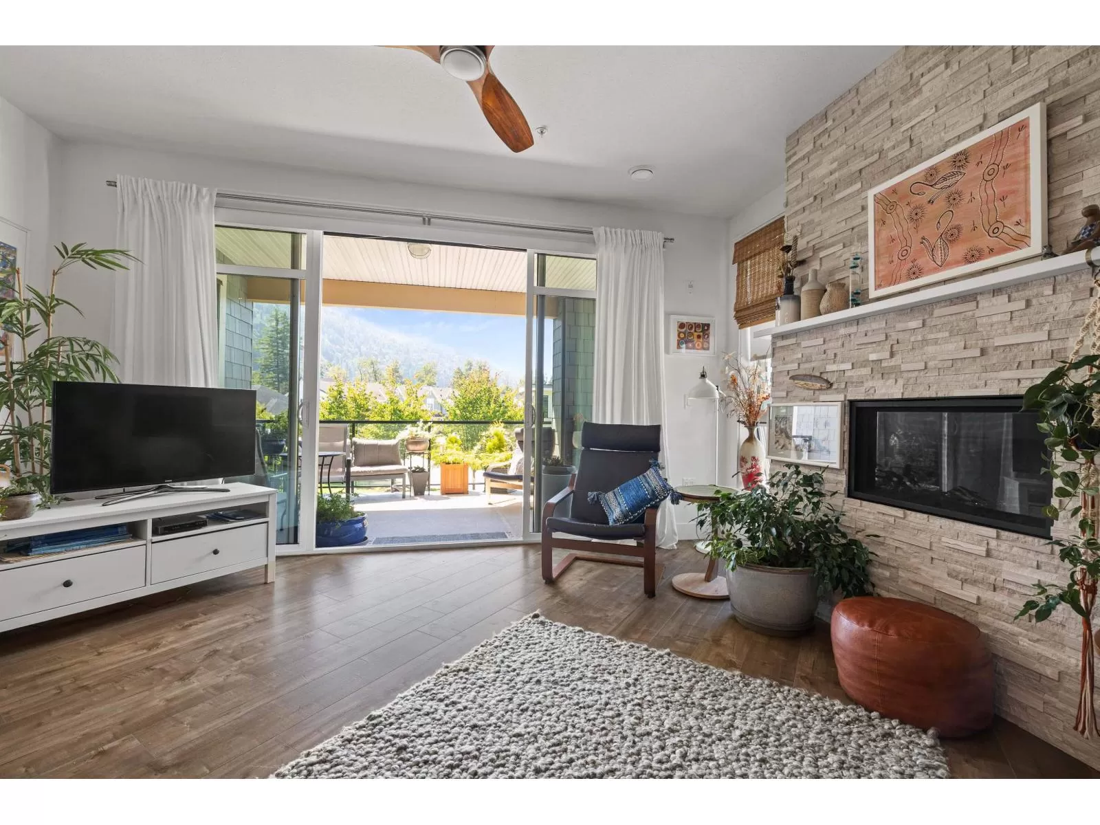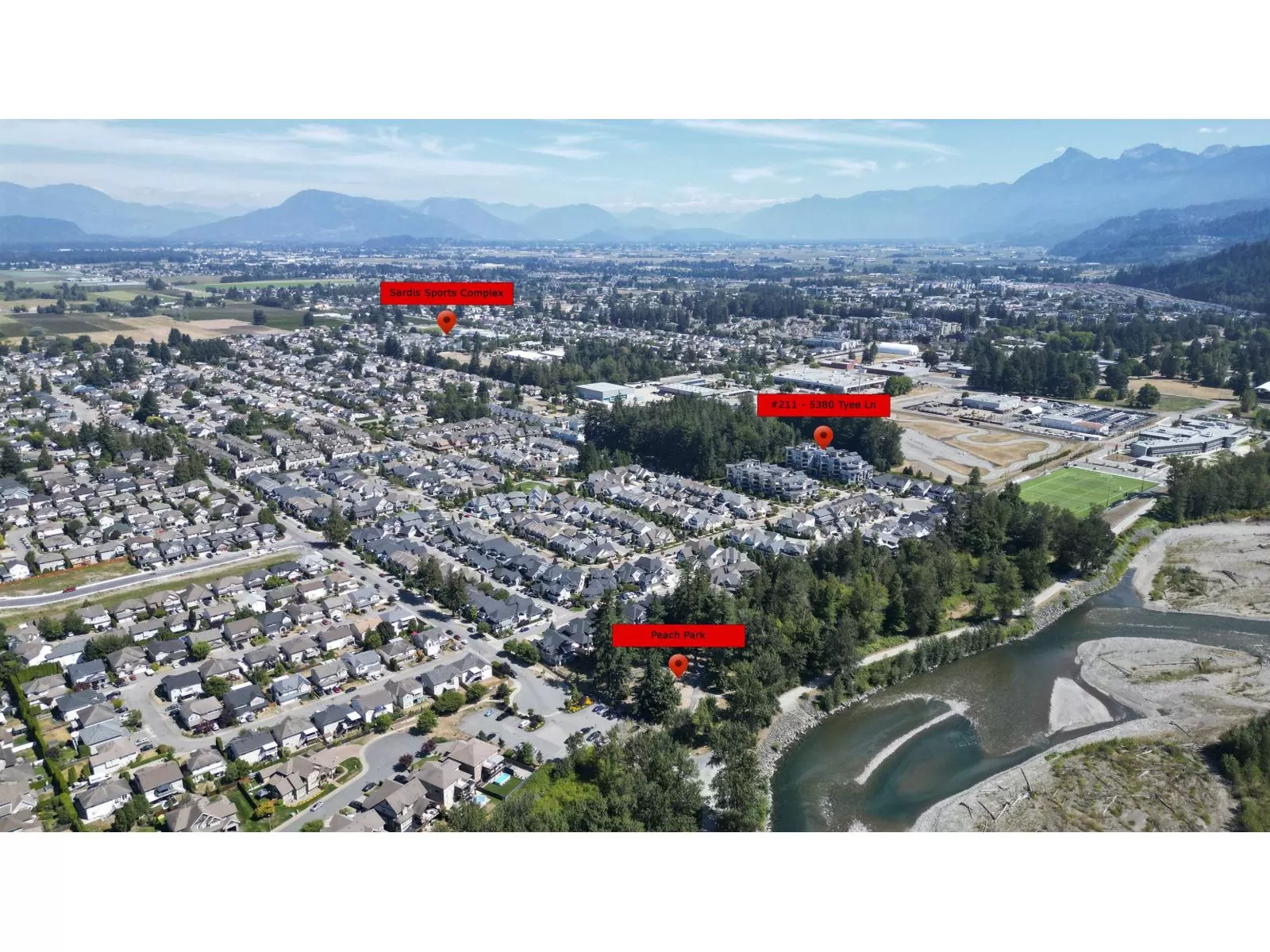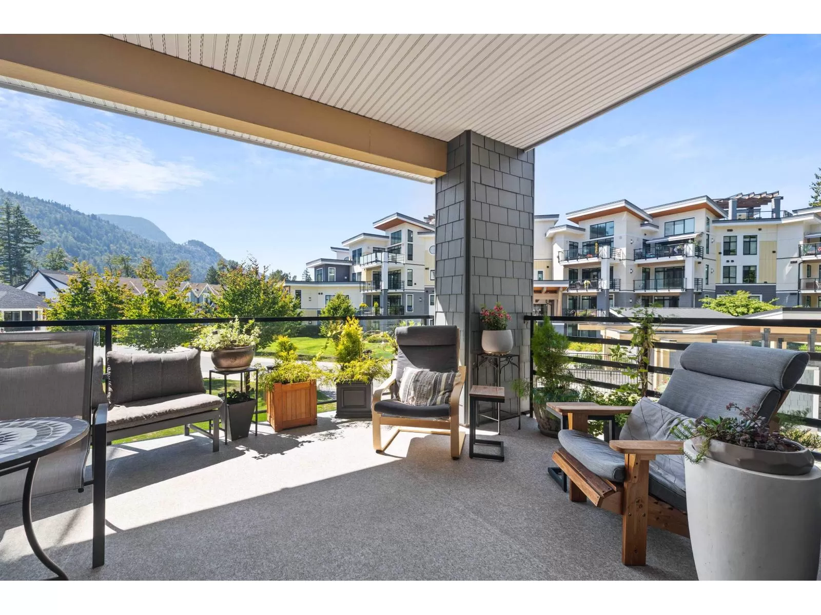 Flooded w/natural light, southern exposure, gorgeous oversized deck highlighting the sweeping views & a short 3 min walk to the Vedder River, you do not want to miss this stunning 1 bed, 1.5 bath & DEN condo w/1,082 sq ft in the coveted Rivers Edge neighborhood. Stunning finishes, airy feel, full laundry room, expansive kitchen, quartz countertops, black Kitchen Aid s/s appliances, gas stove, A/C, gas f/p, dining area & spacious living room taking advantage of the views. Enjoy easy living in this prime neighborhood where you can enjoy evening walks plus proximity to Garrison for shopping, restaurants & groceries. Pet friendly w/no size restrictions for dogs, low monthly strata fee, secured underground parking, visitor parking & storage locker; make this stunning condo your new home! (id:27476)