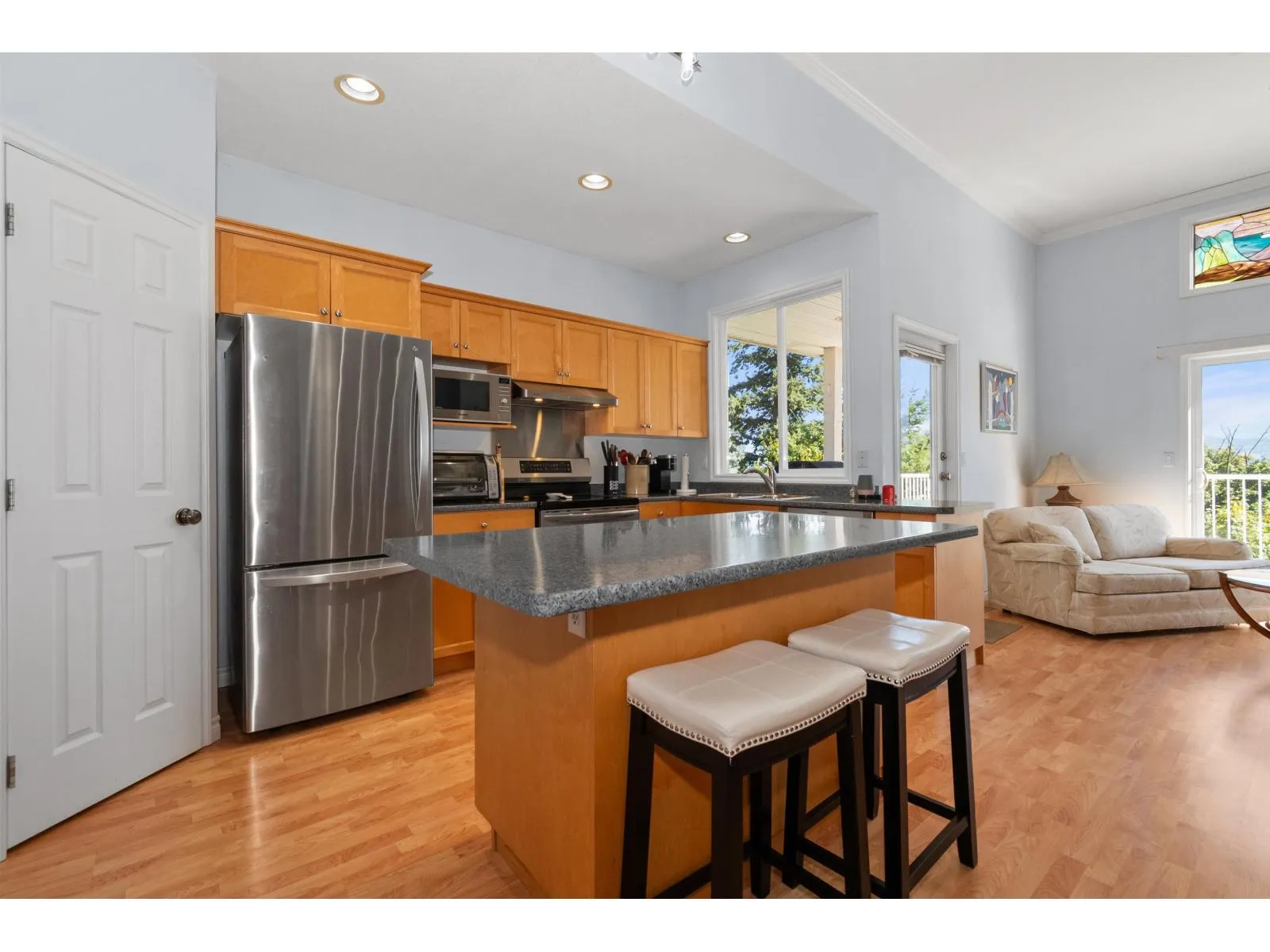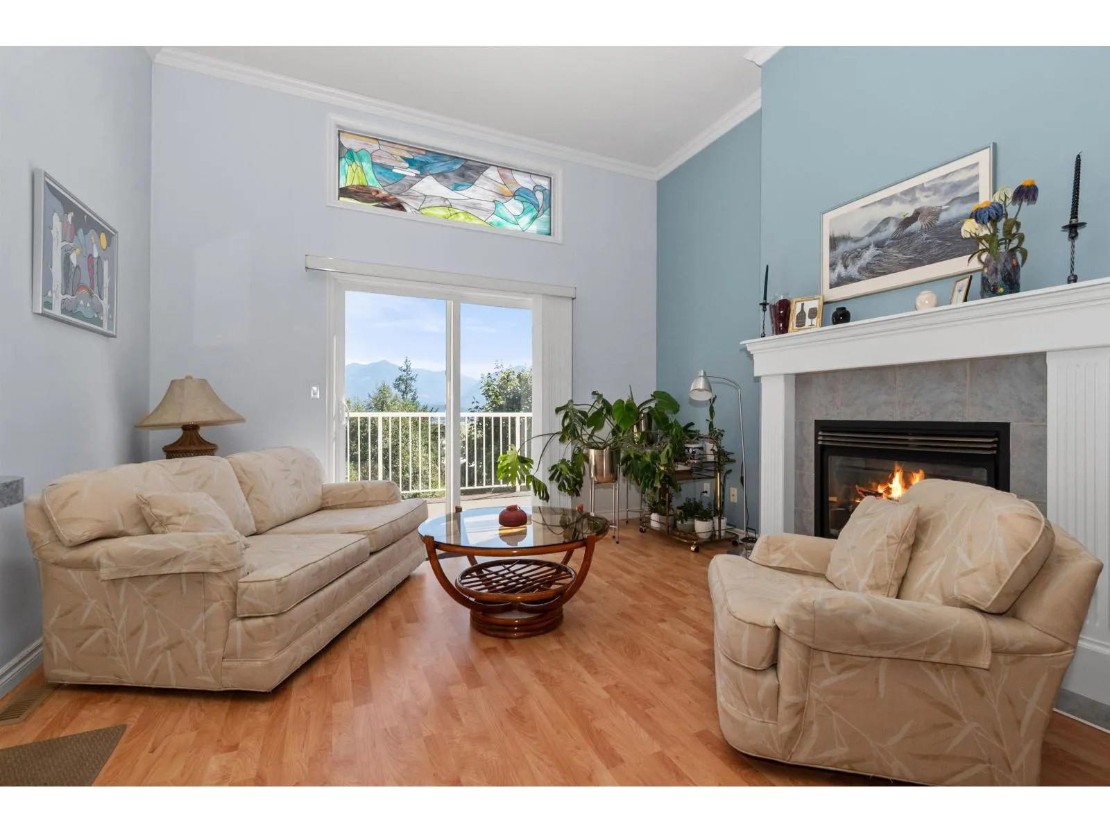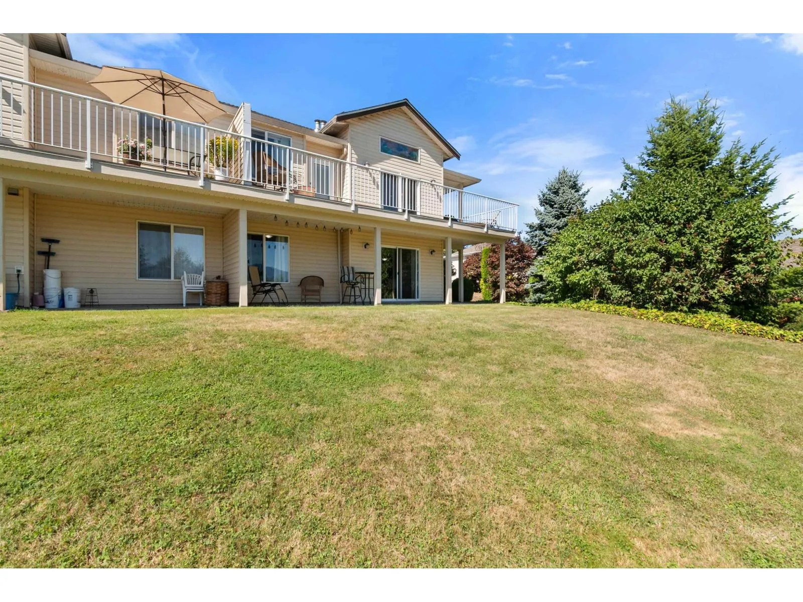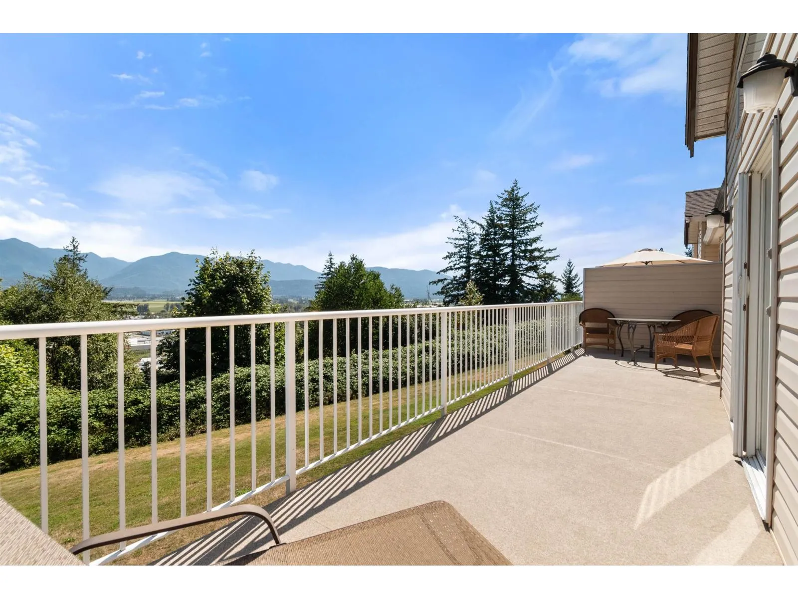 Unparalleled valley views, backing onto treed greenspace, and it is an end unit! This 3-bedroom rancher with a walk-out basement is in one of the best locations on Chilliwack Mountain. Bright and welcoming with large windows, a level entry main floor, well-appointed kitchen that flows into the eating area and south-facing living room with 11' ceilings and stunning views. The main floor also includes a spacious primary bedroom with 3-piece ensuite, plus a second bedroom/den. Downstairs offers a large rec room, third bedroom and bath, plus a finished bunker under the garage, ideal for hobby room or workshop. Enjoy two private decks with unobstructed views, a double garage, and no neighbor's behind. A rare opportunity in a peaceful, sought-after setting! RV parking is available! (id:27476)