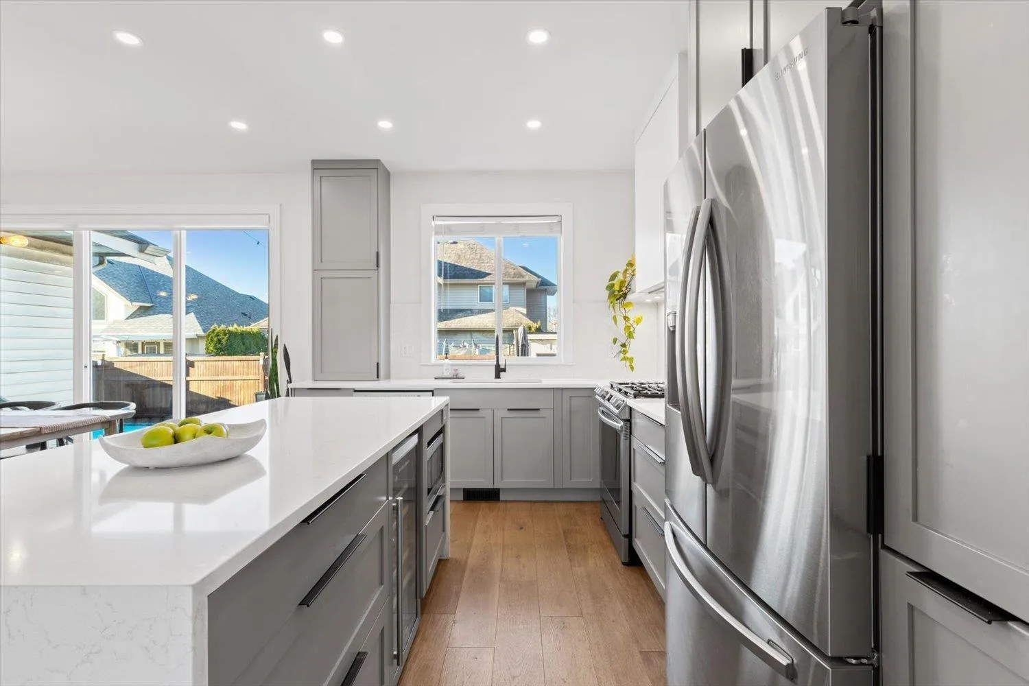 This 5-bed, 4-bath gem offers the PERFECT blend of STYLE and functionality. The primary bedroom is conveniently located on the MAIN floor, paired with a CUSTOM kitchen featuring sleek countertops, modern appliances, and an open-concept layout that flows seamlessly into the living and dining areas. Hardwood flooring Uo the main and top floors adds a touch of elegance to every space. Outside is your private oasis with a 7-ft fence for extra privacy, a salt water in-ground pool, hot tub, stamped concrete+ turf; perfect for entertaining or relaxing year-round. The basement includes two large rec rooms, 1 of the bdrms, + a WET BAR, which could easily be converted into an in-law suite. LOCATED just a short walk from all schools K-12, Sardis Park, Kinkora golf course+ more! BOOK your tour NOW! (id:27476)
