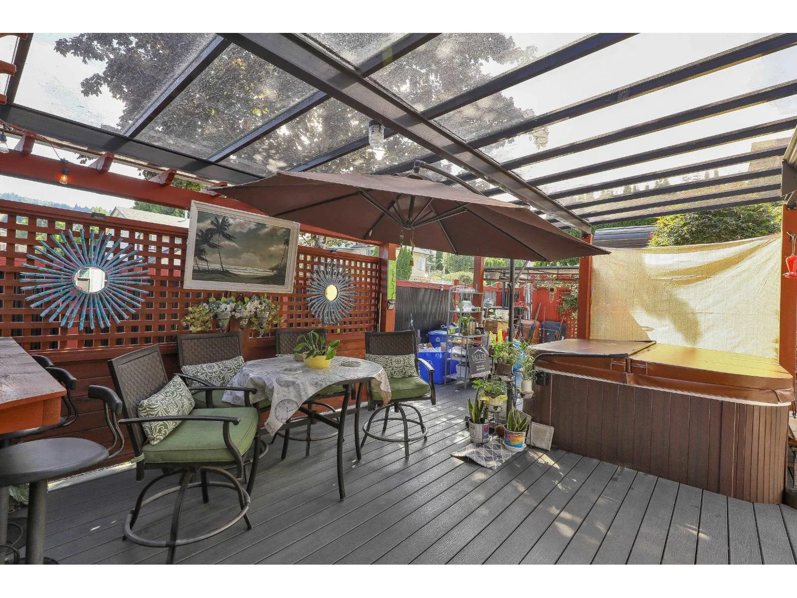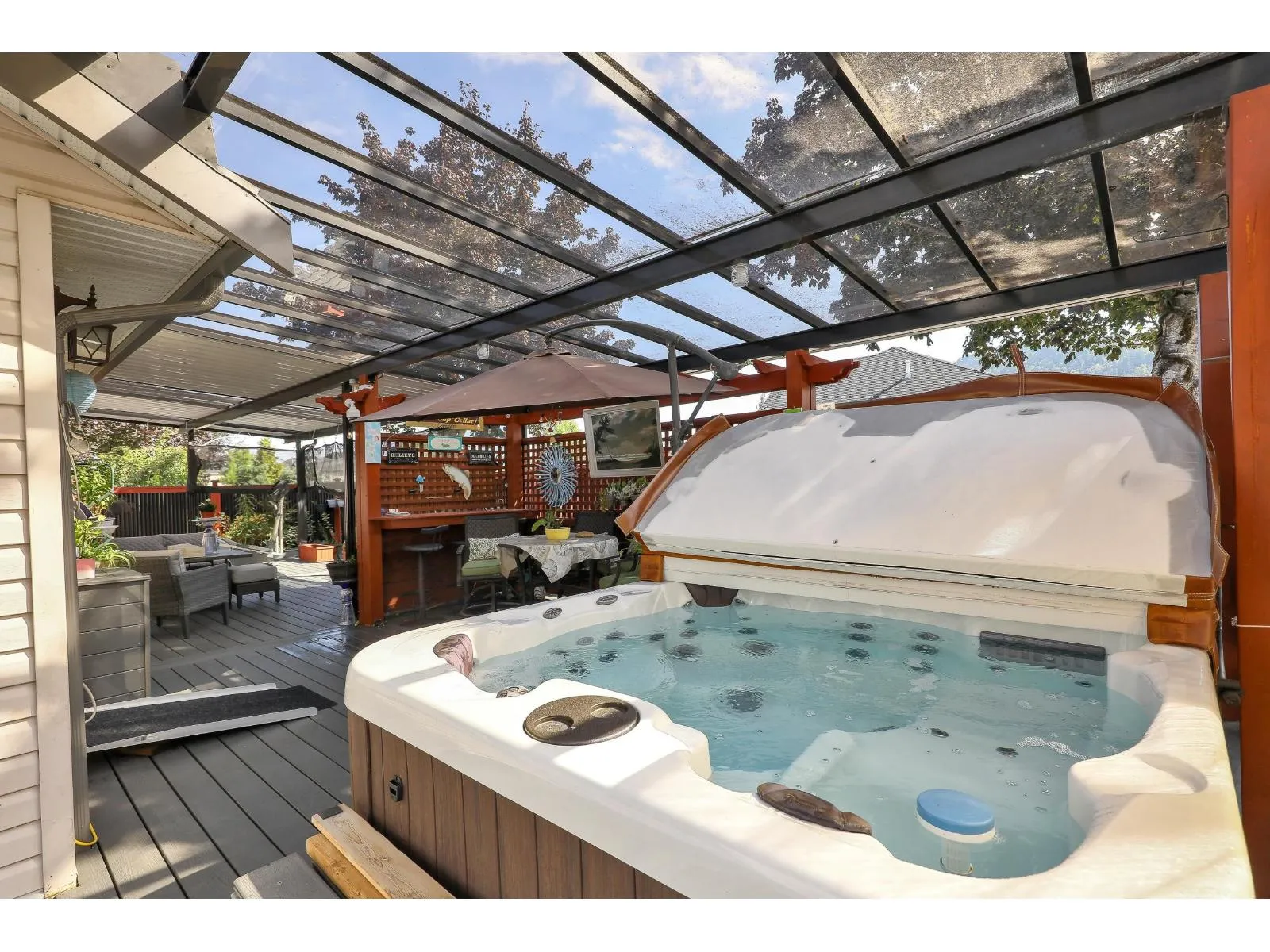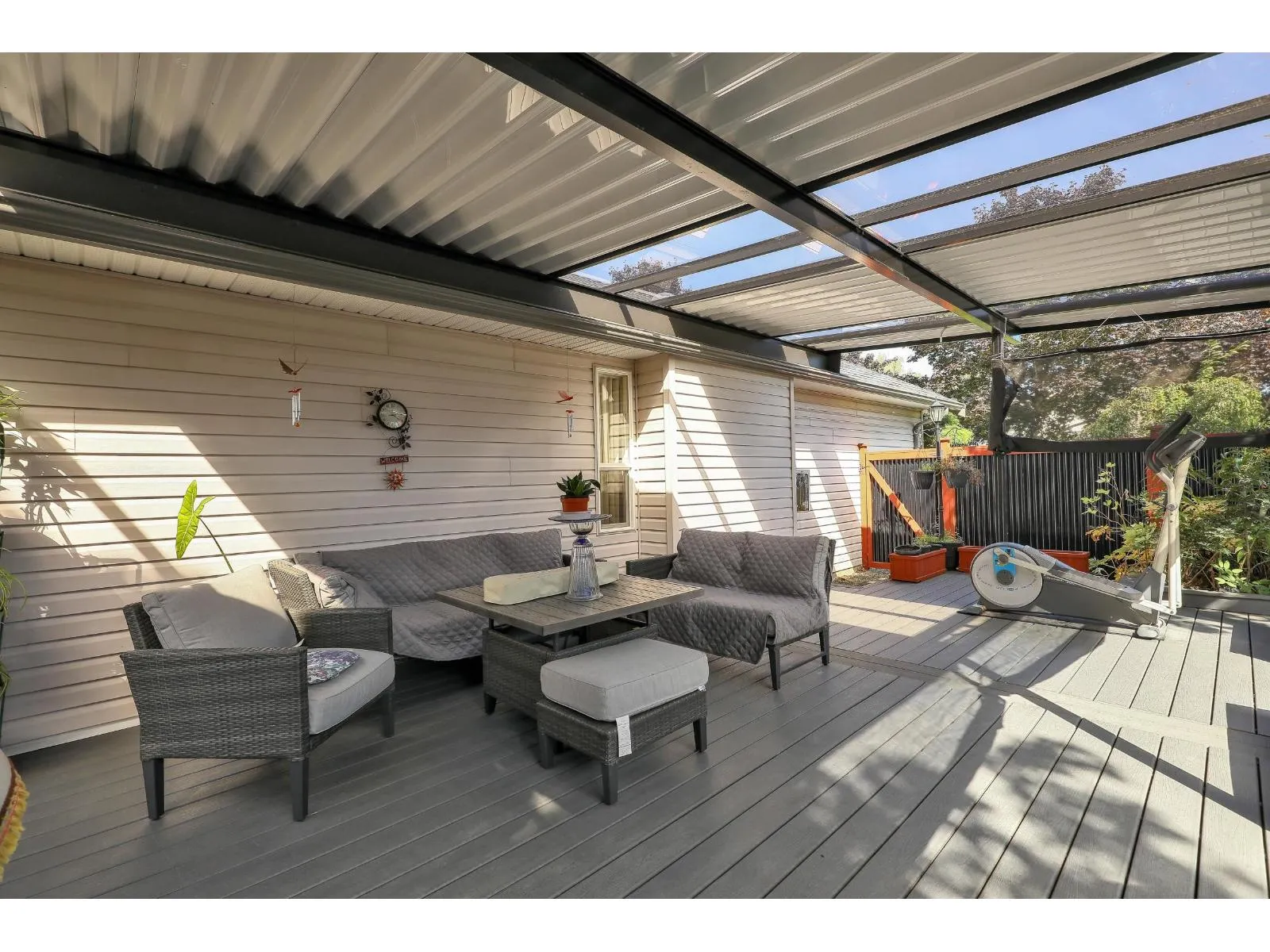RENOVATED Ranch-style house on freehold 8,320 sq ft lot with RV PARKING back access & oversize detached workshop. Extensive upgrades in perfect layout for relax or kids to play: designer kitchen cabinets, granite counters, engineered hardwood flooring, "Ësafe step' walk-in tub in bathroom, new water pipes; PRIVATE BACK YARD: new metal fence + new METAL roof in year 2024 w/transferable warranty; a massive covered patio, full "Duradeck" surrounds and a hot tub, garden beds beside an oversize detached workshop-for hobbies, storage, or mortgage helper. The zoning allows 2nd kitchen (existing plumbing, a separate entrance available). This home has great flexibility and can easily be converted to accommodate an extra bedroom, as well as be wheelchair accessible both indoors and out. (id:27476)