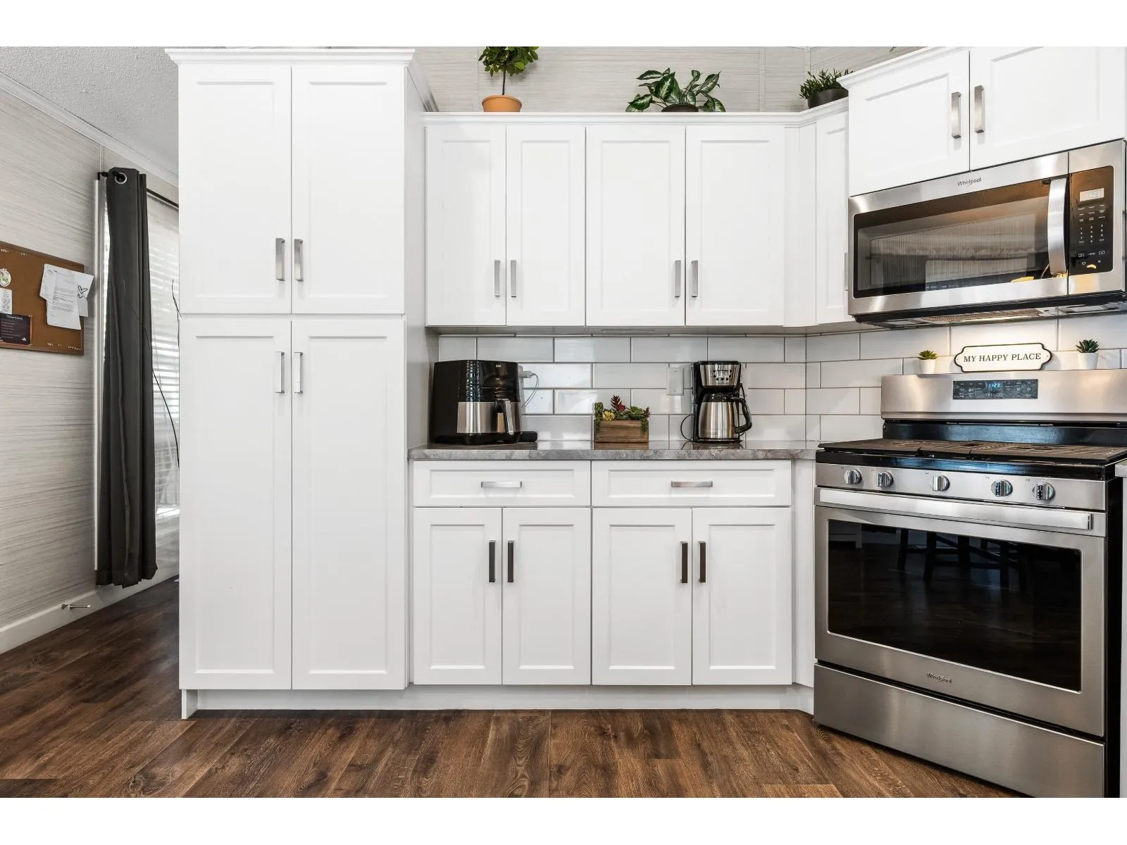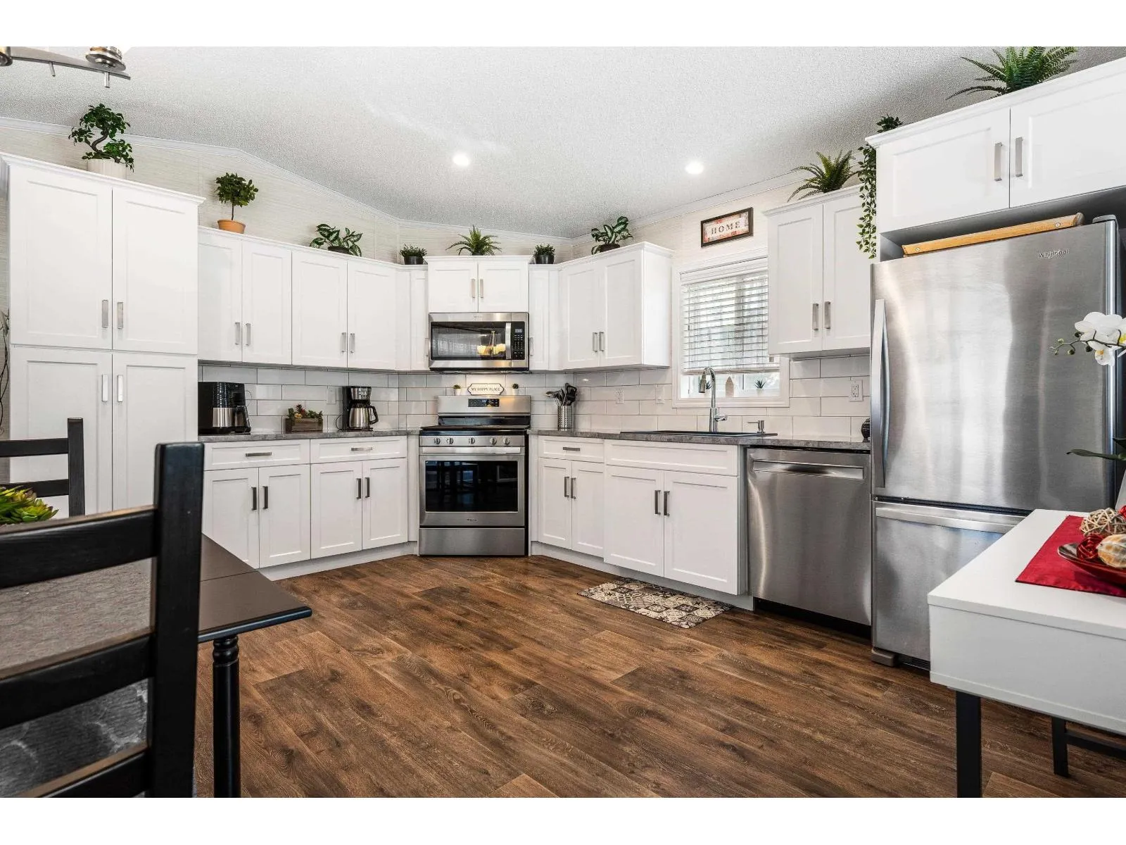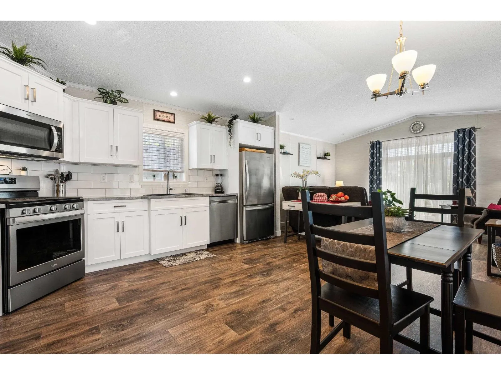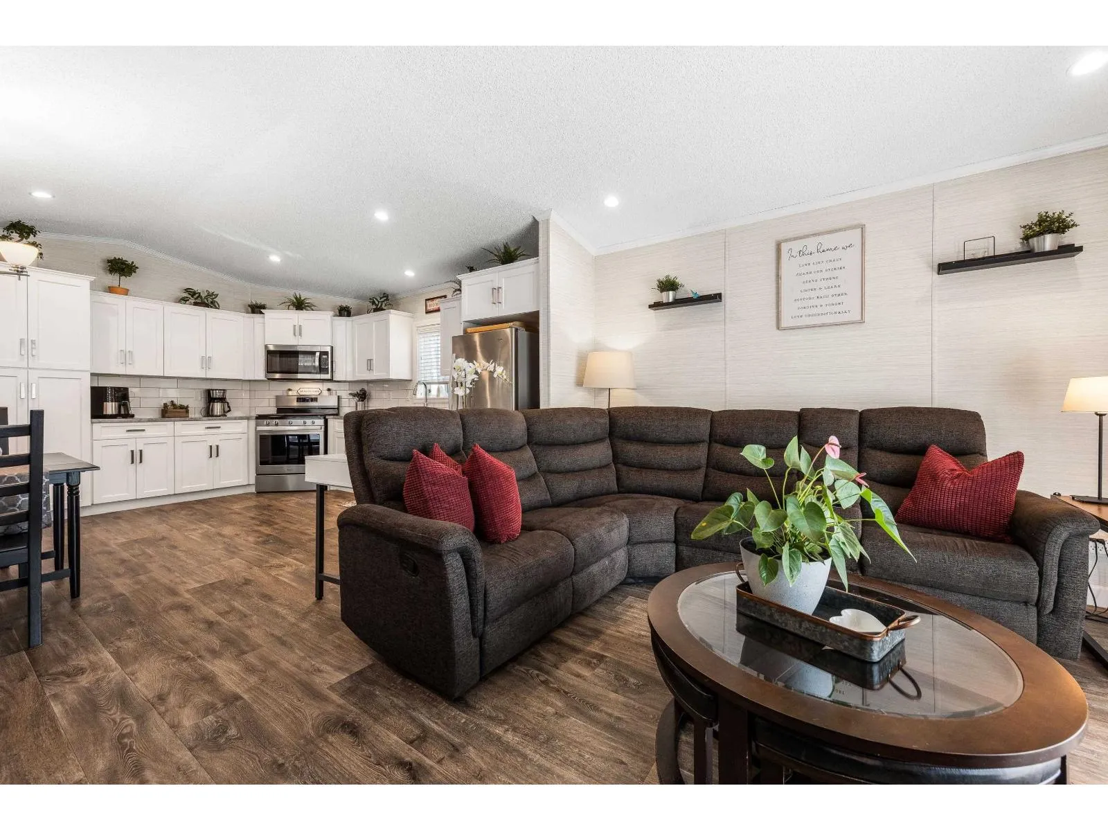 BEAUTIFUL home, shows 10/10! Greeted with a LARGE COVERED deck inviting you for all year entertaining. Inside, you will be invited by a stunning white kitchen w/ maple cabinetry, S/S appliances, GAS stove, NEW dishwasher, OVERSIZED w/d; BACKSPLASH, lam flooring, A/C, PHANTOM screen. The 2 bed, 1 full bath w/ SOAKER TUB is perfect for relaxing in; laundry rm is strategically located hidden in the bathrm. The vaulted ceiling creates a spacious & airy home; natural light coming in from all windows. A perfect place to call home while you never miss out on entertaining your guests w/ the OPEN CONCEPT. Outside, you have a SHED to store all your extra items. Small dog, no cats, landscaping done, affordable pad fee $550/month, beautiful 55+ park, furnace recently serviced. (id:27476)