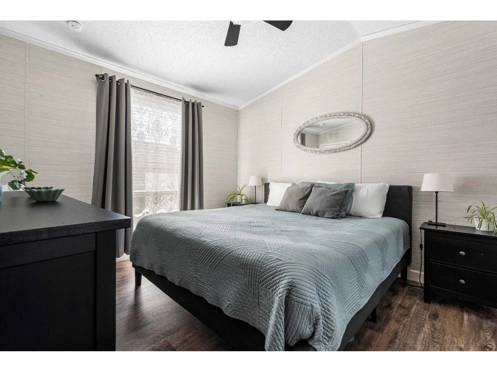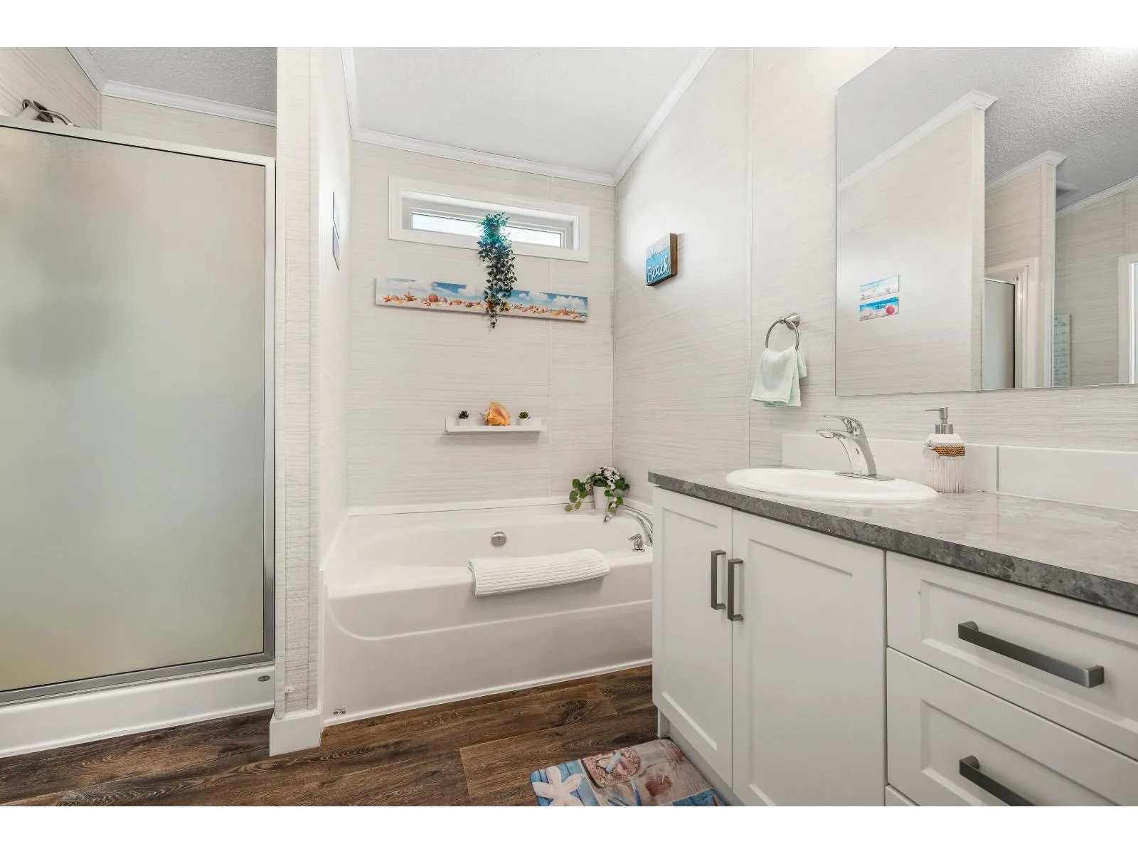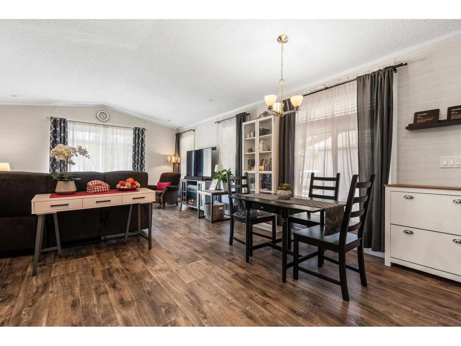 BEAUTIFUL home, shows 10/10! Greeted with a LARGE COVERED deck inviting you for all year entertaining. Inside, you will be invited by a stunning white kitchen w/ maple cabinetry, S/S appliances, GAS stove, NEW dishwasher, OVERSIZED w/d; BACKSPLASH, lam flooring, A/C, PHANTOM screen. The 2 bed, 1 full bath w/ SOAKER TUB is perfect for relaxing in; laundry rm is strategically located hidden in the bathrm. The vaulted ceiling creates a spacious & airy home; natural light coming in from all windows. A perfect place to call home while you never miss out on entertaining your guests w/ the OPEN CONCEPT. Outside, you have a SHED to store all your extra items. Small dog, no cats, landscaping done, affordable pad fee $550/month, beautiful 55+ park, furnace recently serviced. (id:27476)