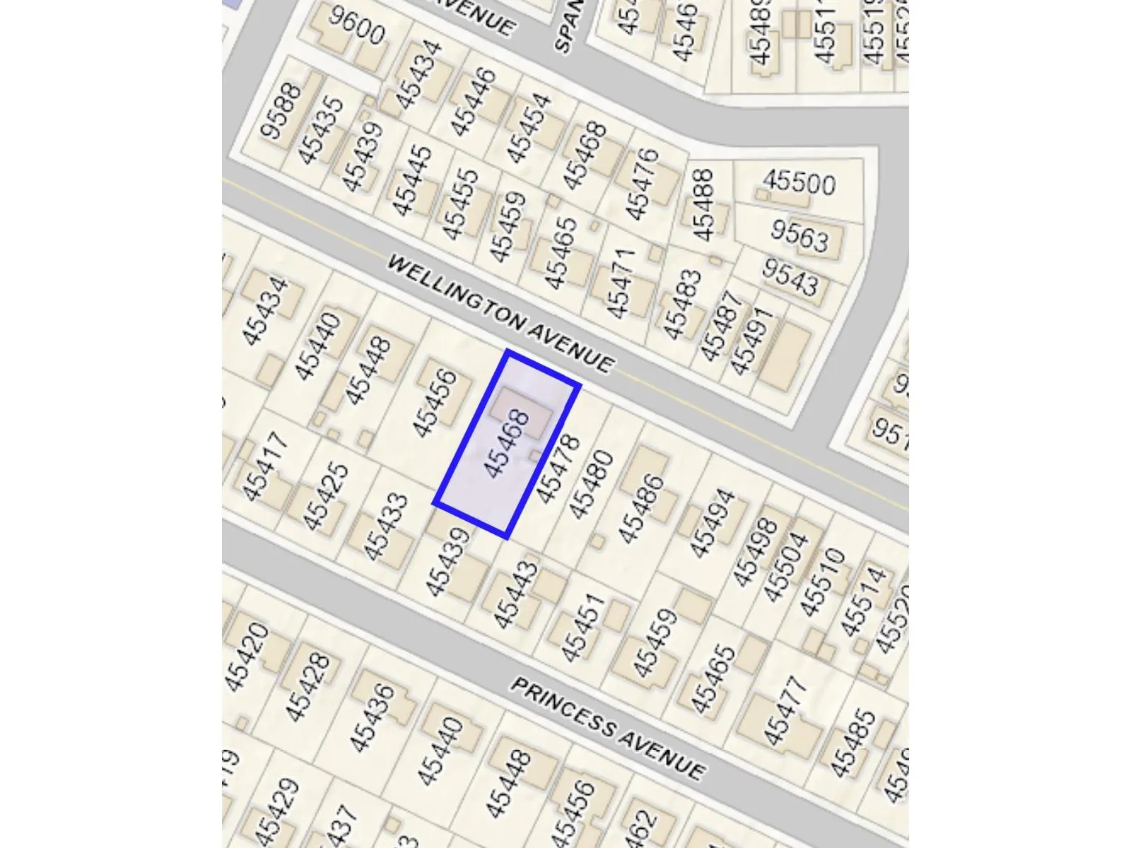 Seize this rare opportunity to acquire a 13,801 sq.ft. lot at 45468 Wellington Avenue, zoned R3 and approved for subdivision into two spacious ~6,900 sq.ft. each. Perfect for builders or investors, this level, rectangular parcel supports single-family homes with a 0.75 FSR per lot. Ready for city water and sewer servicing, it's ideally located in a family-friendly neighborhood near McCammon Traditional Elementary, parks, and amenities. This versatile property offers immense potential in Chilliwack's thriving market. Buyer to verify subdivision and servicing details. (id:27476)