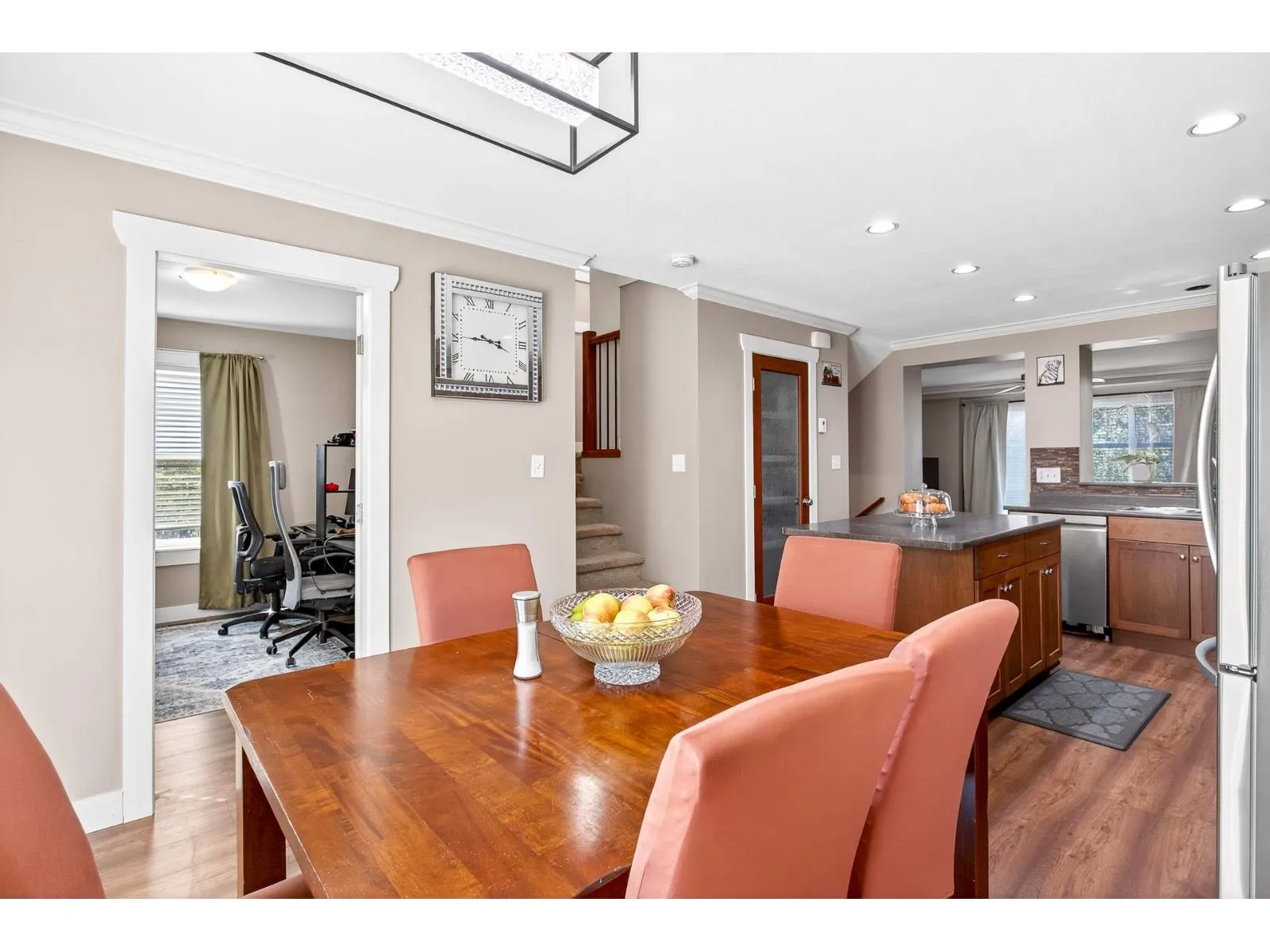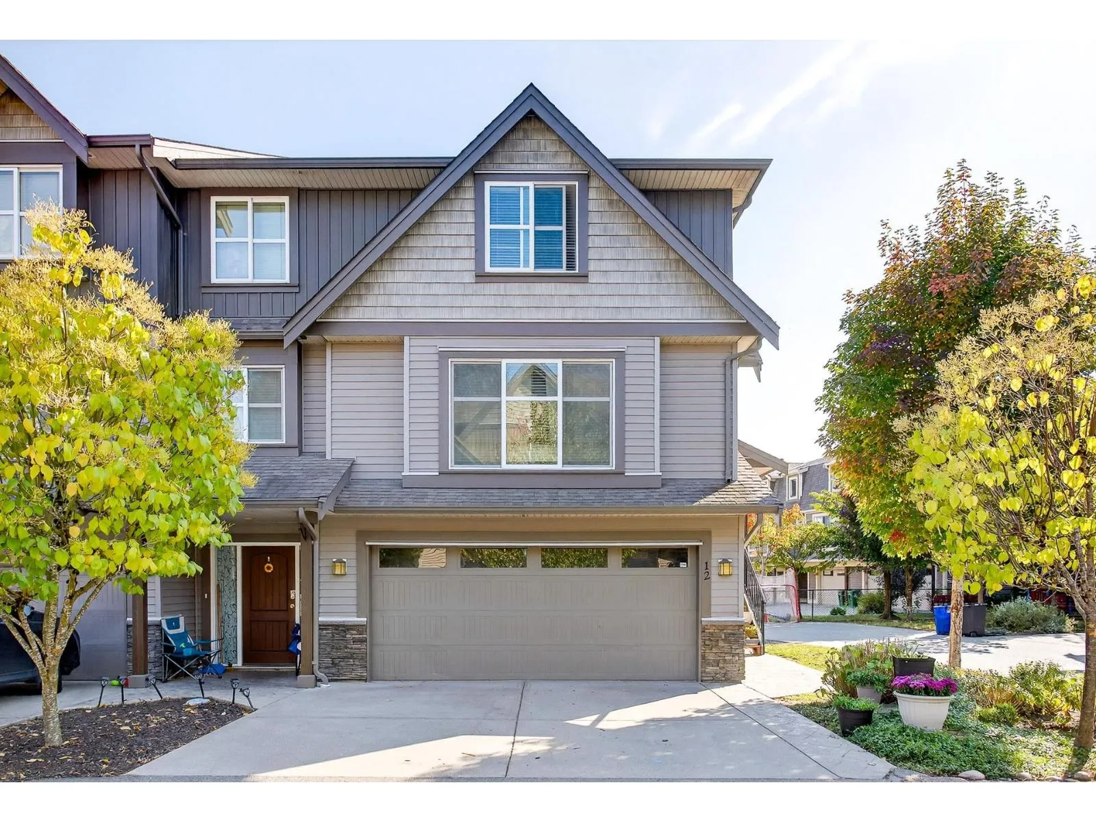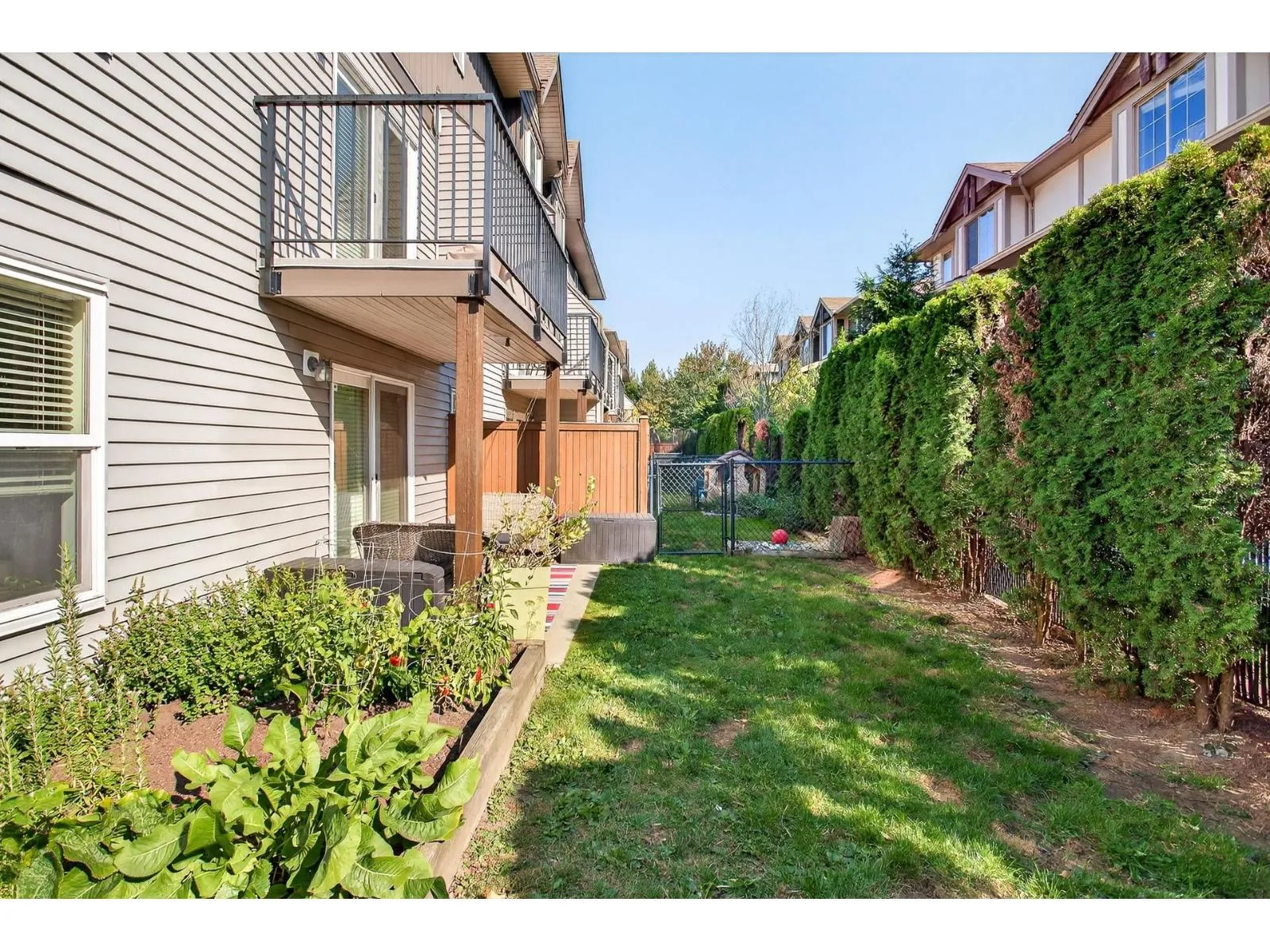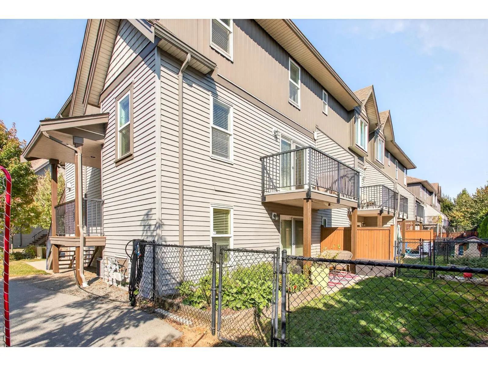 Welcome to Townsend Terrace, a family friendly complex minutes from everything you need. This stunning end unit with A/C and 4 parking sits in a desirable quiet location. This well-kept 4 bed, 3 bath Townhome offers 1,818.00 sqf. The open main floor boasts a bright living room with gas fireplace, laminate floors & a spacious island kitchen with newer stainless steel appliances, ample storage, pantry and adjacent dining leading to a sunny south-facing deck. A den makes a perfect home office. On the third level you'll find a large master w/walk-in closet & 2 bed & 2 full baths & laundry. Lower level offers a recreation room, 1 bedroom (no closet)& powder room, walkout patio, fenced yard w/garden & privacy hedging. Double garage with driveway, security system, BI system Vac. * Pet Friendly* (id:27476)