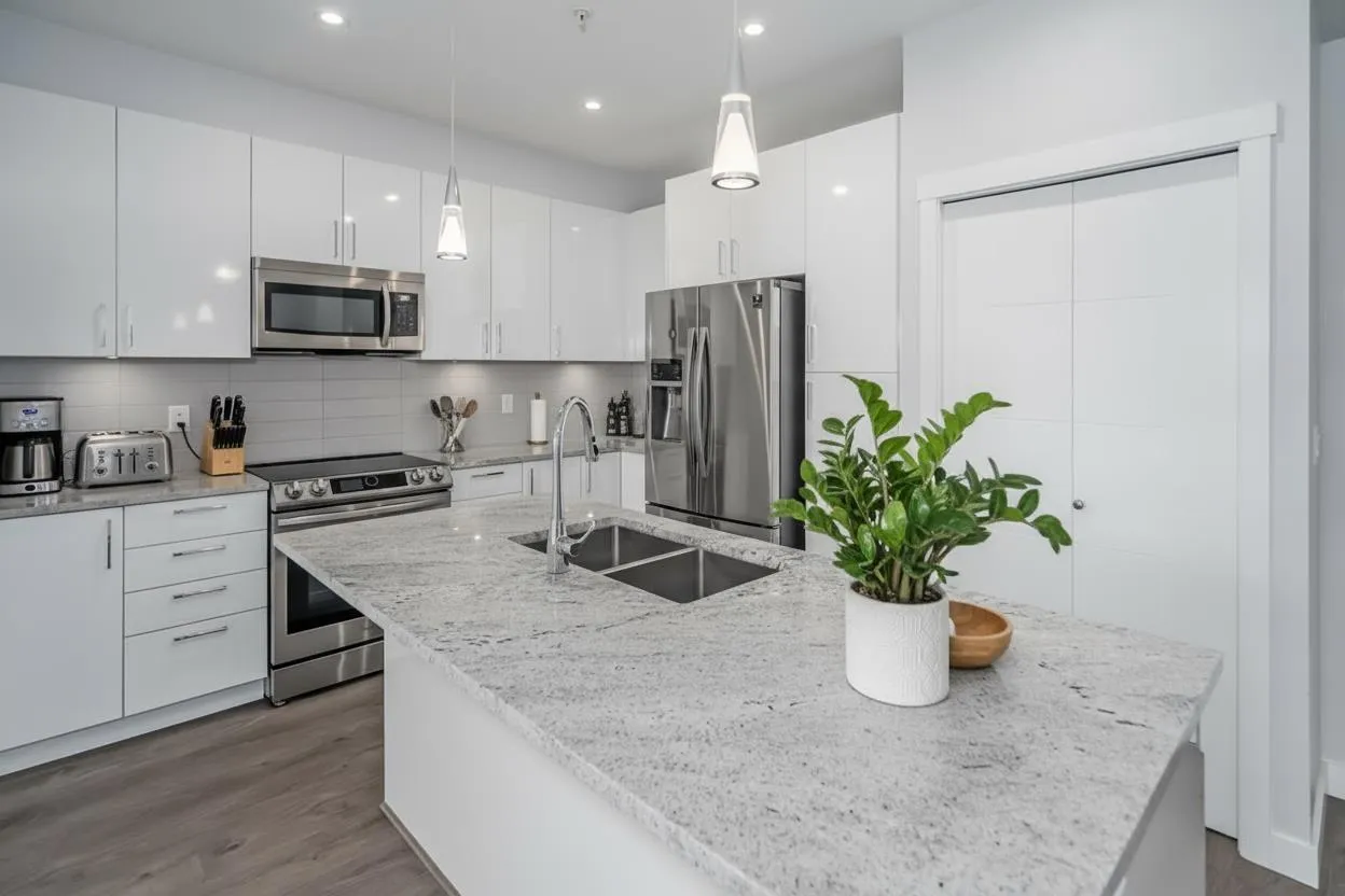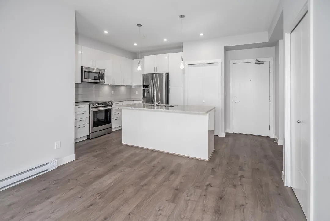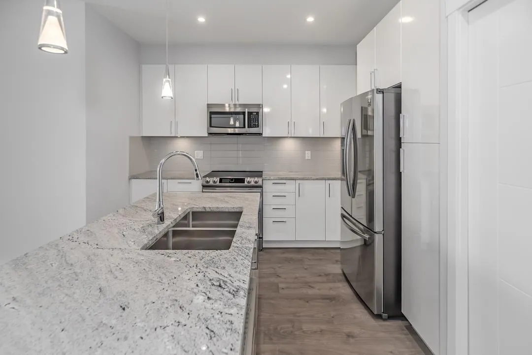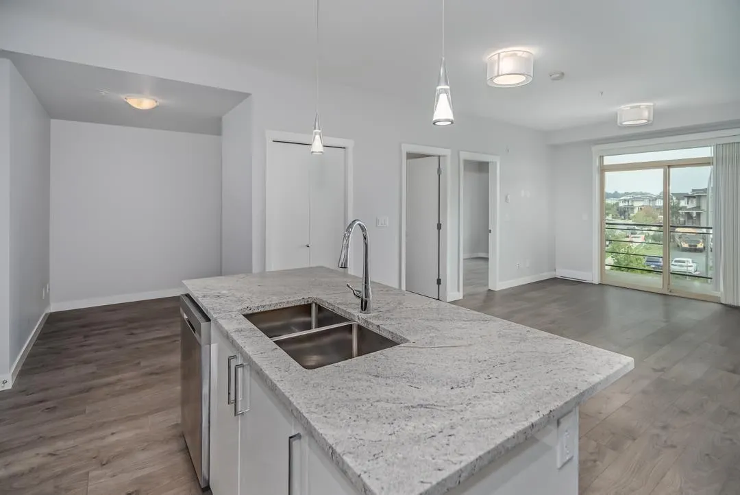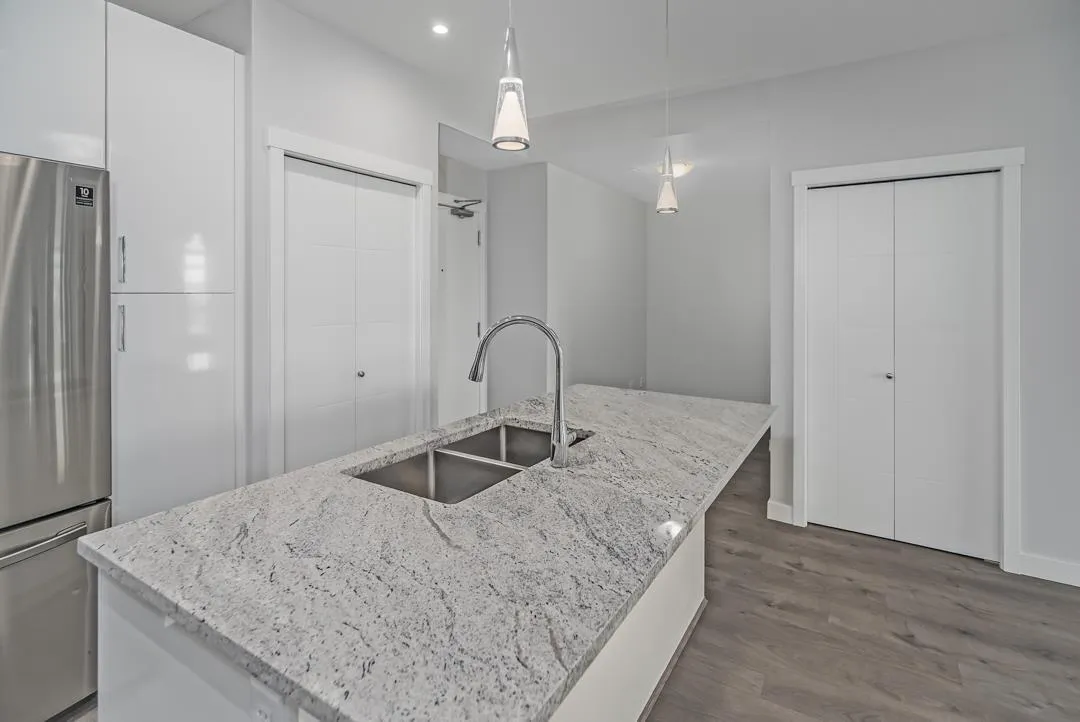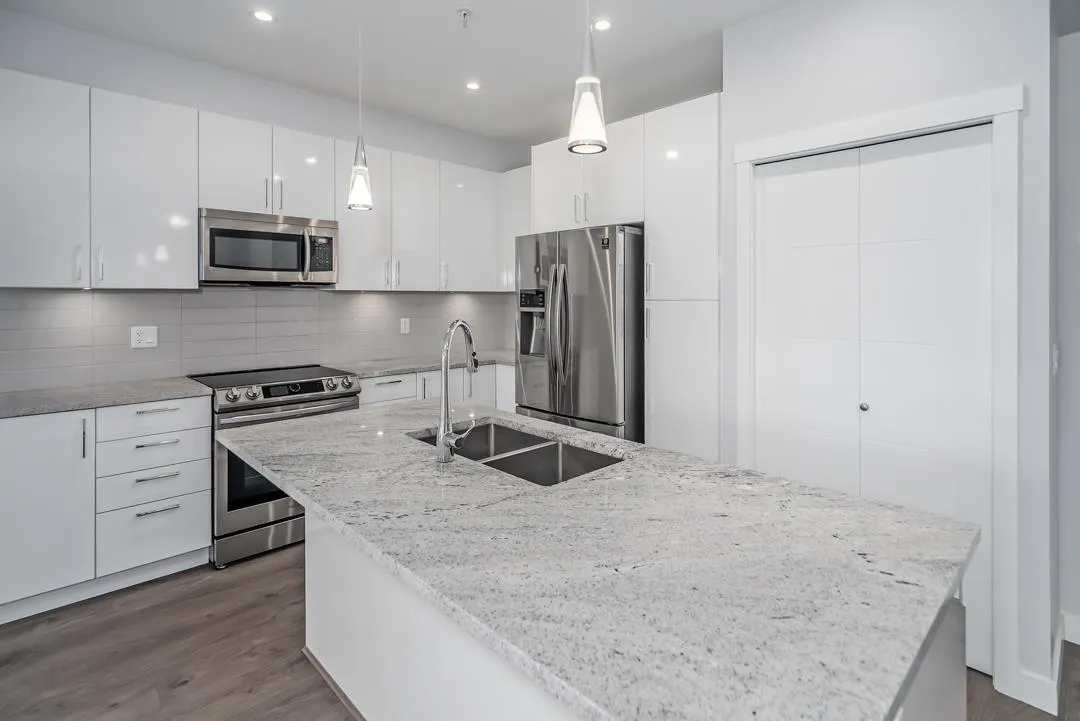Modern style and comfort blend seamlessly in this 2 bed, 2 bath + den condo at The Elliot. The open layout showcases a sleek kitchen with granite counters, stainless steel appliances, and a large island that flows into a bright living area and north-facing balcony"-ideal for morning coffee or evening BBQs. The primary suite offers a private ensuite, while the den is perfect for a home office or cozy reading nook. With same-floor storage, secure parking, and a pet-friendly policy (no size restrictions), this home delivers effortless living close to shopping, dining, and highway access. (id:27476)