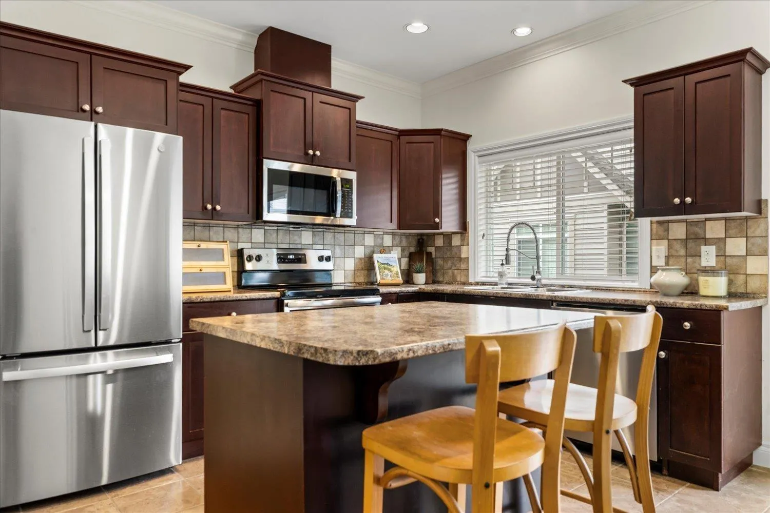 Welcome to "Village Green", a family friendly Townhome community nestled in a quiet neighourhood setting. Ideal location for your starter or first family home! 3 bedrooms + bonus downstairs family room! Features include vaulted entry, formal living room w/ fireplace, FORCED AIR natural gas heating, full size downstairs LAUNDRY ROOM w/ access to your own southwest facing fenced backyard. Perfect for kids, pets & gardeners! Enjoy your own deck off the kitchen that includes a NEW fridge, NEW built-in microwave, NEW dishwasher, a step-in pantry & island. Convenient bathroom on the main. Large primary w/ walk-in closet & separate ensuite bathroom. Complex has access to playground & park for the kids! Bring your pets of ALL sizes - cats & dogs welcome! Put this home on your "must see" list! * PREC - Personal Real Estate Corporation (id:27476)