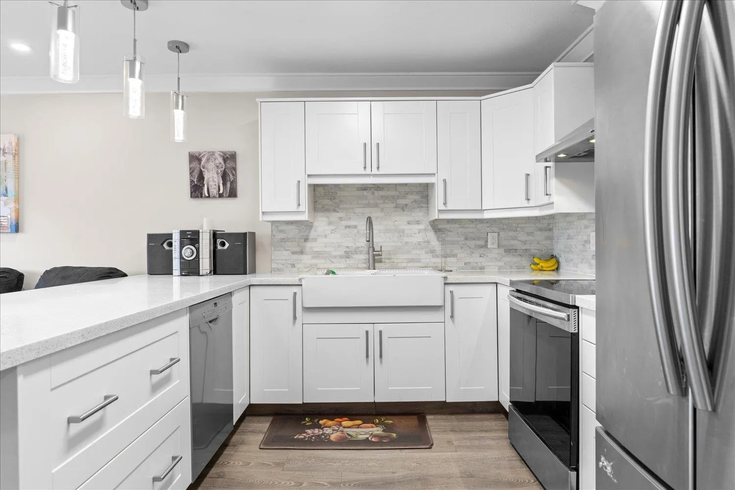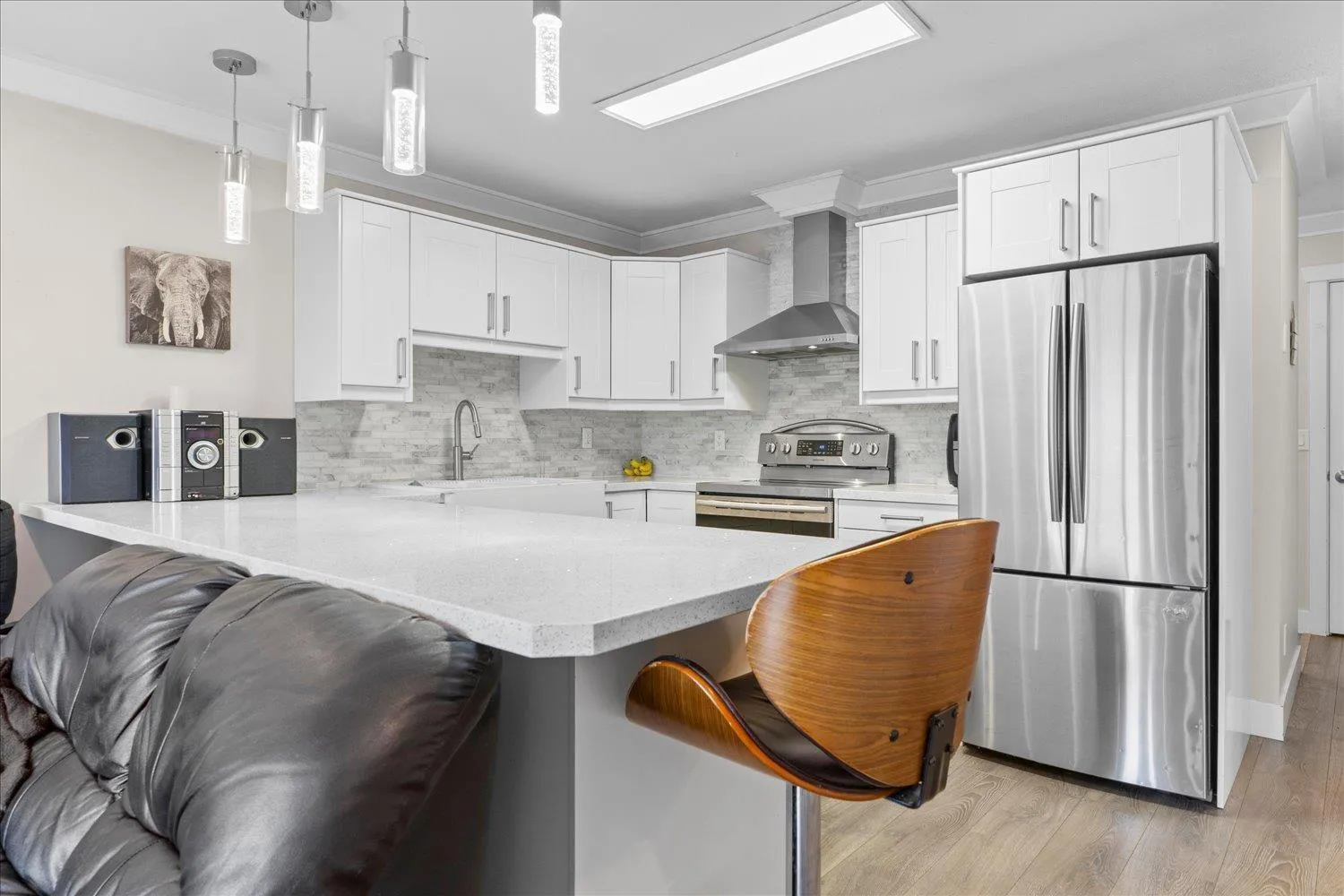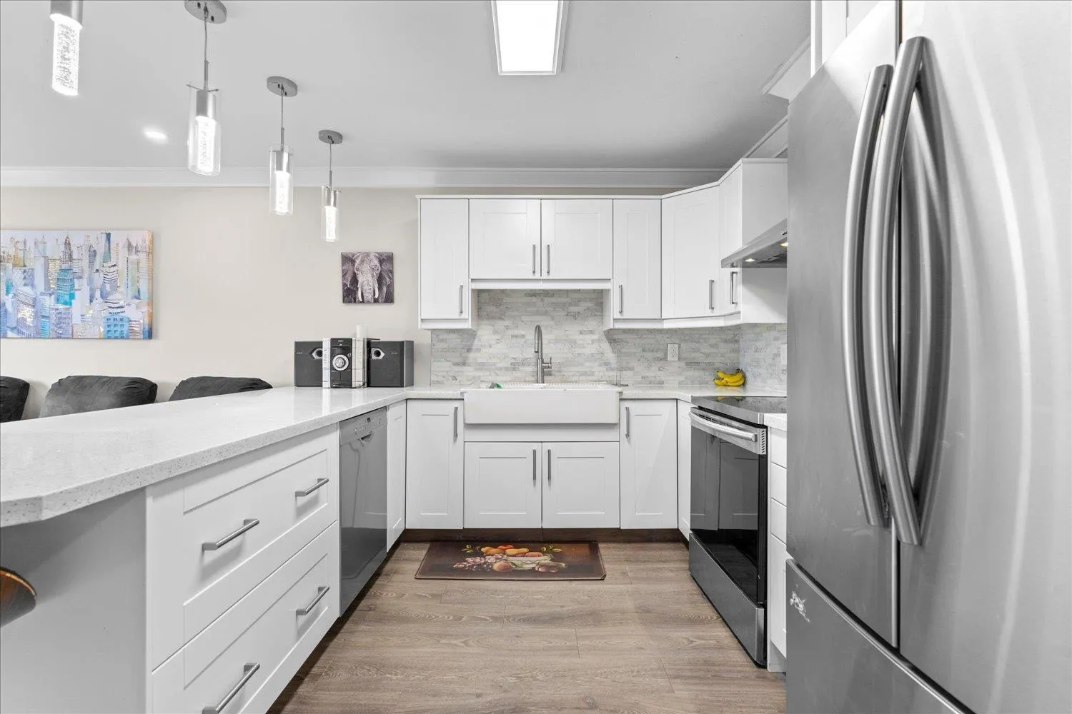 Be impressed by this large THREE BEDROOM corner condo at McIntosh Village! You'll love the floor to ceiling renovations and an abundance of living space. This suite features trendy laminate floors, updated LED lighting, crown molding, and in-suite laundry. A gorgeous white kitchen with quartz counters and an eating bar is the focal point of the open living area and offers plenty of cabinetry. From the living area, step out onto the private balcony with mature landscaping all around. The bathroom is also beautifully updated with slate tile and white cabinetry. Extra perks include an in-condo storage room, affordable strata fees, and top-floor living. Conveniently located between Sardis and Chilliwack's rejuvenated downtown, this condo is the ideal home for a first time buyer. SHOWS A TEN! (id:27476)