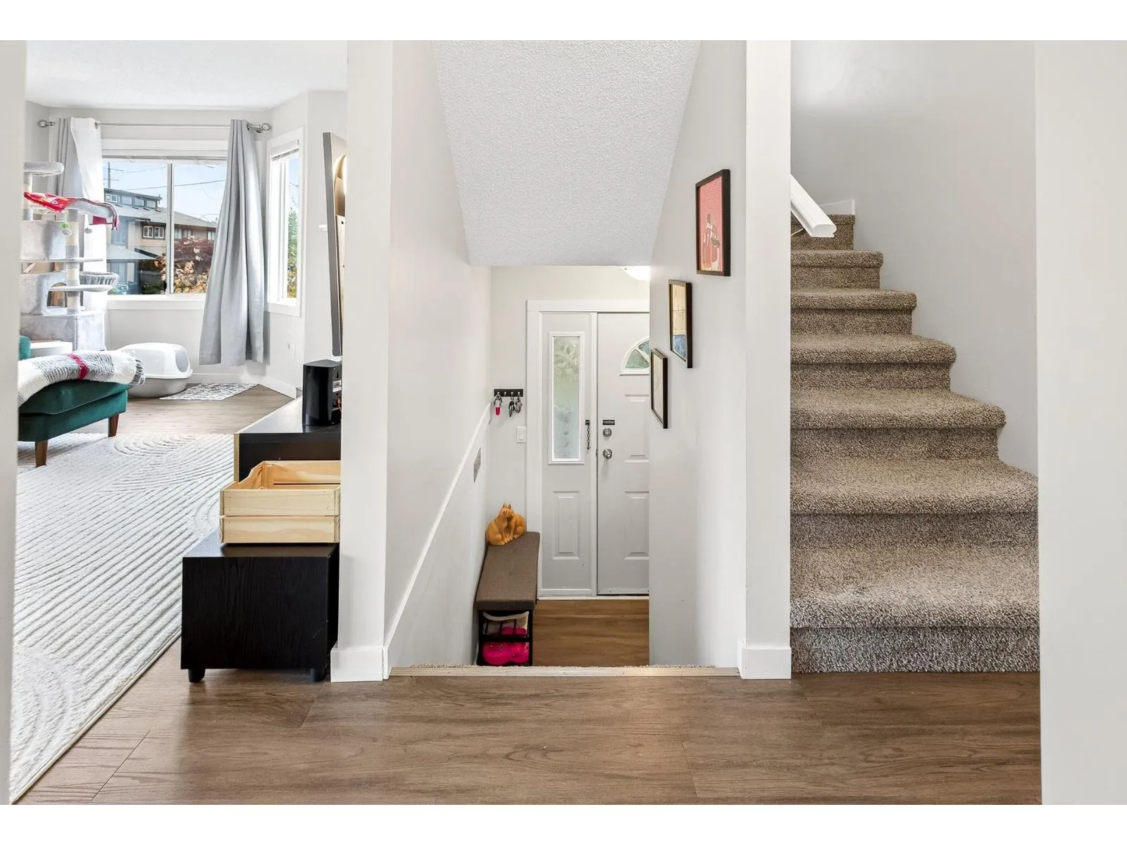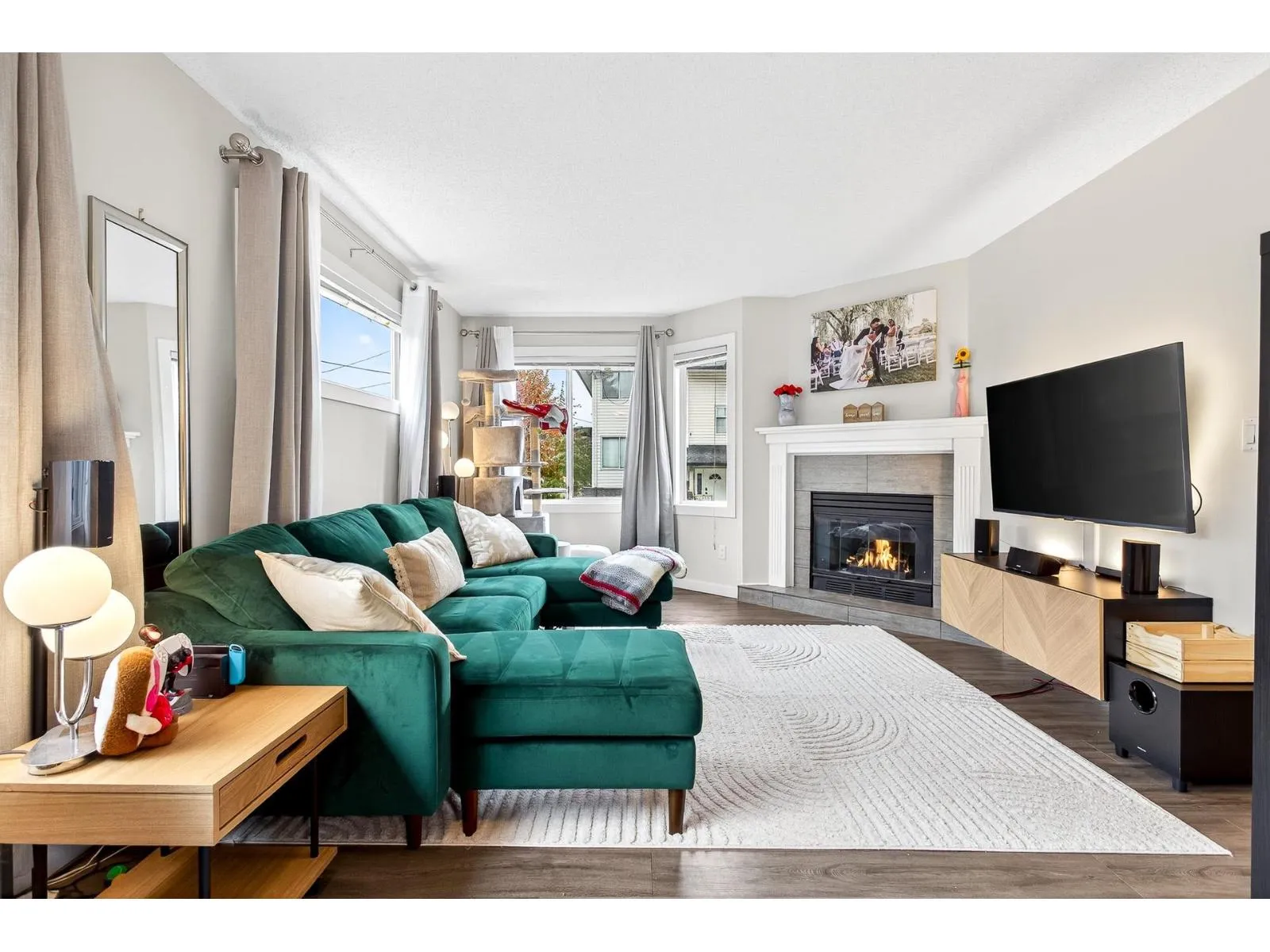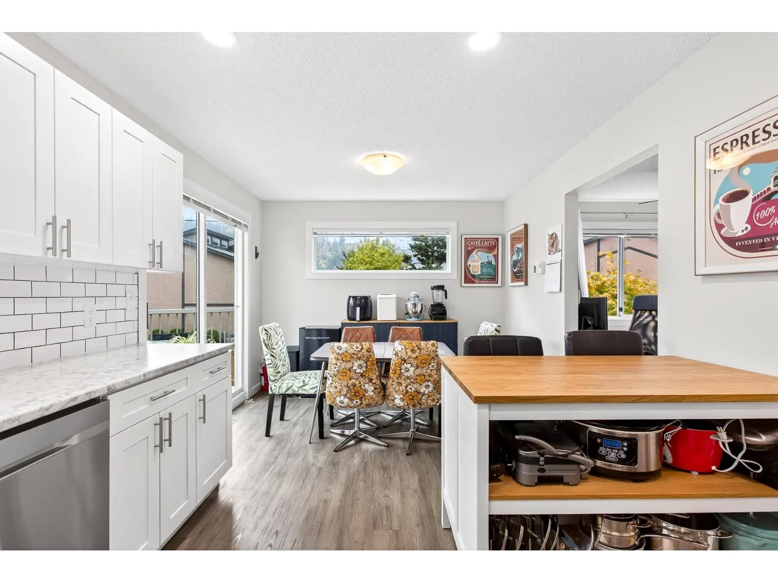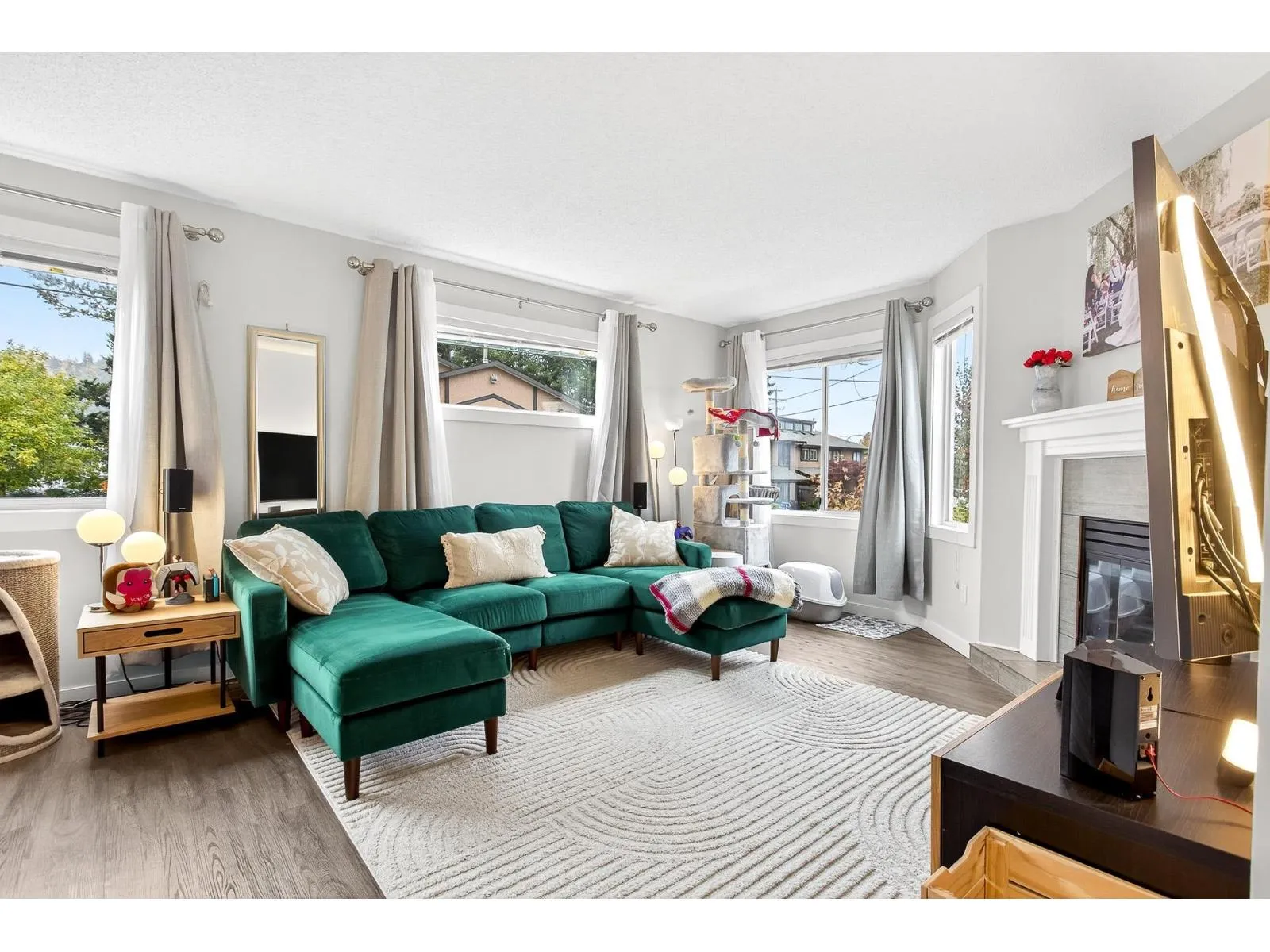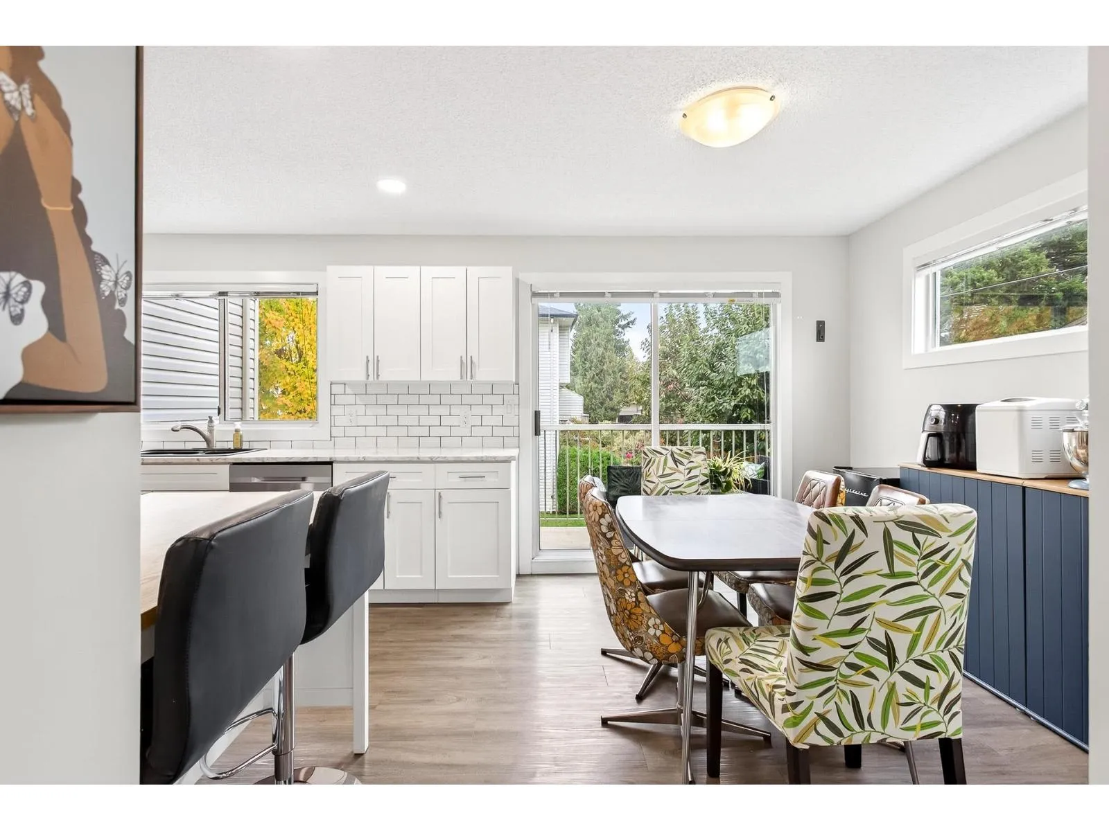**Parkview Place** Spacious, Bright and updated END UNIT! Extensively renovated in 2021 including all white kitchen with S/S appliances, laminate flooring, baths, sinks, window blinds, pot lights & cozy gas fireplace. New (2024) hot water tank, two stage furnace + HEAT PUMP. Main level features living room with gas fireplace, dining room, updated kitchen + an eating area with access to the balcony. Upstairs has 3 spacious bedrooms including a primary suite with walk-in-closet + 2pc ensuite. Basement rec room + access to patio. Nice open yard, GARAGE and PET FRIENDLY! Close to bus, all levels of schools, shopping, Garrison Crossing, Vedder Crossing, parks and recreation including CULTUS LAKE! (id:27476)