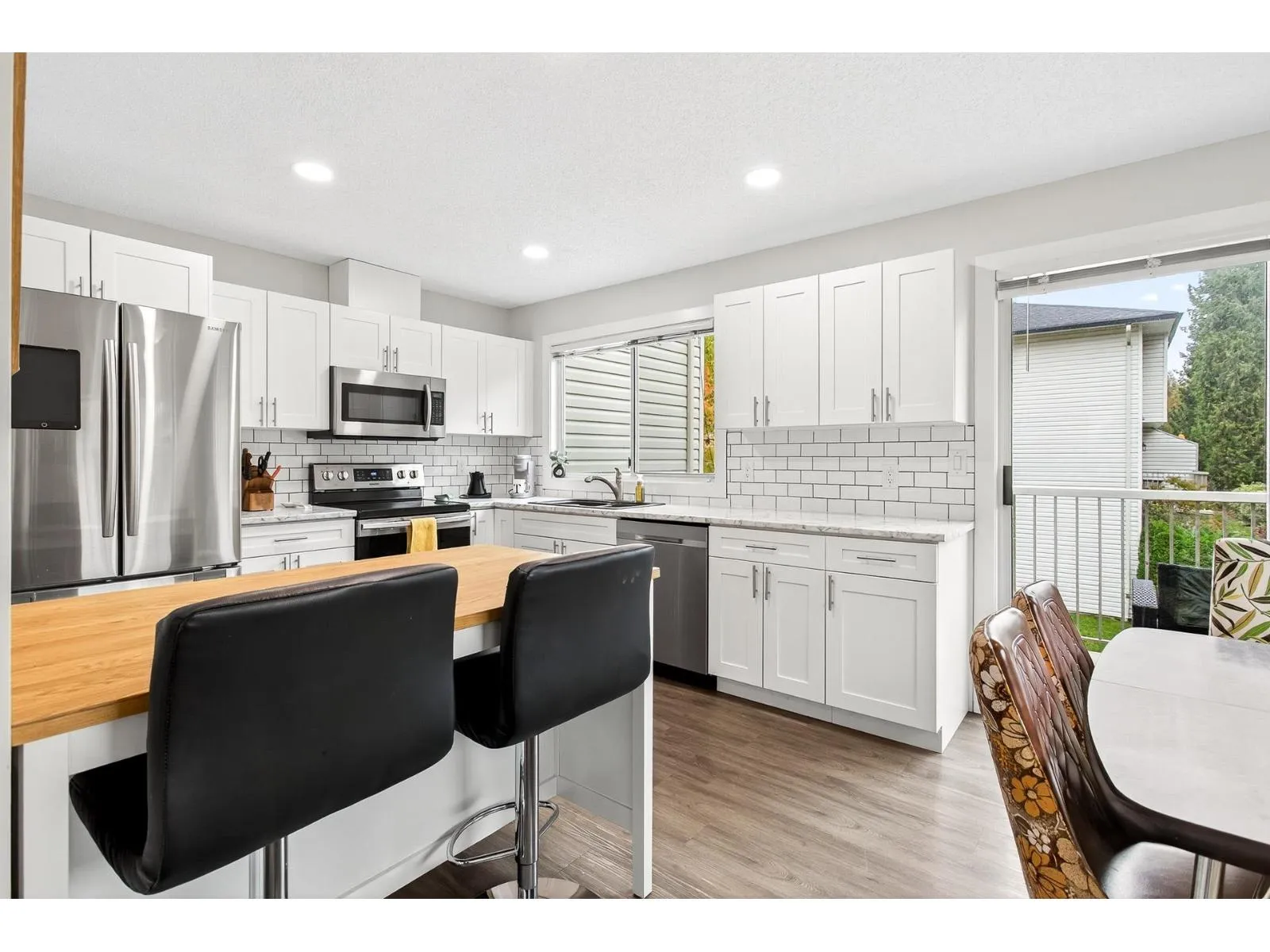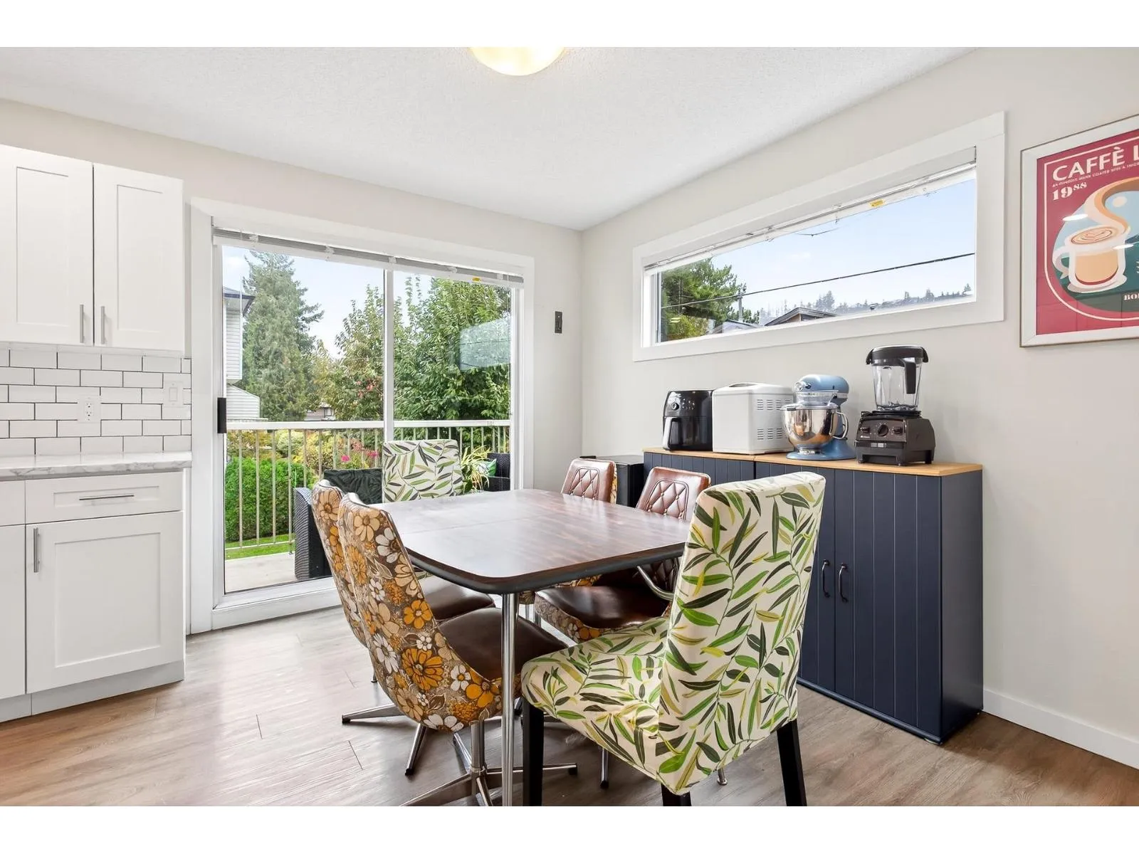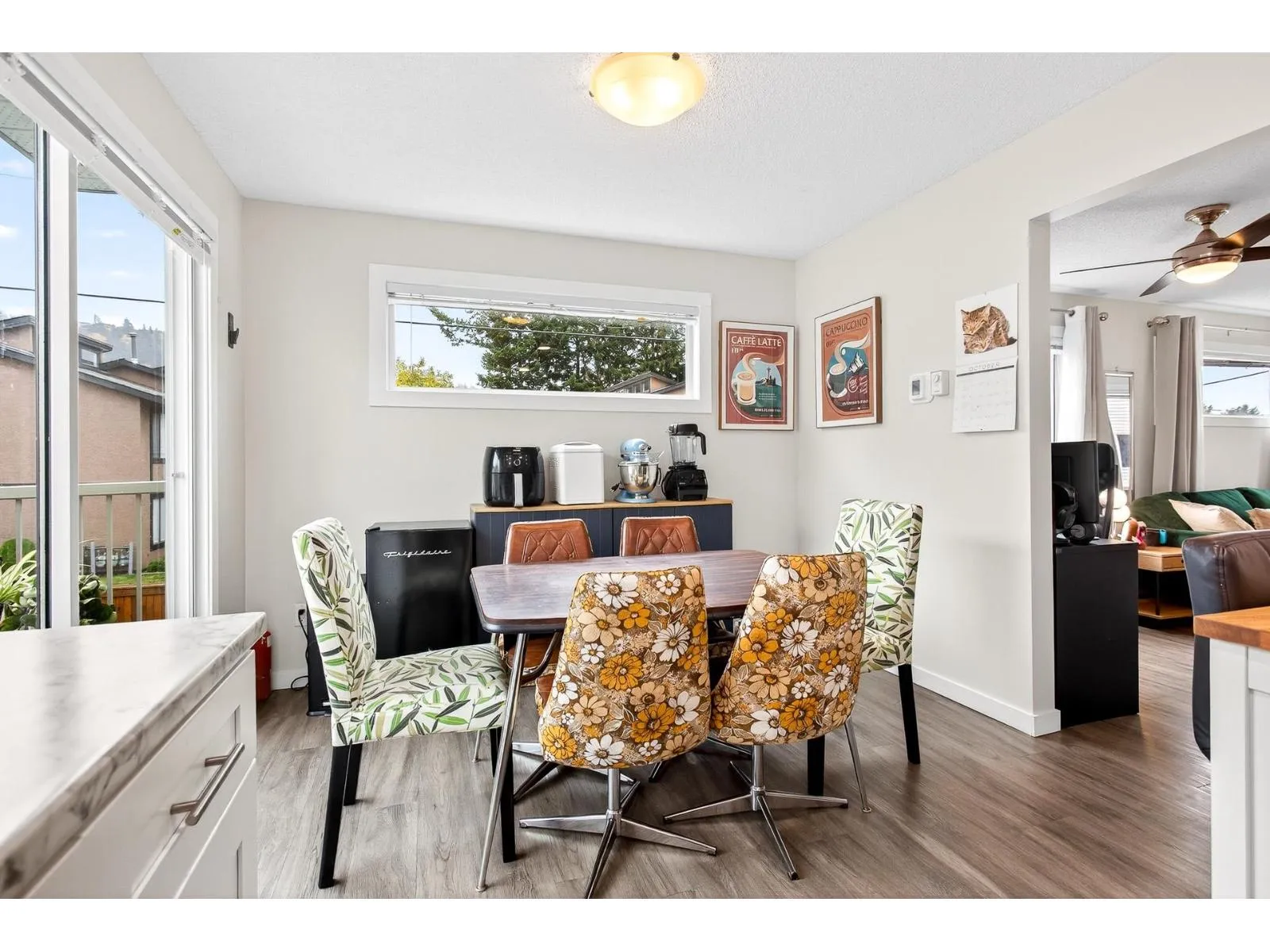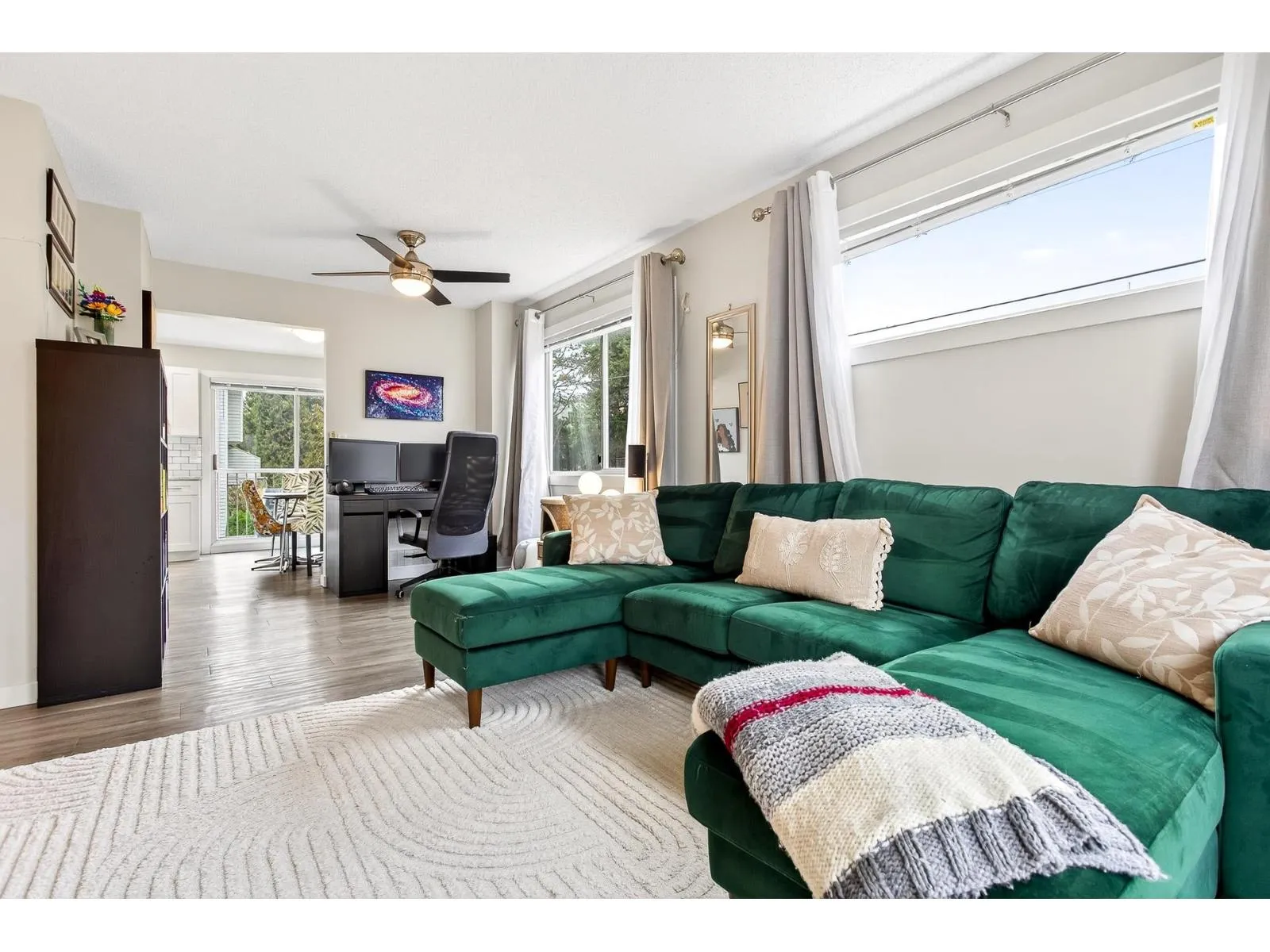 **Parkview Place** Spacious, Bright and updated END UNIT! Extensively renovated in 2021 including all white kitchen with S/S appliances, laminate flooring, baths, sinks, window blinds, pot lights & cozy gas fireplace. New (2024) hot water tank, two stage furnace + HEAT PUMP. Main level features living room with gas fireplace, dining room, updated kitchen + an eating area with access to the balcony. Upstairs has 3 spacious bedrooms including a primary suite with walk-in-closet + 2pc ensuite. Basement rec room + access to patio. Nice open yard, GARAGE and PET FRIENDLY! Close to bus, all levels of schools, shopping, Garrison Crossing, Vedder Crossing, parks and recreation including CULTUS LAKE! (id:27476)