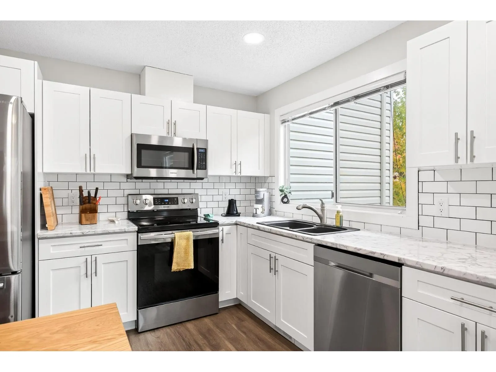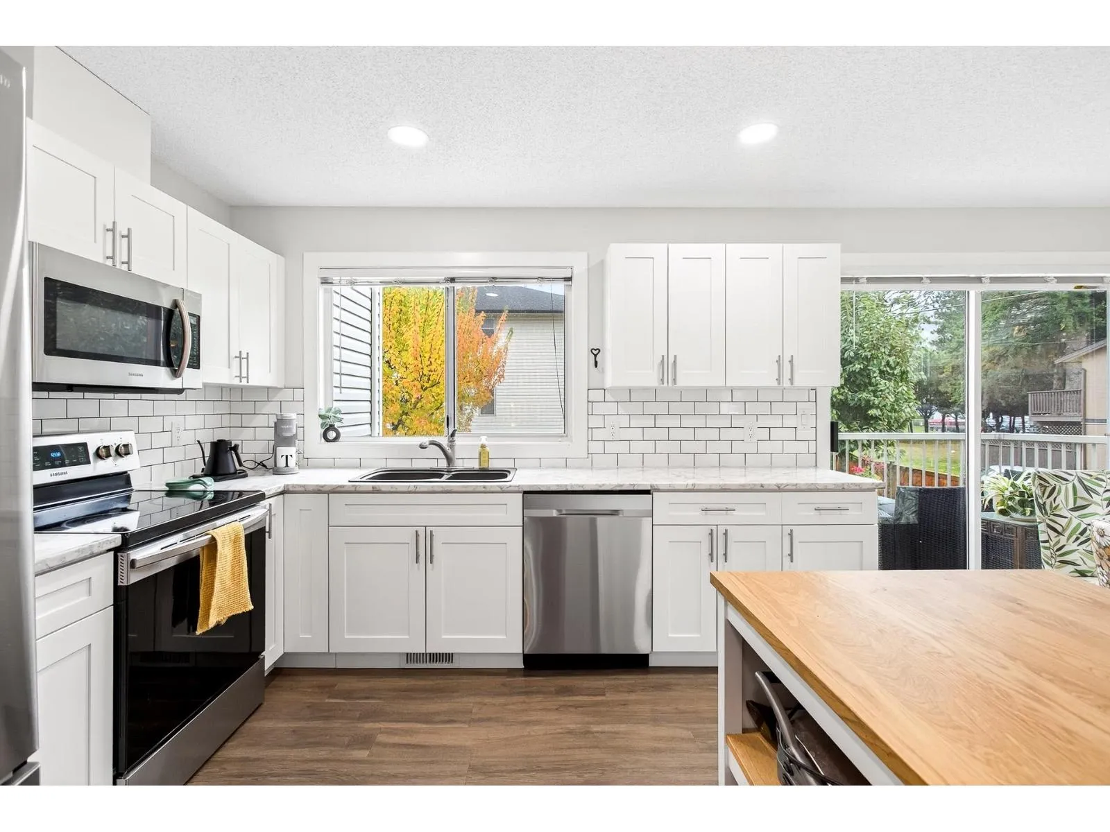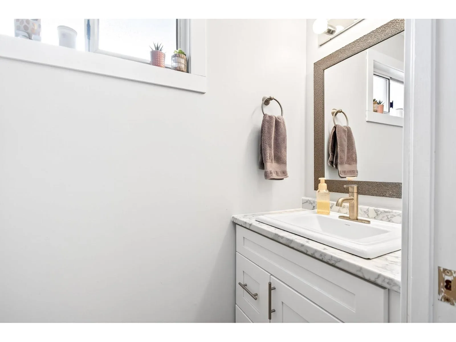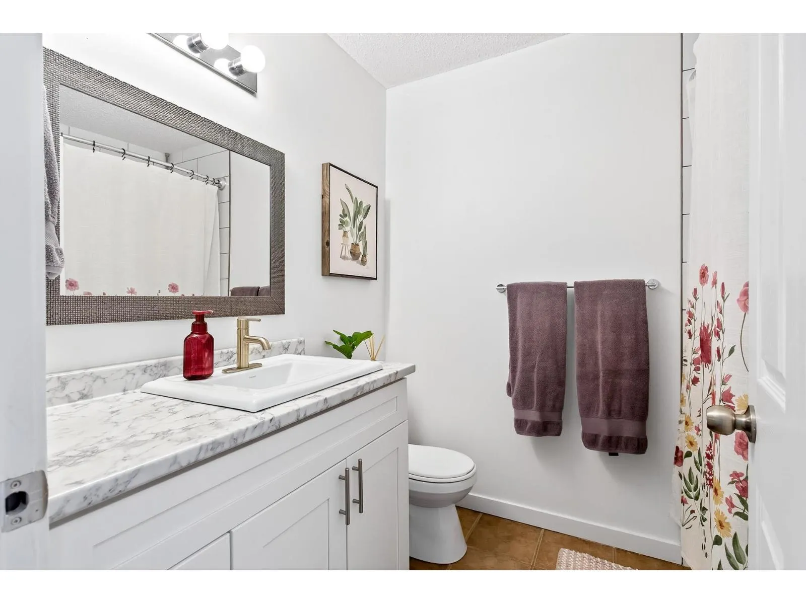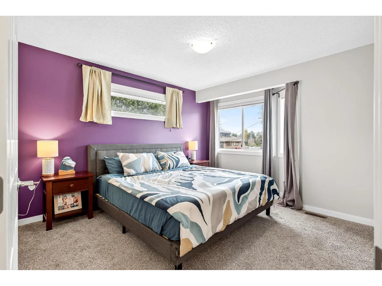 **Parkview Place** Spacious, Bright and updated END UNIT! Extensively renovated in 2021 including all white kitchen with S/S appliances, laminate flooring, baths, sinks, window blinds, pot lights & cozy gas fireplace. New (2024) hot water tank, two stage furnace + HEAT PUMP. Main level features living room with gas fireplace, dining room, updated kitchen + an eating area with access to the balcony. Upstairs has 3 spacious bedrooms including a primary suite with walk-in-closet + 2pc ensuite. Basement rec room + access to patio. Nice open yard, GARAGE and PET FRIENDLY! Close to bus, all levels of schools, shopping, Garrison Crossing, Vedder Crossing, parks and recreation including CULTUS LAKE! (id:27476)