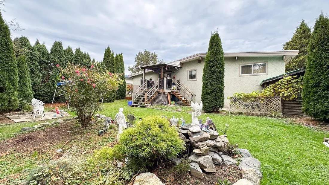 Prime Sardis location just steps from Garrison Crossing! This well-maintained split-entry home sits on a 67 x 112 ft flat lot and features 2 bedrooms up and 2 down, plus a spacious recreation room in downstairs. Updates over the years include engineered laminate flooring, roof, upper-floor windows, and a reworked open-concept kitchen. The large, fully fenced backyard offers beautiful gardens, a covered deck, and a good-sized storage shed"-perfect for active kids and family gatherings. With easy highway access via Evans Road and parks, schools, shops, and the Vedder River all within a 10-minute walk, this turn-key property is an excellent family home or investment opportunity in the heart of Sardis. (id:27476)