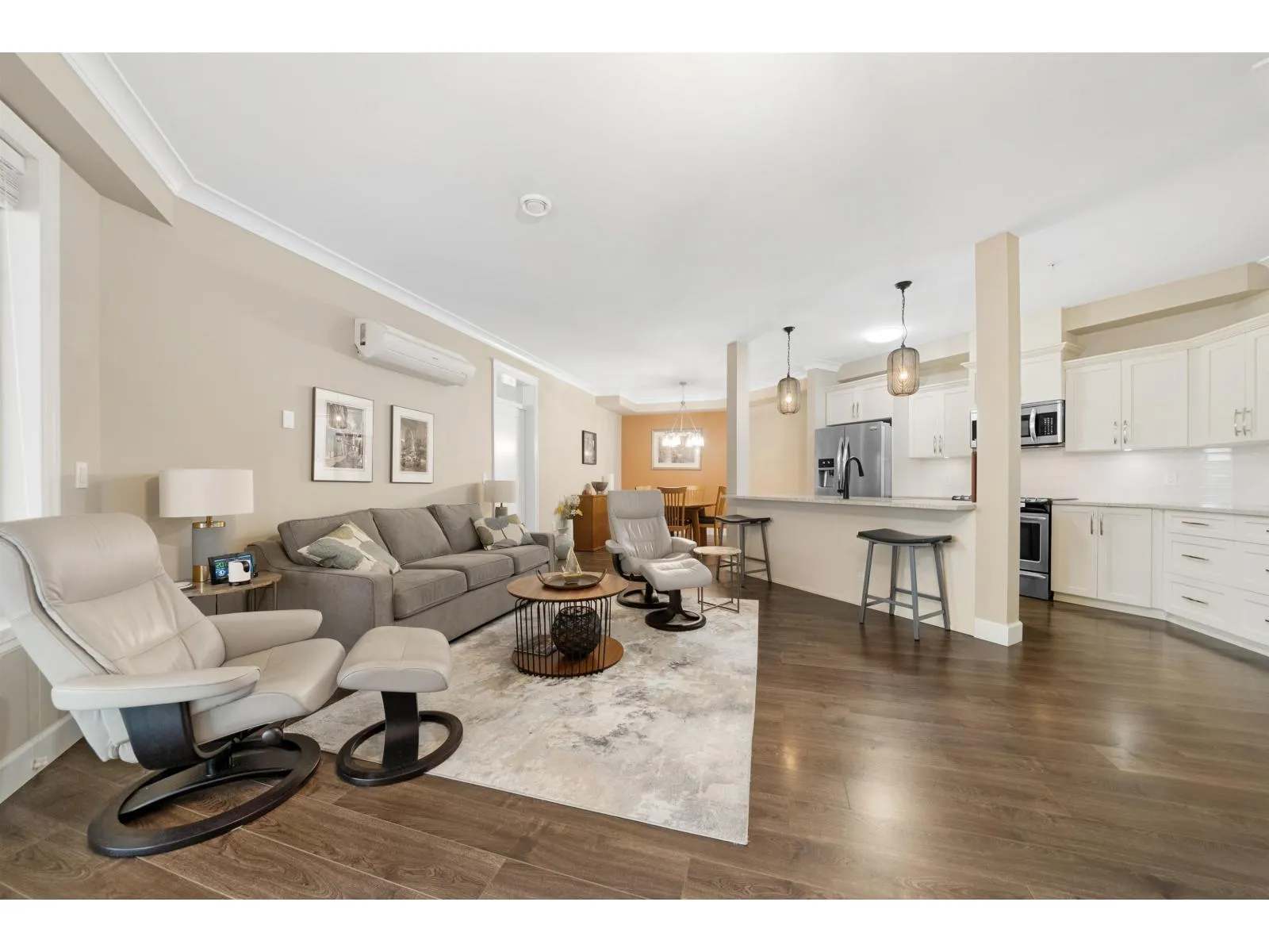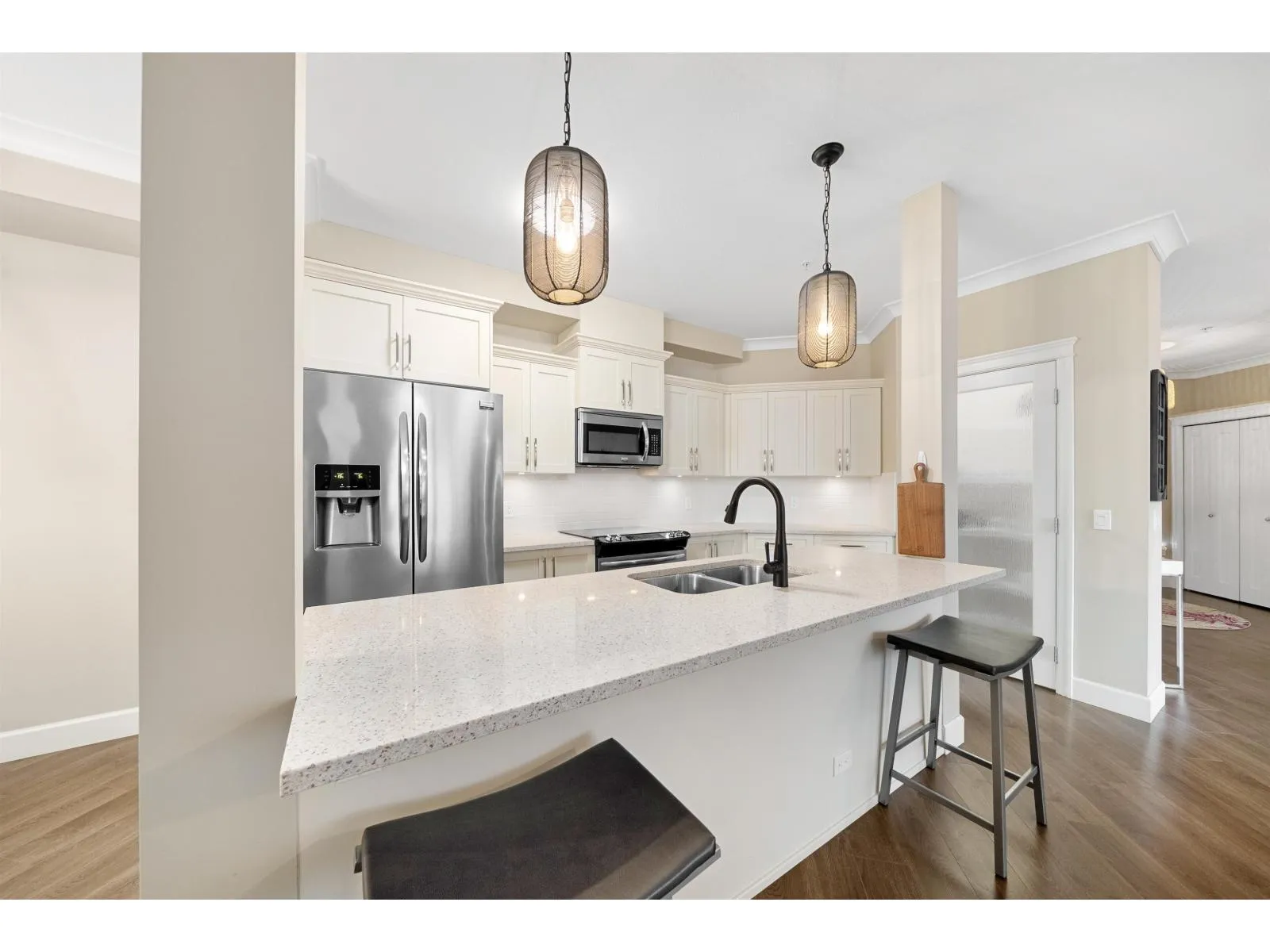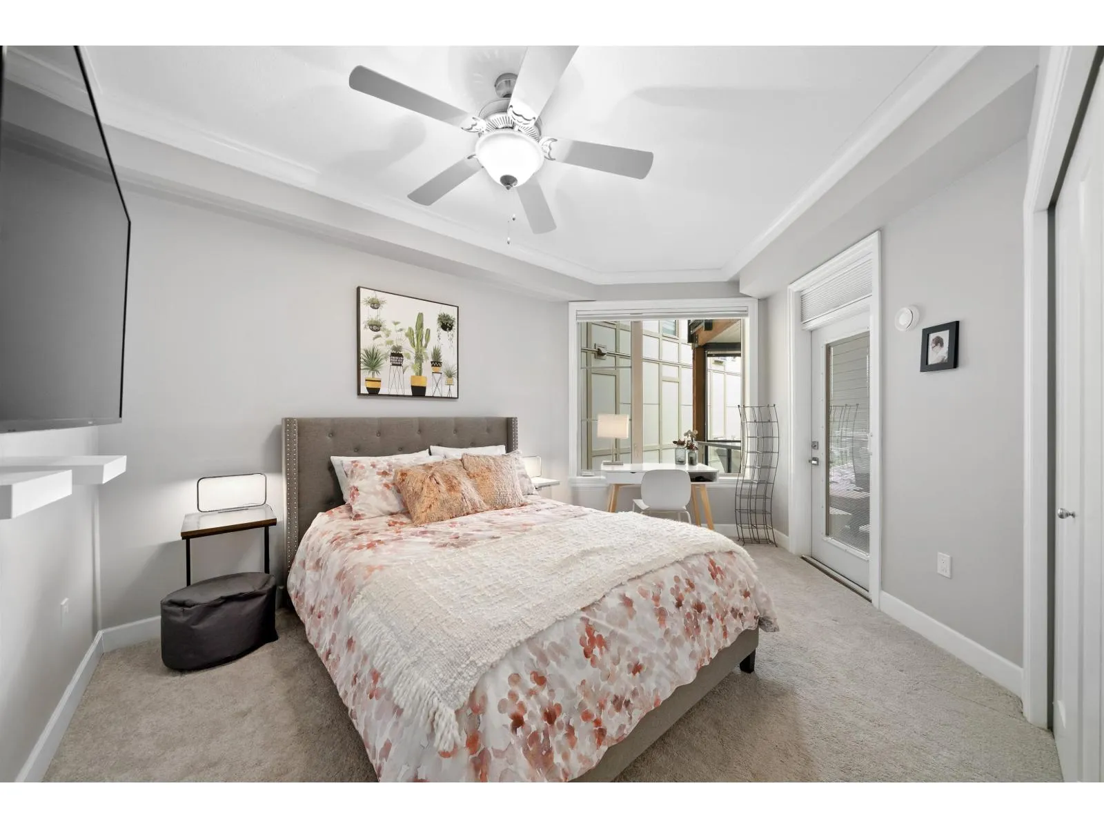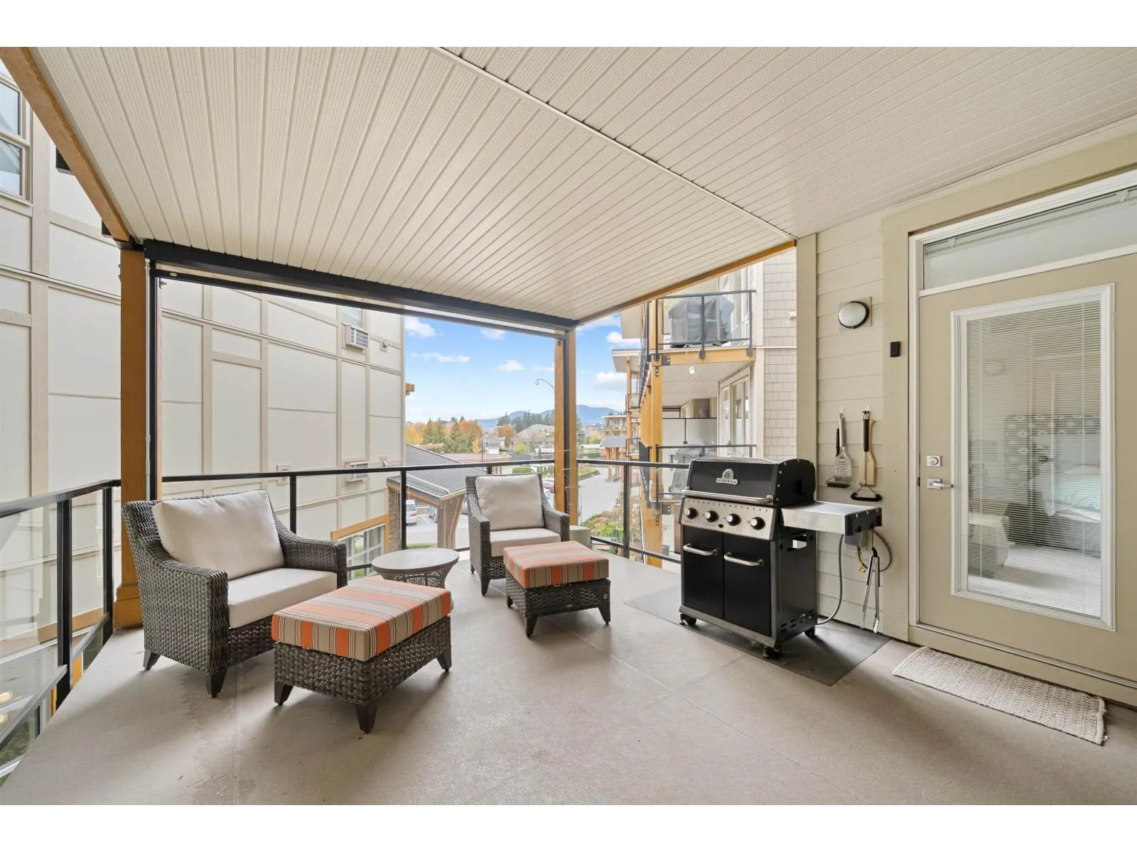 Englewood Courtyard "â master-planned, gated 45+ community near Garrison Crossing & Rotary Trail. Spacious inside corner unit, one of the largest in the building! Features 2 bedrooms + den, 2 baths, laminate flooring, 9' ceilings, quartz counters, maple shaker cabinets with roll-outs, pantry, under-cabinet lighting, and upgraded appliances. Includes 1 parking stall & 2 storage lockers. Large walk-in closet, A/C, gas fireplace, and gas BBQ hookup on the sunny patio. Enjoy the clubhouse, guest suites, RV parking"-a pet & people-friendly community! Call today to view. (id:27476)