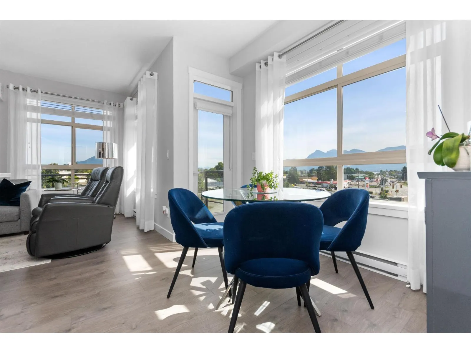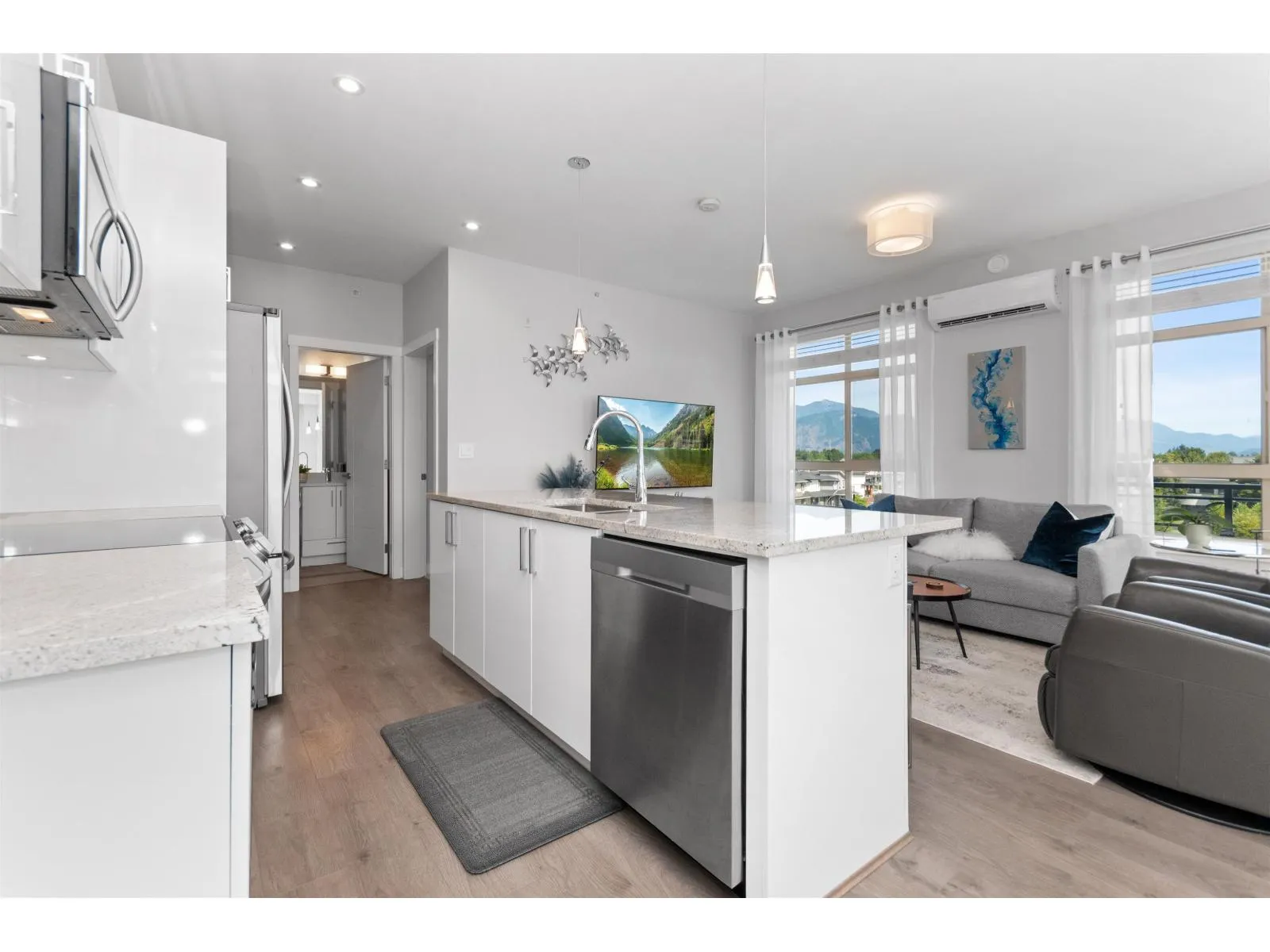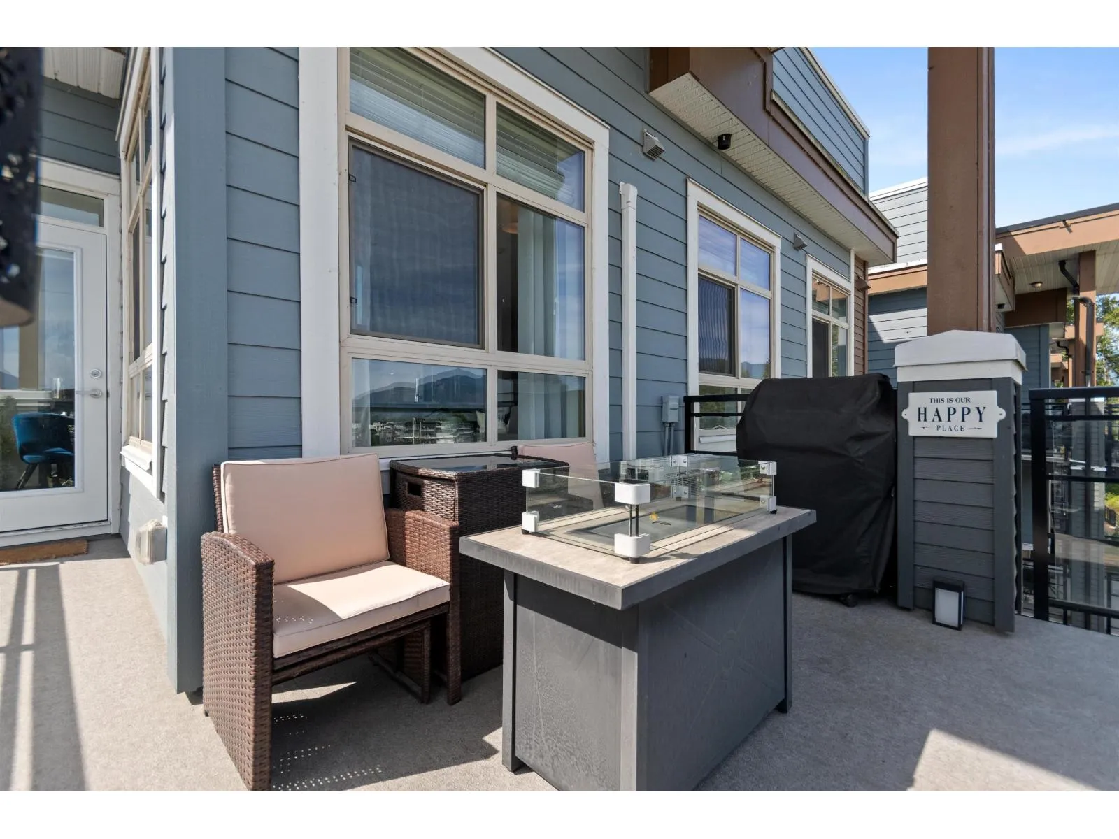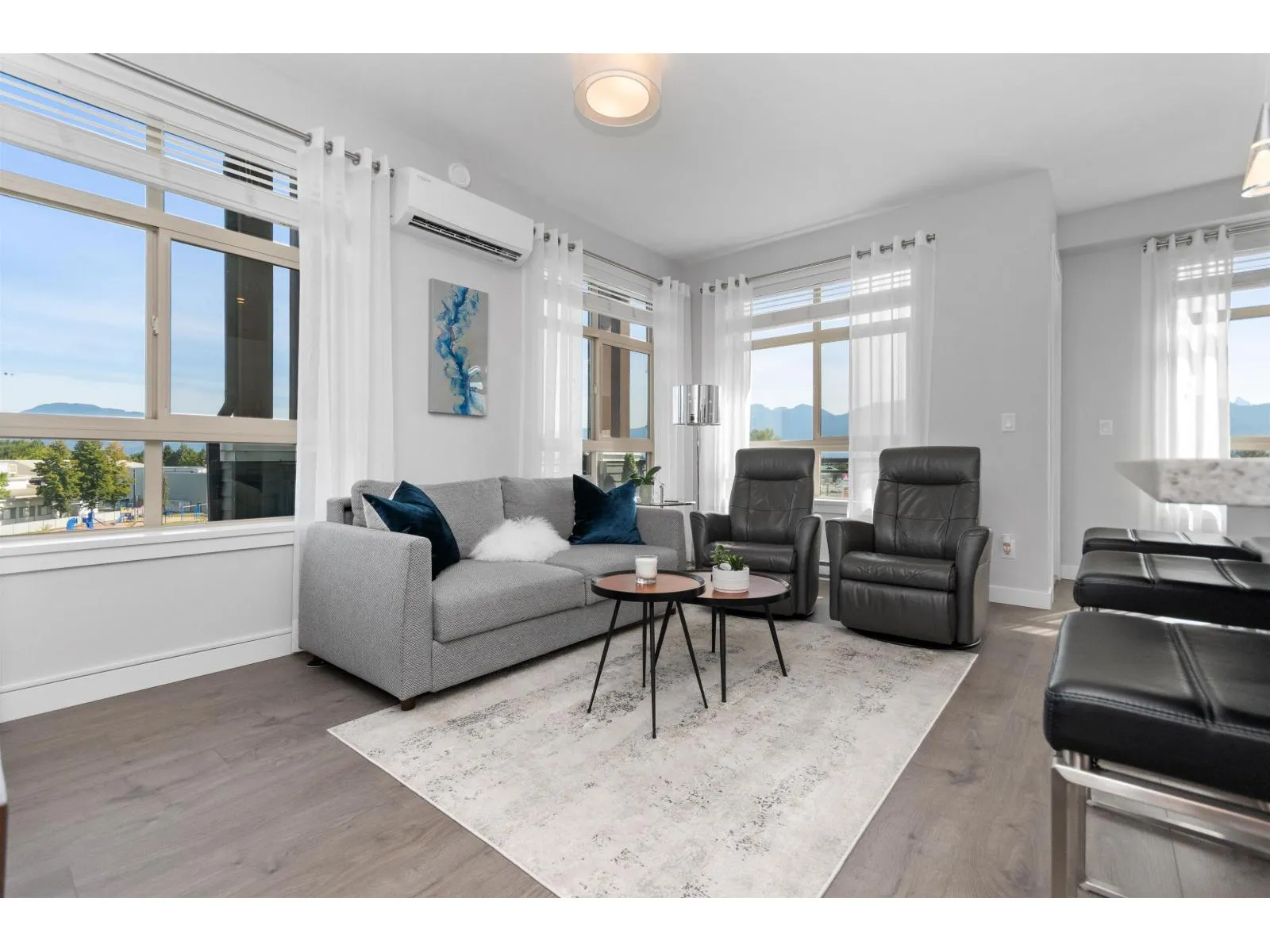 TOP FLOOR, CORNER UNIT, W/ AIR CONDITIONING! This incredible unit is one of a kind in all of Chilliwack! With an abundance of windows, and north and east exposure, it offers spectacular mountain views not just out of every window, but off the spacious corner deck. Inside, this 2bdrm 2 bth unit has been spotlessly maintained and shows pride of ownership. Ductless unit keeps the space cool in the summer, and warm in the winter, saving on electrical heat. Being top floor you get to enjoy the peace of having no one above, and only 1 neighboring unit beside you.This fabulous building offers a private earthy sitting space to embrace, walk around paths with benches on the elevated 1st floor, and a roof top deck best enjoyed with company! Rare 2 spot OWNED parking stalls in the secure UG parking. * PREC - Personal Real Estate Corporation (id:27476)