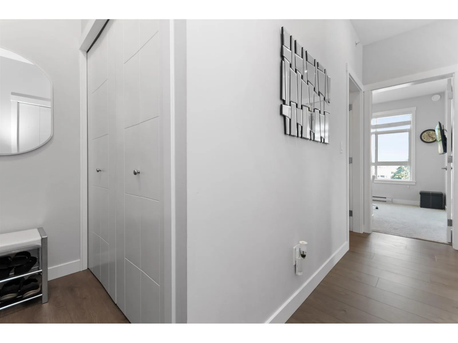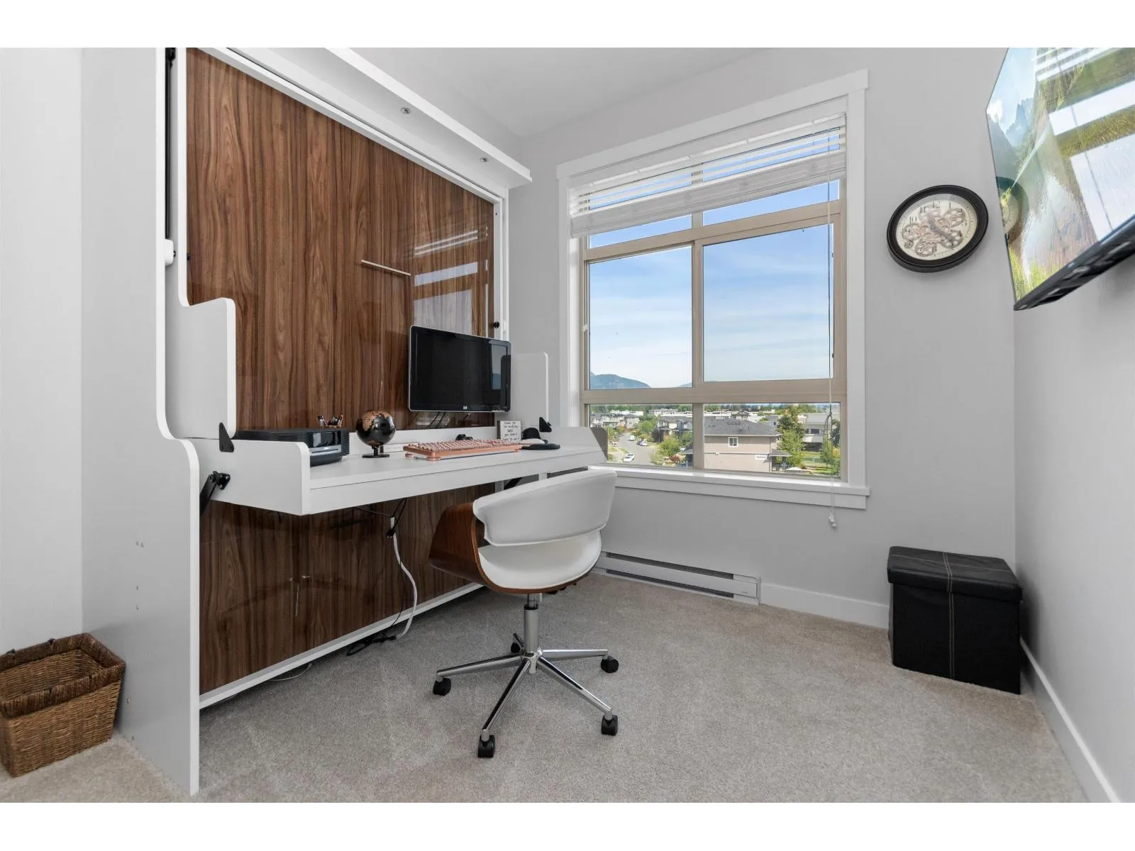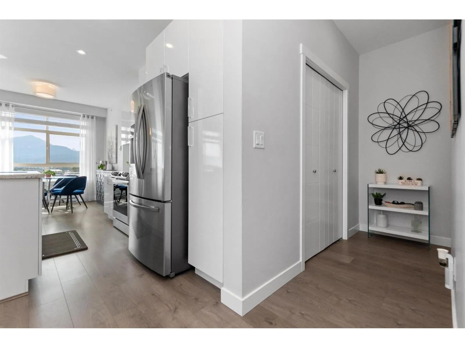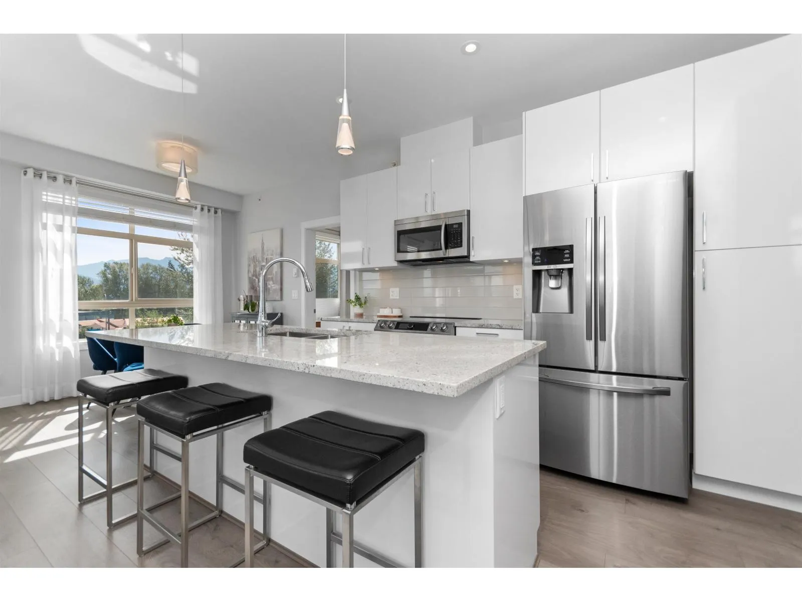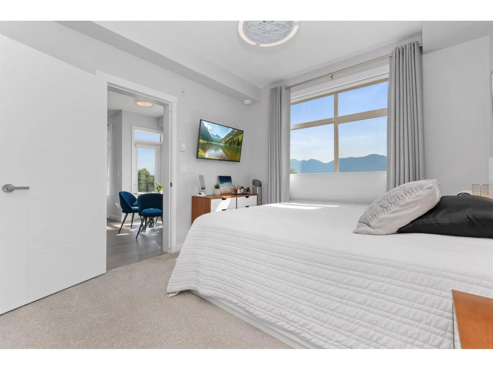 TOP FLOOR, CORNER UNIT, W/ AIR CONDITIONING! This incredible unit is one of a kind in all of Chilliwack! With an abundance of windows, and north and east exposure, it offers spectacular mountain views not just out of every window, but off the spacious corner deck. Inside, this 2bdrm 2 bth unit has been spotlessly maintained and shows pride of ownership. Ductless unit keeps the space cool in the summer, and warm in the winter, saving on electrical heat. Being top floor you get to enjoy the peace of having no one above, and only 1 neighboring unit beside you.This fabulous building offers a private earthy sitting space to embrace, walk around paths with benches on the elevated 1st floor, and a roof top deck best enjoyed with company! Rare 2 spot OWNED parking stalls in the secure UG parking. * PREC - Personal Real Estate Corporation (id:27476)