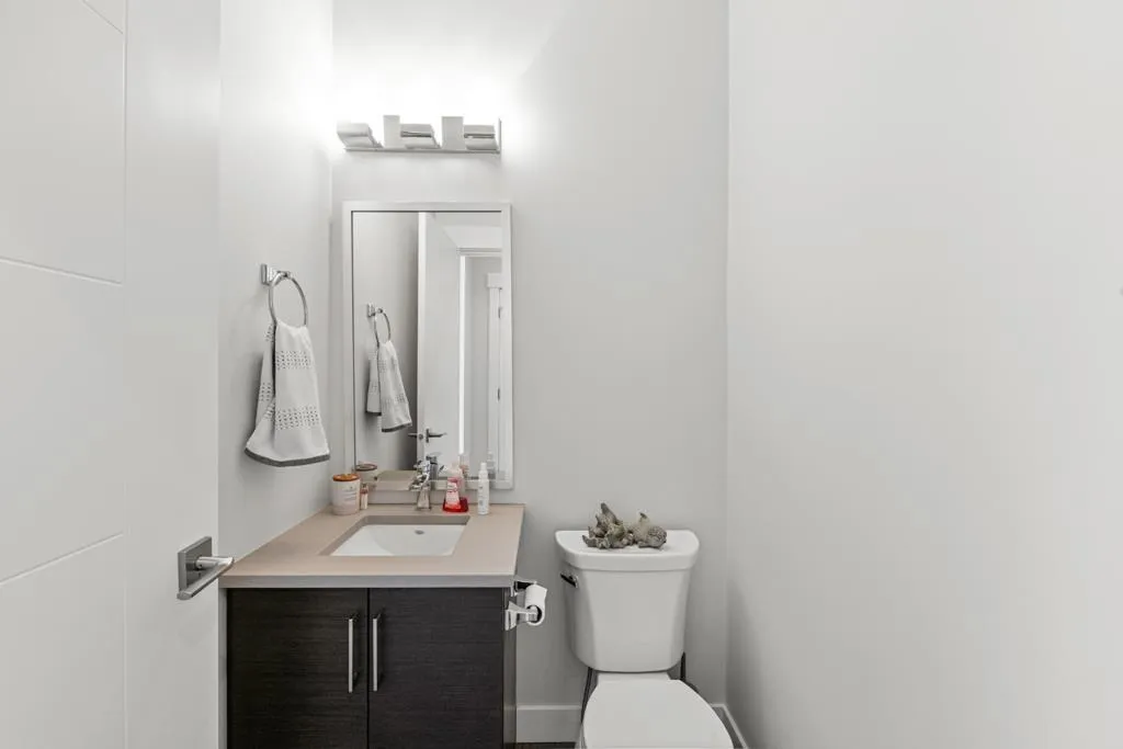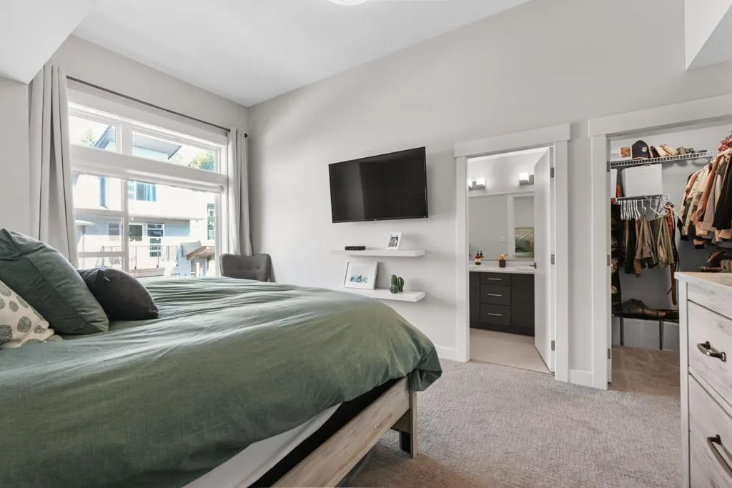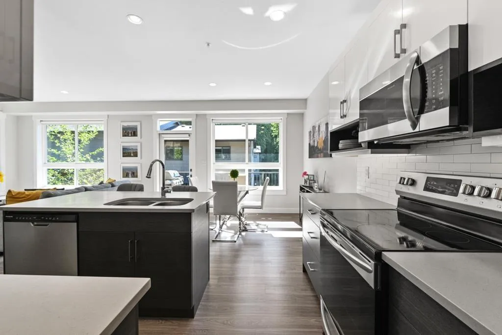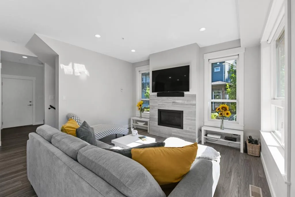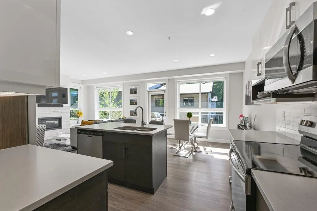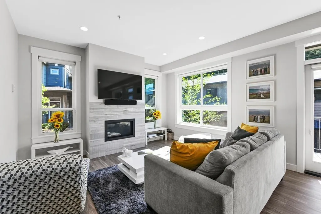 LOCATION LOCATION LOCATION. This home is not only modern, but it also has a wonderful floor plan allowing the home to be very spacious. This END UNIT 3 bed, 3 bath home features central AC, modern kitchen with white cabinetry, quartz countertops, an island, good sized pantry, and large windows making the home very bright with an abundance of natural light. Upstairs features a large Primary Bedroom with w/i closet, a beautiful ensuite, and 11 ft ceiling, large laundry room, a flex area (could be office), and 2 good sized bedrooms. Downstairs features a huge recroom with projector and surround sound, and ample storage. Covered patio and large sundeck with natural gas hookup. Easy freeway access but away from all the city noise. Hurry on this one! (id:27476)