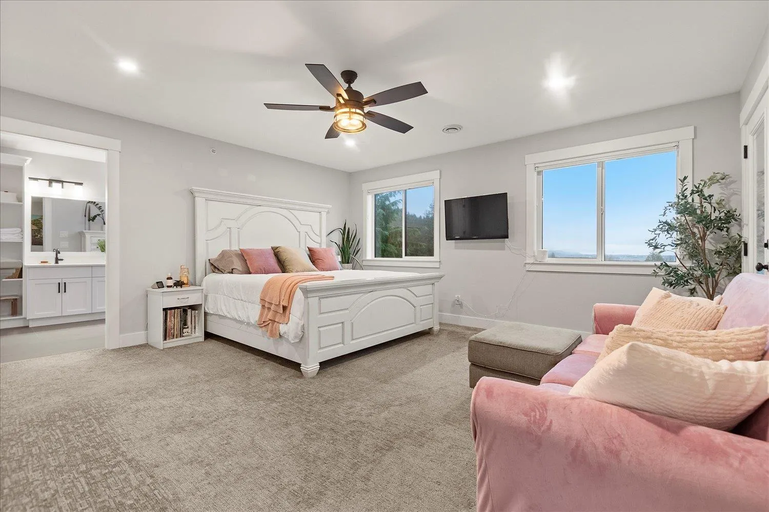 Nestled in the eastern Hillsides community of "Aspen Woods" is this beautiful family home with a VIEW! Tucked in a quiet cul-de-sac, just steps to nature trails, this home boasts unobstructed VIEWS of the local MOUNTAINS & VALLEY. Take in breathtaking SUNSETS from your living room, dining table & kitchen or retreat outside to enjoy one of two VIEW DECKS off your primary bedroom or main floor. FEATURES include engineered hardwood, AIR CONDITIONING, quartz counters, gas range, walk-in pantry, custom coffee bar, luxurious primary spa bathroom, covered front porch, covered lower patio & gazebo. Ideal home for a large or growing family! Downstairs has additional bedroom, full bathroom & huge open family room area. Potential to add a 2 bedroom SUITE w/ separate laundry & exterior entrance! * PREC - Personal Real Estate Corporation (id:27476)