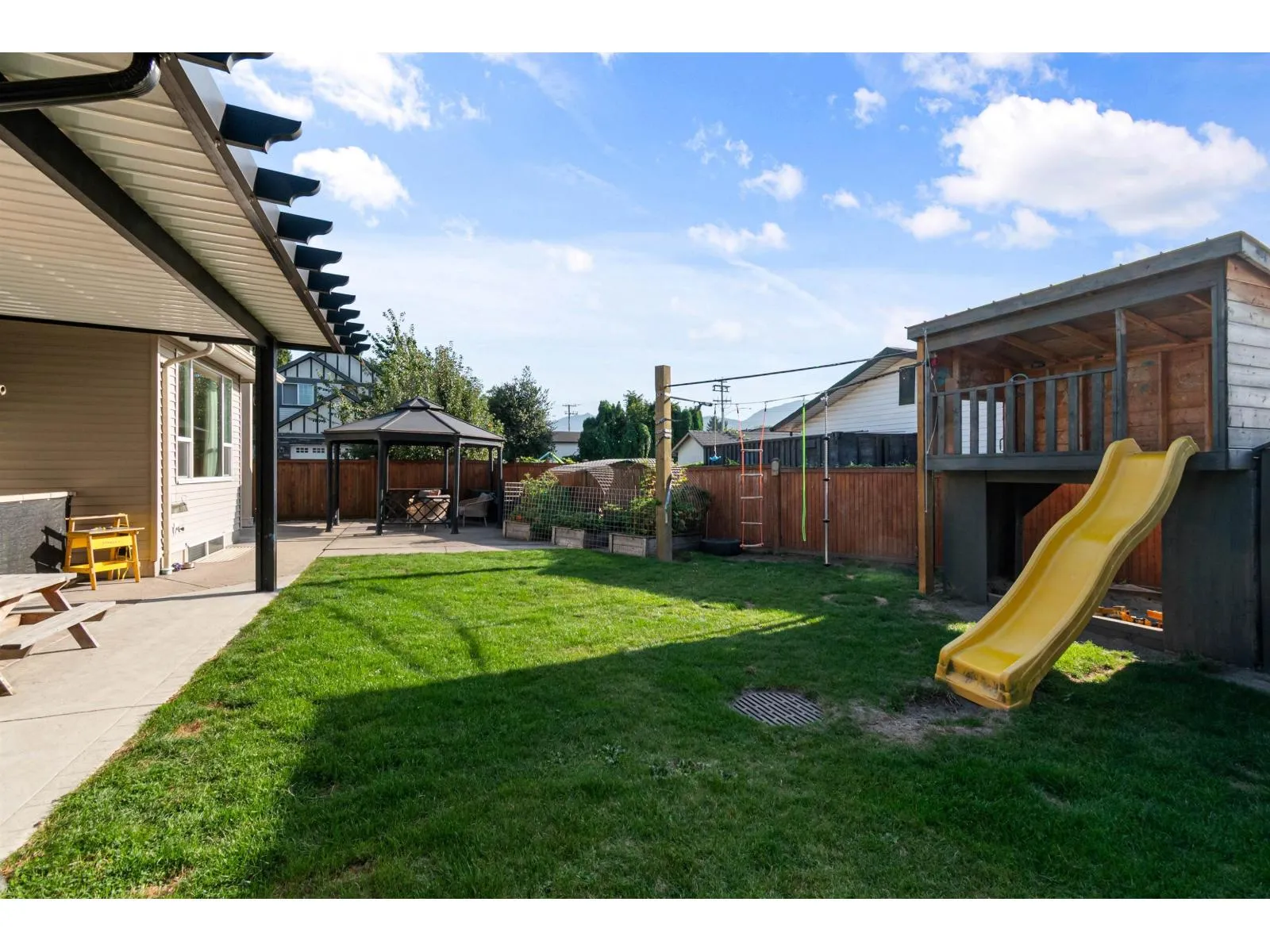Welcome to this beautifully maintained 6 bedroom, 4 bathroom home, including 2 bedroom plus den suite, ideally located on a quiet crescent in desirable Sardis Park. The open-concept main living area is highlighted by vaulted ceilings, a striking rock fireplace, hardwood floors and a well designed kitchen boasts shaker cabinets, granite countertops and a huge island! The brand new laundry/entryway from the garage is every family's dream! A generous lot features a fully fenced yard, a large gazebo for outdoor entertaining, a children's play area, and raised garden boxes, plus ample parking with space for an RV. Walking distance to all levels of school and centrally located close to shopping and recreation, this is the perfect family home! (id:27476)