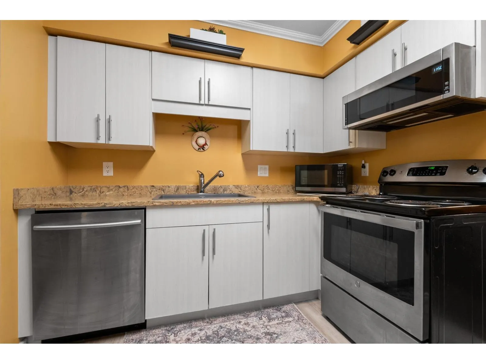 Welcome to the desirable community of Elmwood Terrace! Centrally located near shopping and services, this spacious 2 bed, 2 bath home is fully renovated and move-in ready. Updates include new paint, flooring, lighting, a modern kitchen with quartz counters and stainless steel appliances, updated bathrooms, and crown molding. This 55+ community offers secure underground parking and ample storage. Enjoy a bright south-facing enclosed sunroom with stunning mountain views. Amenities include a meeting room, exercise room, library/billiards room, and workshop. Plus, a vehicle wash area, abundant visitor parking, and beautifully landscaped grounds. (id:27476)