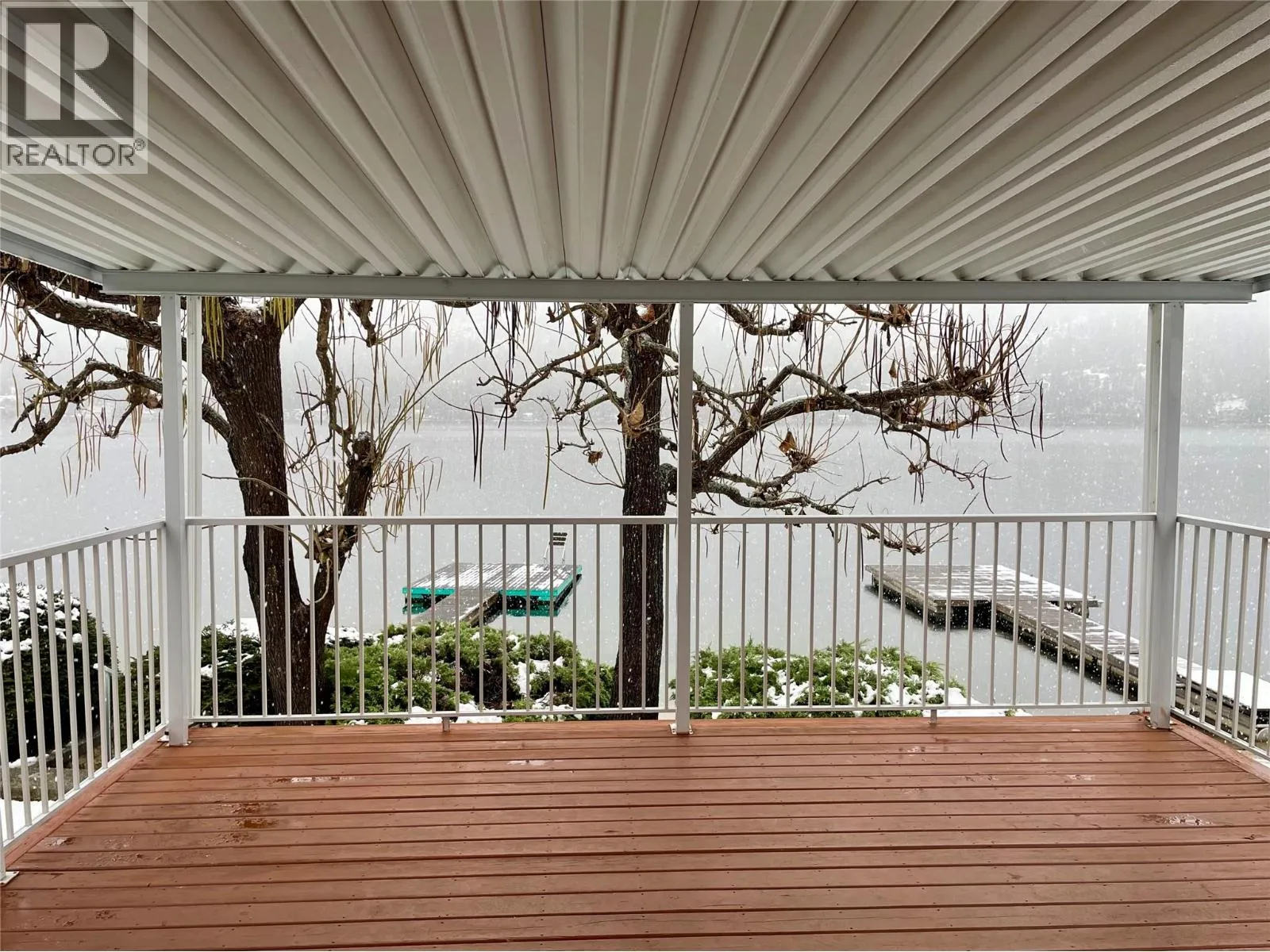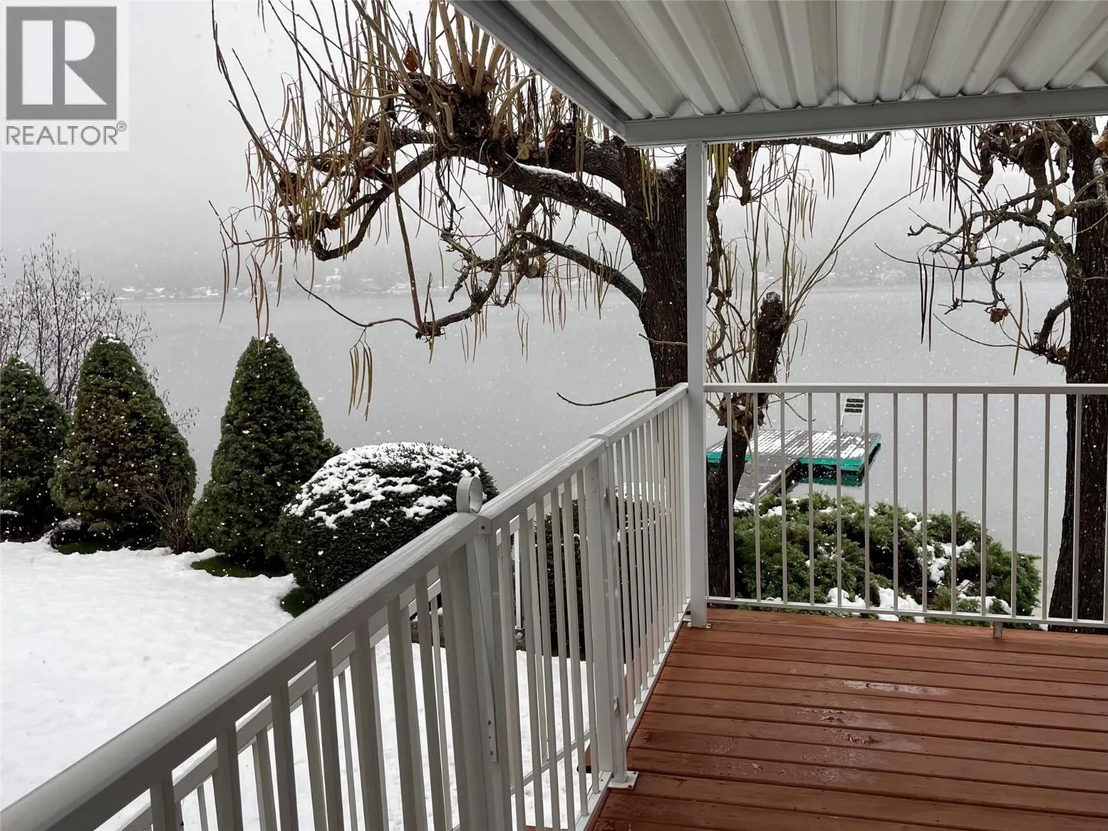 Discover the quintessential Christina Lake lifestyle: a rare, turn-key waterfront retreat! Strategically positioned on Lavalley Point, this rancher possesses highly coveted sandy beach access on a quiet, dead-end cul-de-sac. Ready for year-round living, this property offers the rarely found trifecta of privacy, prime lake access, and walkable convenience to local amenities. The 0.19 ac property is an absolute gem, featuring a flat lot with approximately 60 feet of pristine lake frontage. Your lakeside sanctuary awaits inside this well-maintained 1,260 sq. ft., 2-bed, 2-bath home. Built in 1977, the design maximizes views, offering unobstructed panoramas of the water from the primary bedroom, living room, and kitchen. Step onto the expansive covered deckâthe perfect spot for morning coffeeâwhere gentle stairs descend directly to the manicured lawn and just a few more steps deliver you to the sandy beach. Completing this package is the ultimate in lake convenience: a private dock ready for swimming and boat moorage, plus an attached garage ideal for secure vehicle parking and storing all your essential lake toys. Practical features, including a dedicated garden plot and large shed, ensure every outdoor need is met. Contact your agent today to book an in-person showing or request a convenient live virtual walk-through if you are an out-of-area buyer. Come home to the Lake! (id:27476)
