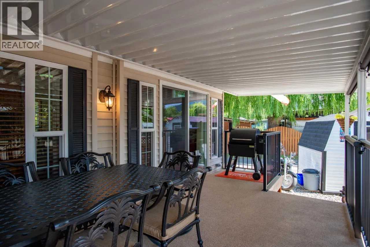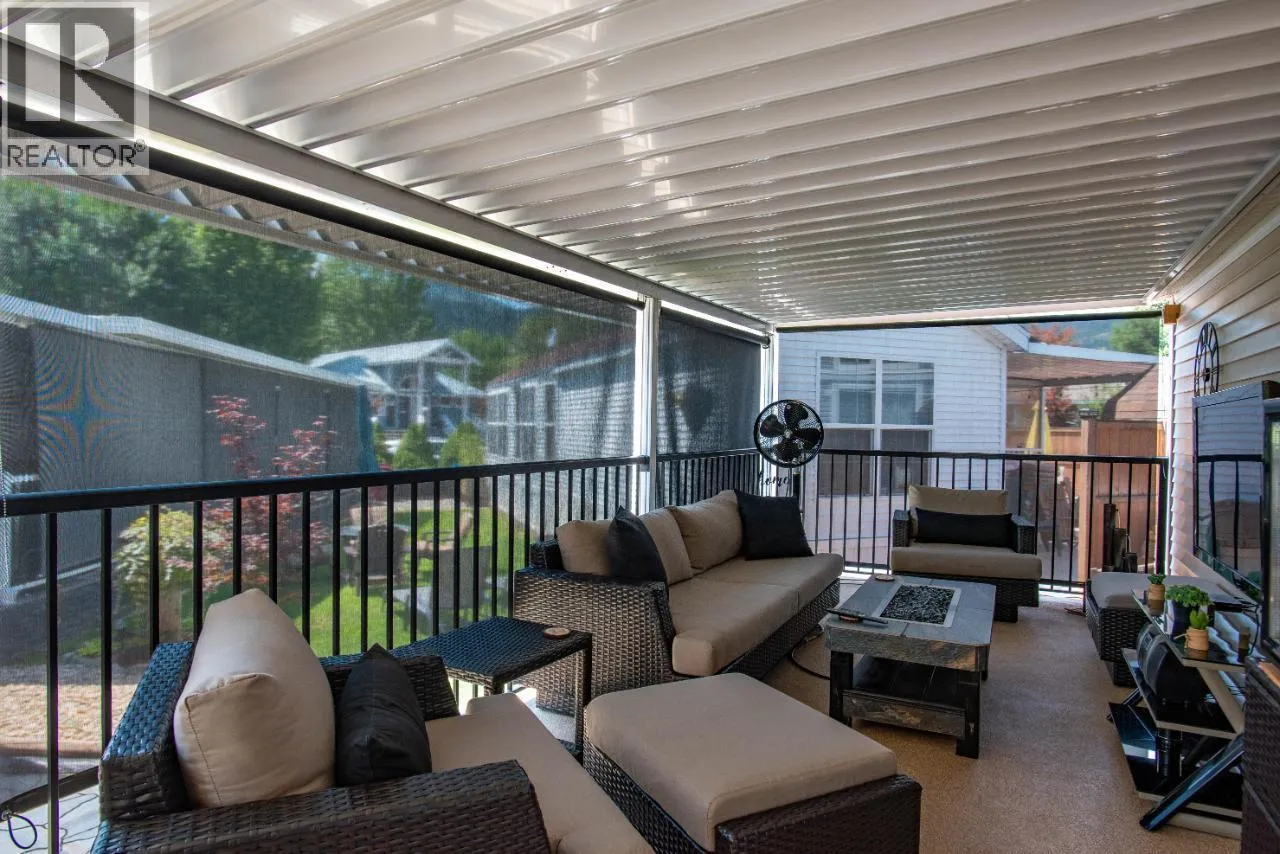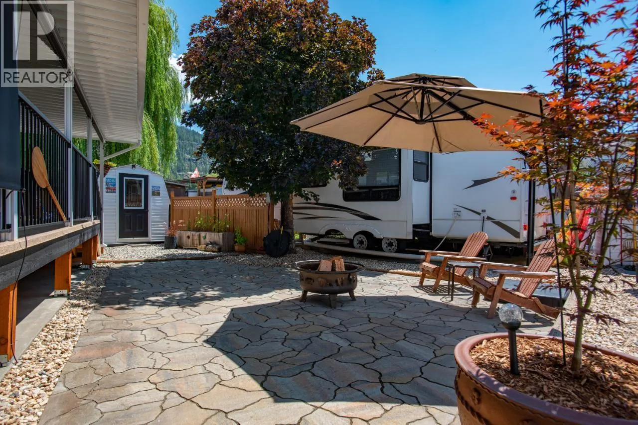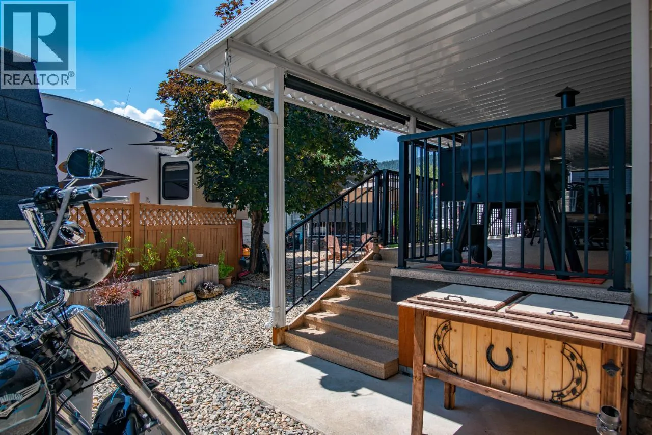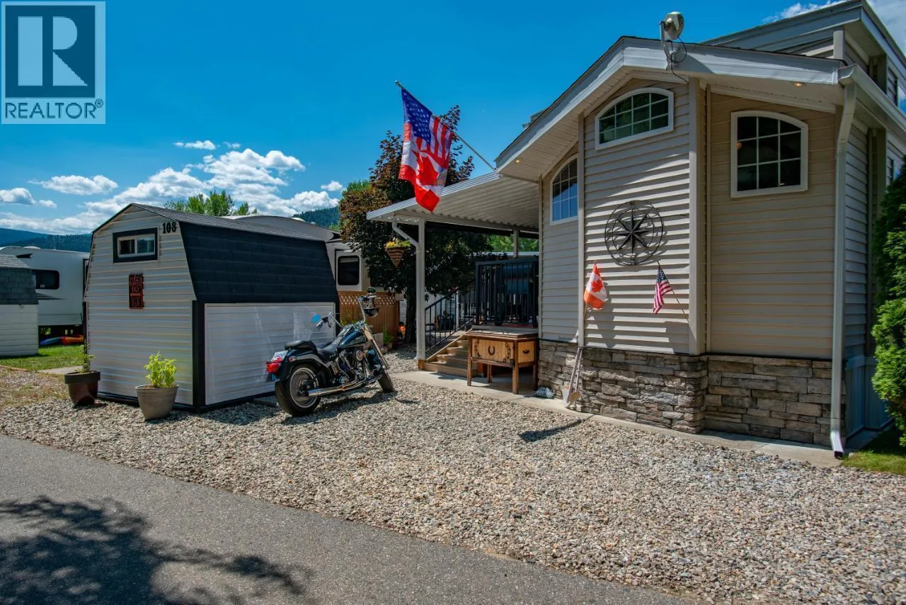#108 1835 Bakery Frontage Road, Christina Lake, in Lakeside Resort is steps away from the beach and offers one of the best lots in the resort! Outside offers a newly developed custom deck with high end blinds and railings, stone patio area, and large shed for storage. With the ability to entertain inside or outside perfectly throughout the summer. Inside is immaculately kept and offers a large king master suite, bathroom with walk in shower and tons of storage, beautiful kitchen with a gas stove and a large living room. The living room also has a divider that can separate it for an additional bedroom. This home is mechanically sound and offers forced air and central air throughout, perfect for hot summers and cool spring fall time. Park model is included in the sale. And all furnishings inside and outside are included! This resort runs from early March to end of October. Many amenities such as Shower/Laundry facility, Rec Hall, off-leash pet areas, two docks and opportunity to get your own slip, storage for your boards/kayaks, and full time management! Also there is a beautiful quarter mile of sandy beaches with foreshore rights! This property includes exclusive use of lot of 108 in a shared interest of 35 shares. This property is nothing short of spectacular! Don't forget this property can be rented or used as a potential Air BNB for approx $200 a night. (id:27476)
