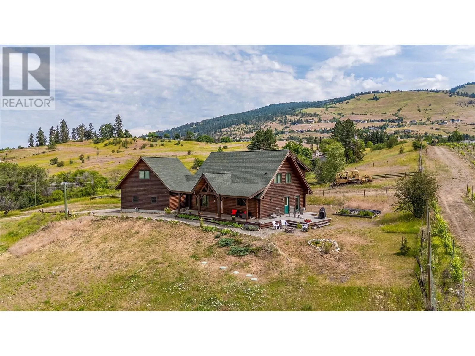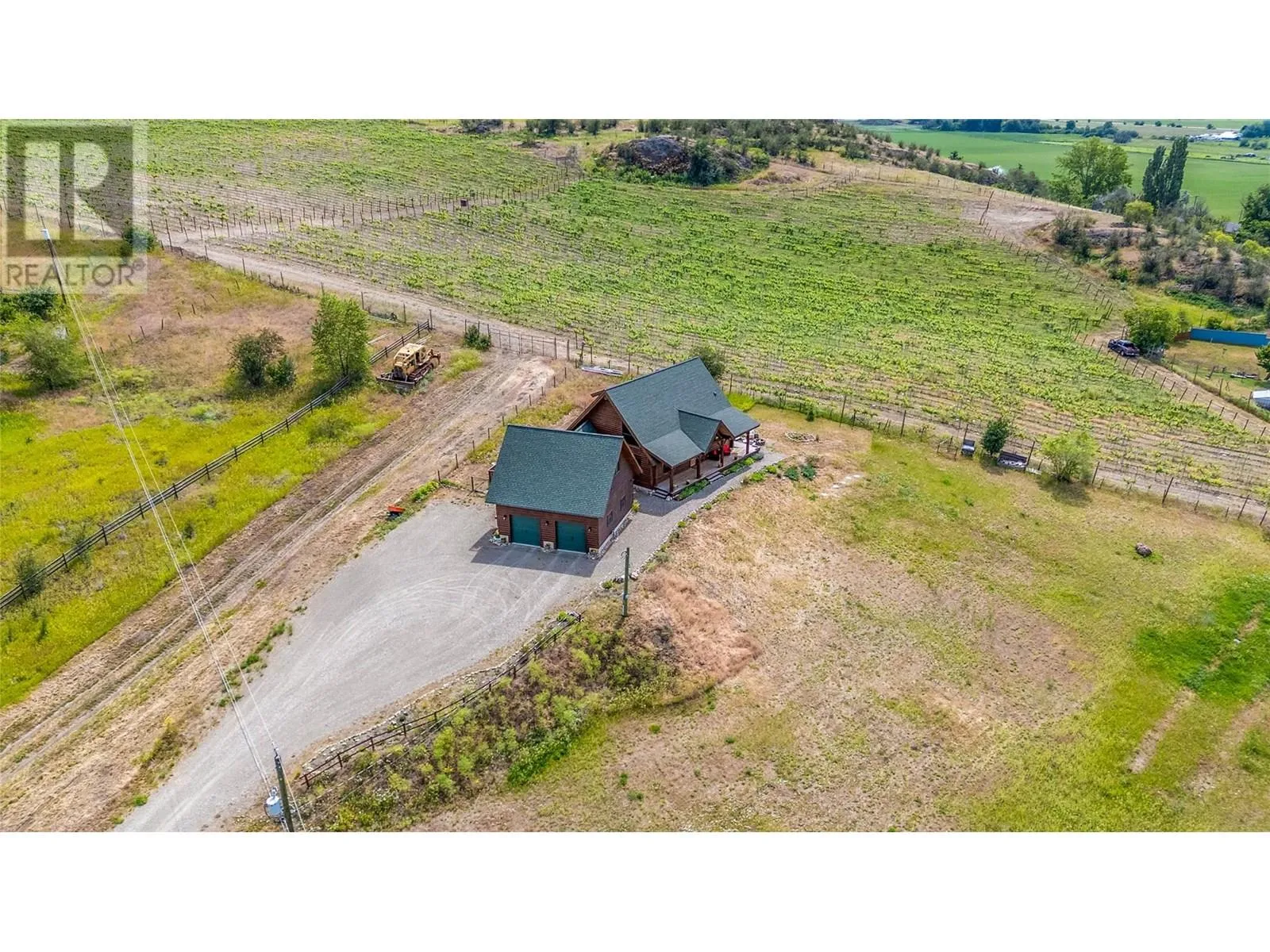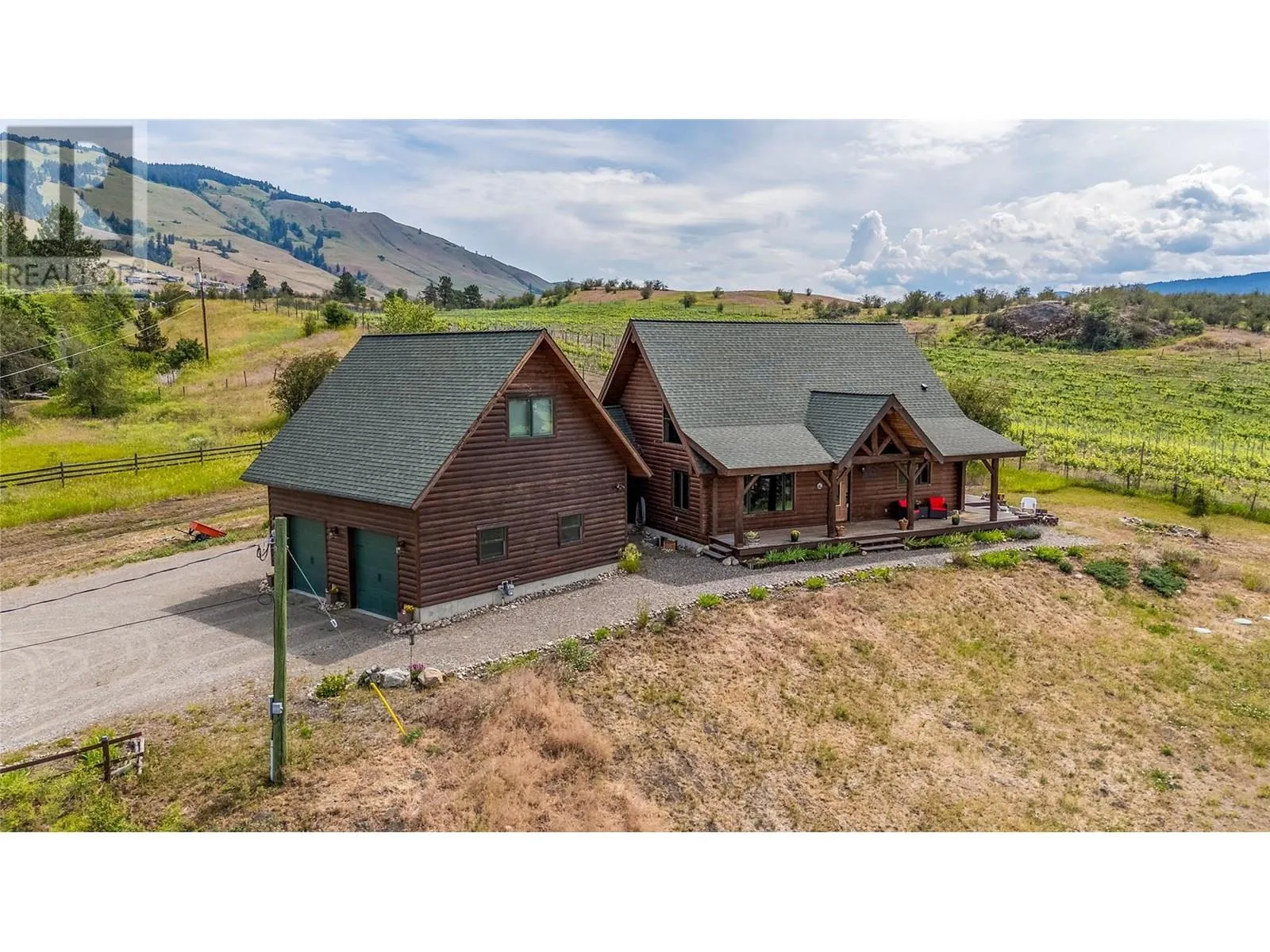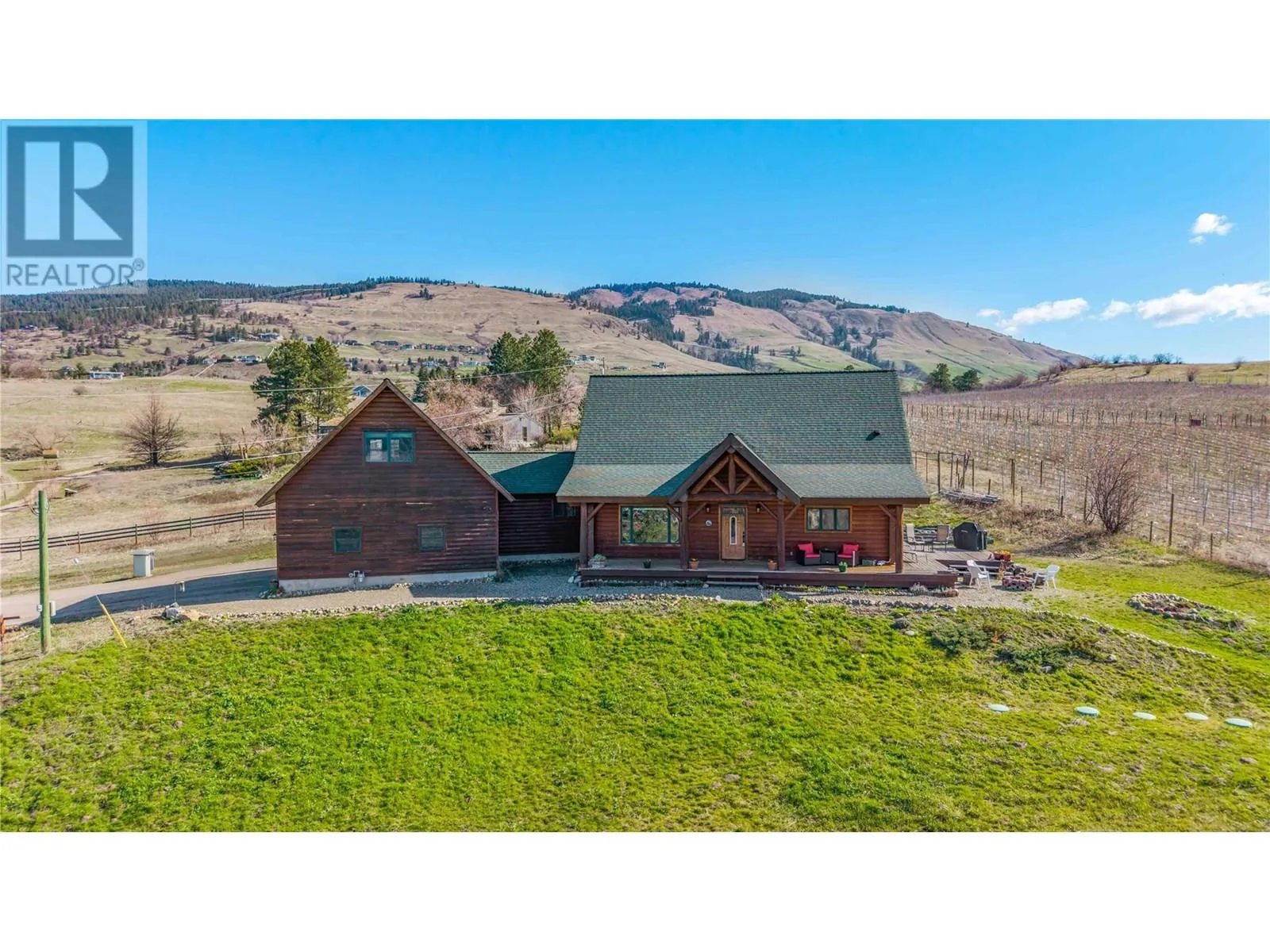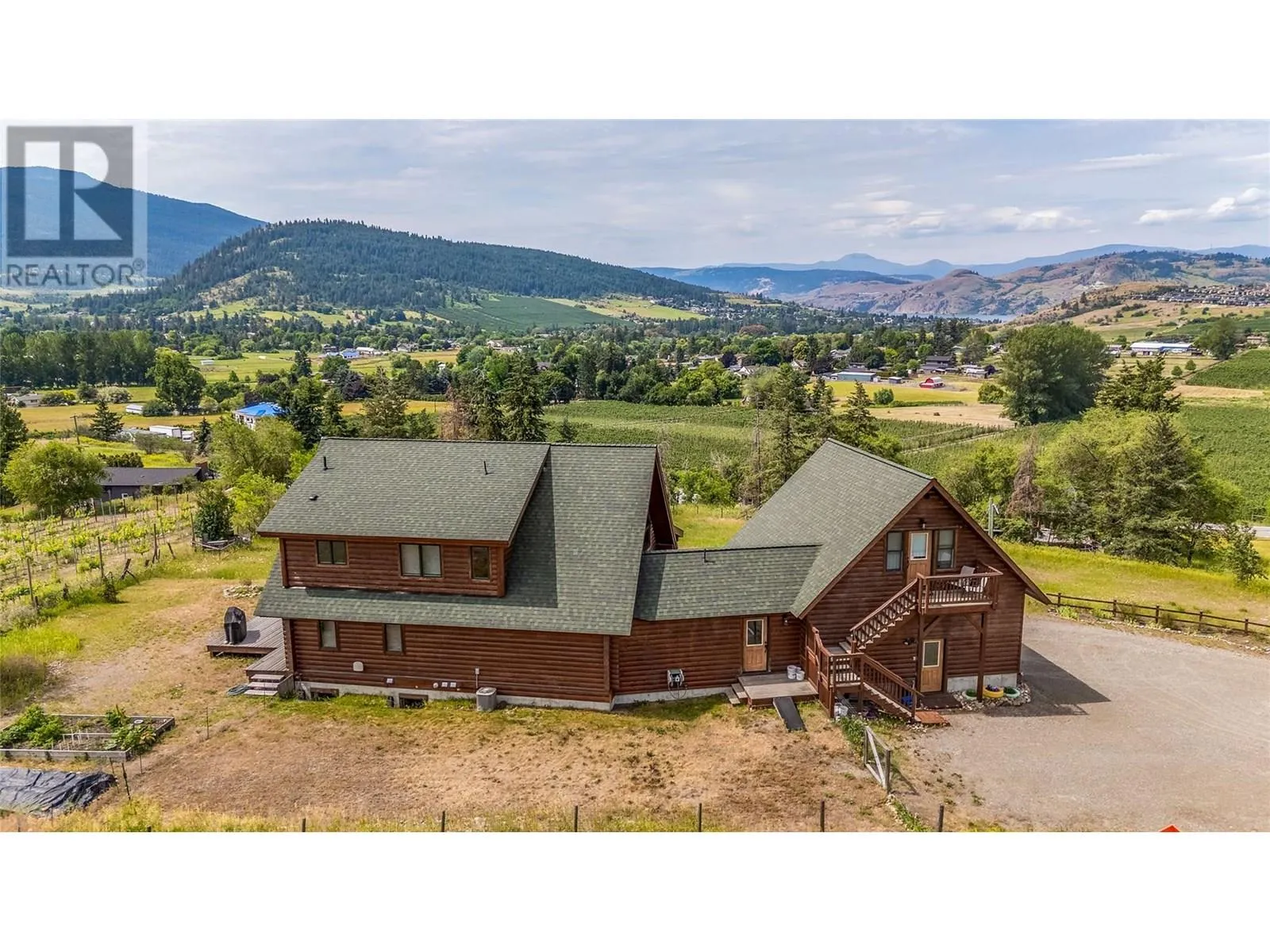Welcome to your dream home, nestled on 2.47 acres of gently sloping pasture with breathtaking views across the Coldstream Valley. Crafted from eight-inch milled logs, this home combines timeless character along with excellent insulation, creating a warm and inviting living space. The open-concept main level features a bright and spacious living room with soaring vaulted ceilings. The dining area is ideal for hosting family and friends. The kitchen is complete with maple cabinetry, 8 ft island, under-cabinet lighting & ample storage. A large main-floor bedroom offers flexibility as a primary suite for convenient one level living or as a home office/den. A full bathroom and laundry room complete this level. Upstairs, a sunlit loft overlooks the living room below & leads to a spacious primary bedroom, a walk-thru full bathroom, and a third bedroom. The loft landing provides a cozy spot to relax with a book or enjoy the view. The unfinished basement offers endless potential to create a rec room, home gym, or additional living space, with a roughed-in bathroom ready for future expansion. A detached double garage (26â4 x 26â1) provides plenty of space for vehicles and storage and is connected to the main home via an enclosed breezeway. A private studio suite above the garage is perfect for guests, a home office, or a lucrative Airbnb rental. Take in the stunning views, with a neighboring organic vineyard adding to the charm. This property offers the perfect blend of rural tranquility and modern living, all while being just a short drive from local amenities. (id:27476)