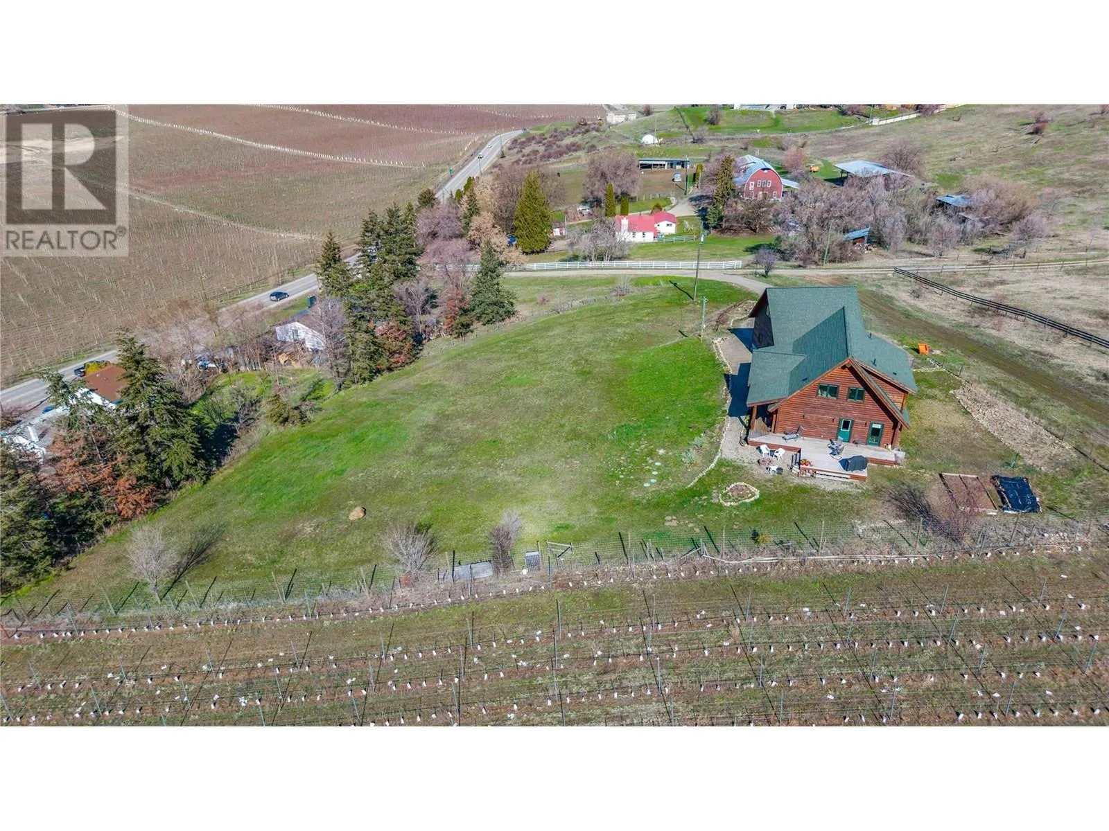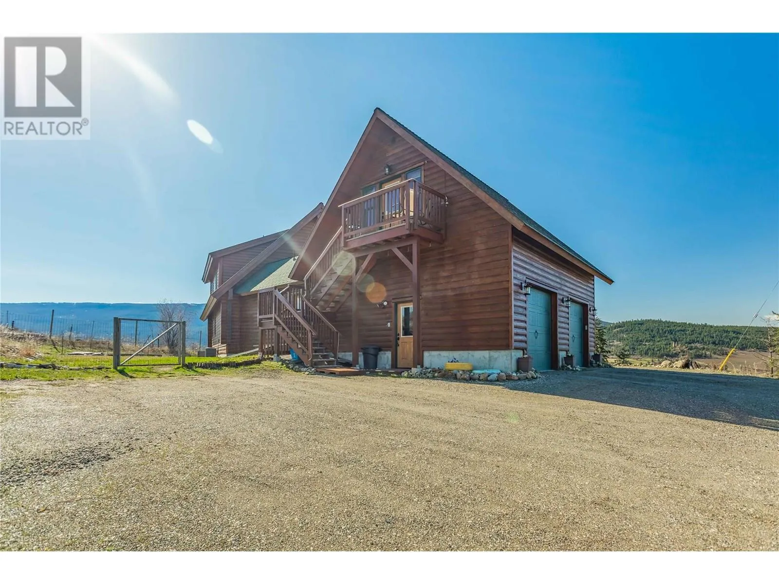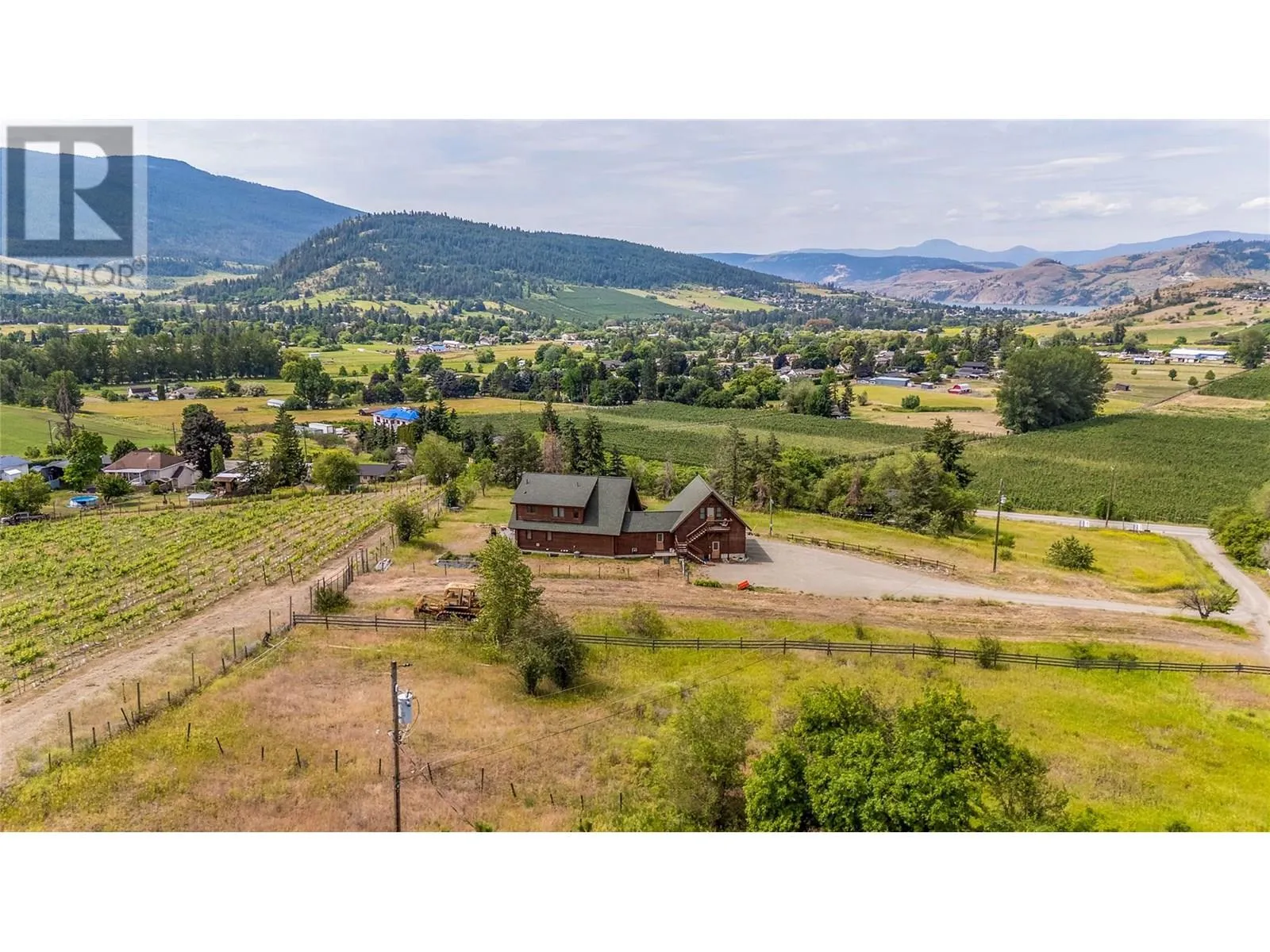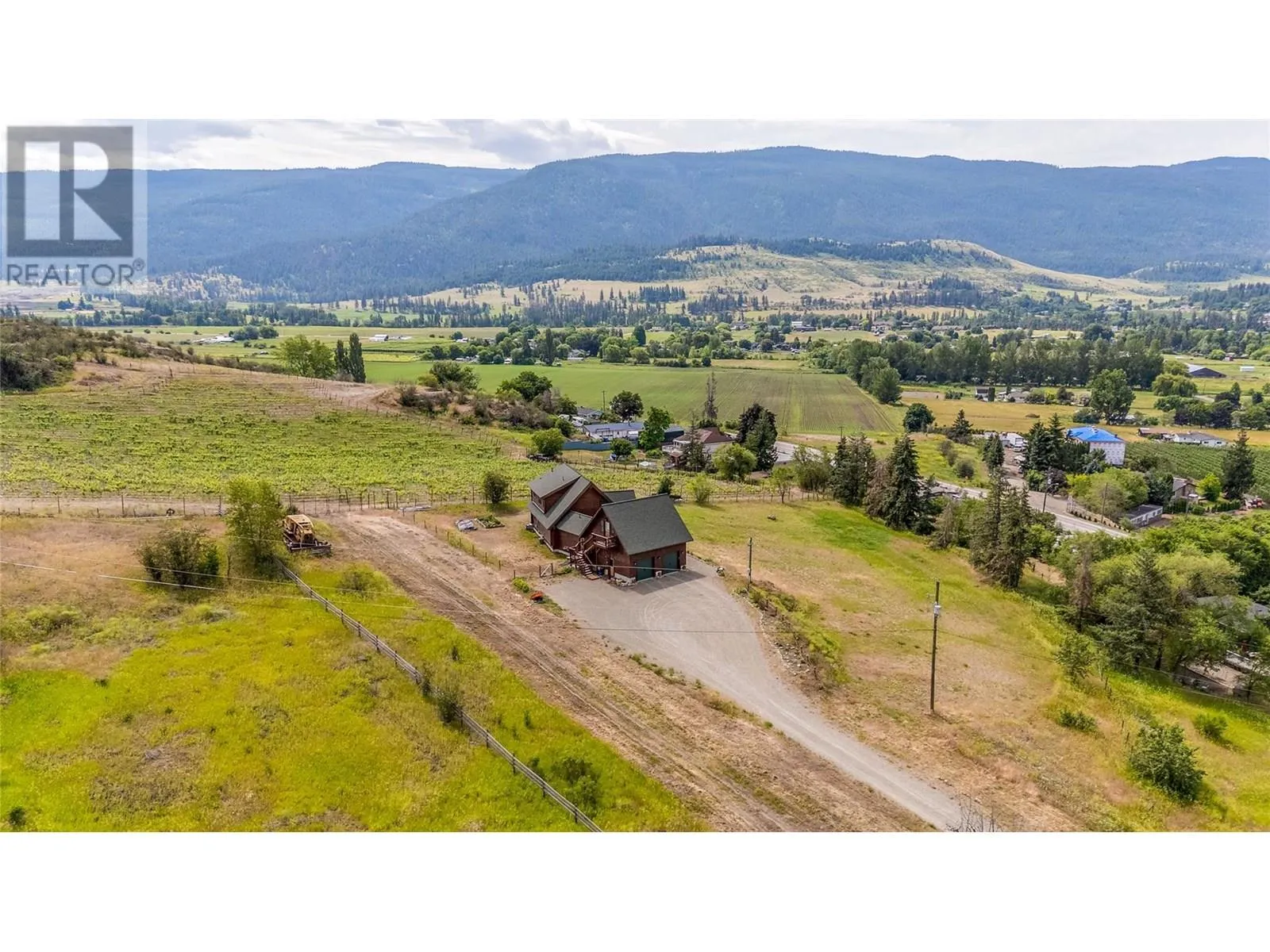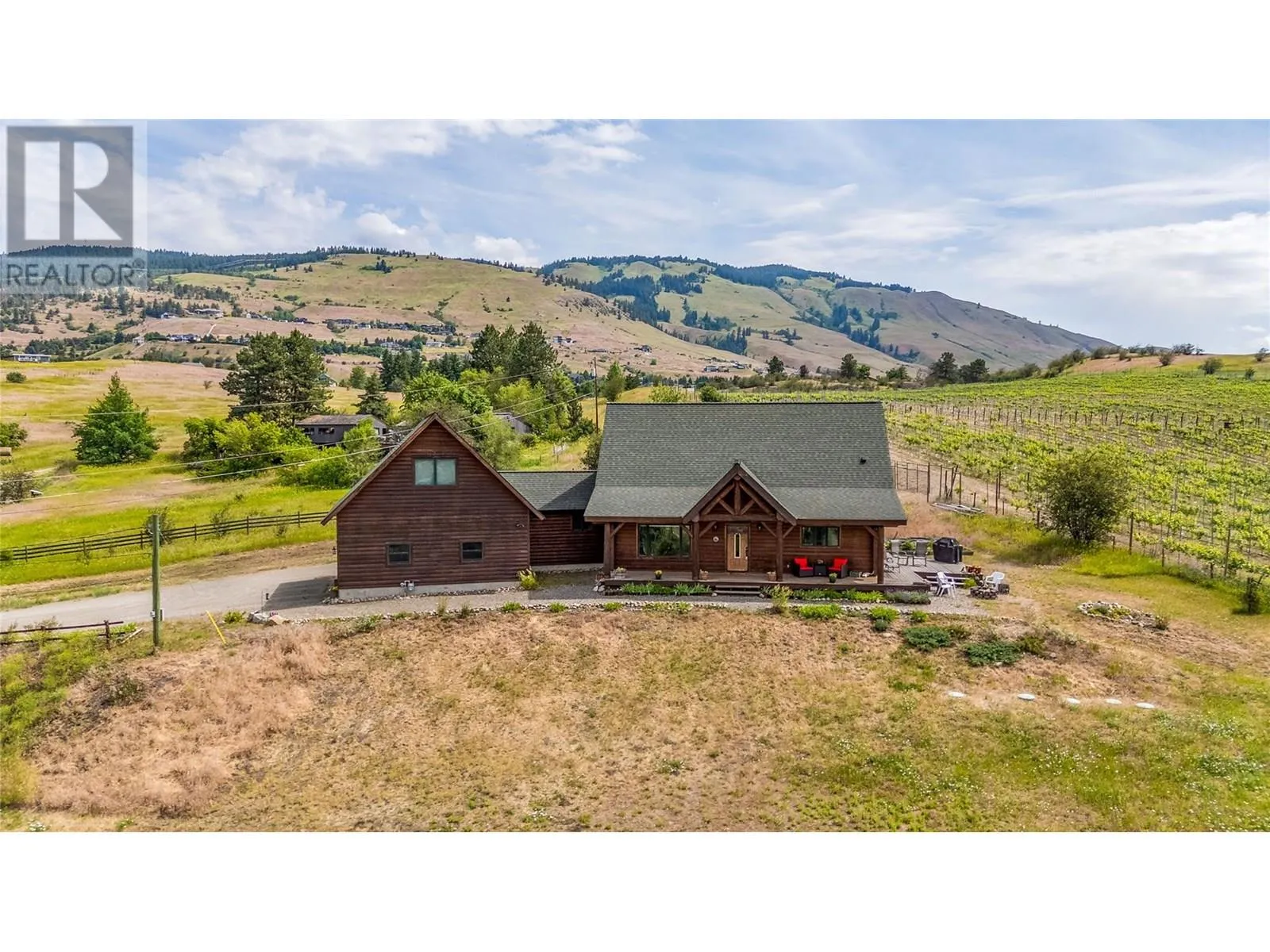 Welcome to your dream home, nestled on 2.47 acres of gently sloping pasture with breathtaking views across the Coldstream Valley. Crafted from eight-inch milled logs, this home combines timeless character along with excellent insulation, creating a warm and inviting living space. The open-concept main level features a bright and spacious living room with soaring vaulted ceilings. The dining area is ideal for hosting family and friends. The kitchen is complete with maple cabinetry, 8 ft island, under-cabinet lighting & ample storage. A large main-floor bedroom offers flexibility as a primary suite for convenient one level living or as a home office/den. A full bathroom and laundry room complete this level. Upstairs, a sunlit loft overlooks the living room below & leads to a spacious primary bedroom, a walk-thru full bathroom, and a third bedroom. The loft landing provides a cozy spot to relax with a book or enjoy the view. The unfinished basement offers endless potential to create a rec room, home gym, or additional living space, with a roughed-in bathroom ready for future expansion. A detached double garage (26â4 x 26â1) provides plenty of space for vehicles and storage and is connected to the main home via an enclosed breezeway. A private studio suite above the garage is perfect for guests, a home office, or a lucrative Airbnb rental. Take in the stunning views, with a neighboring organic vineyard adding to the charm. This property offers the perfect blend of rural tranquility and modern living, all while being just a short drive from local amenities. (id:27476)