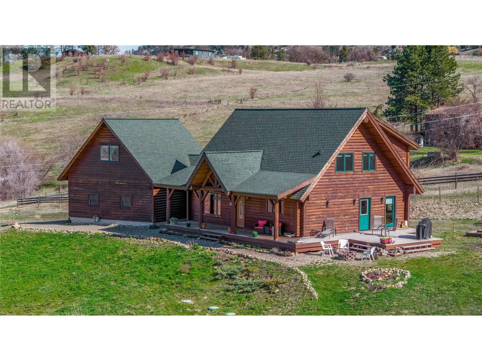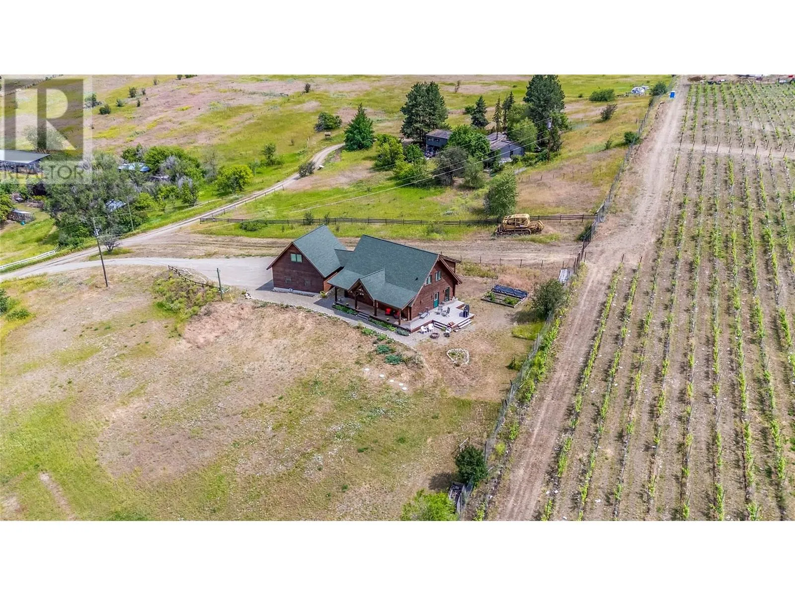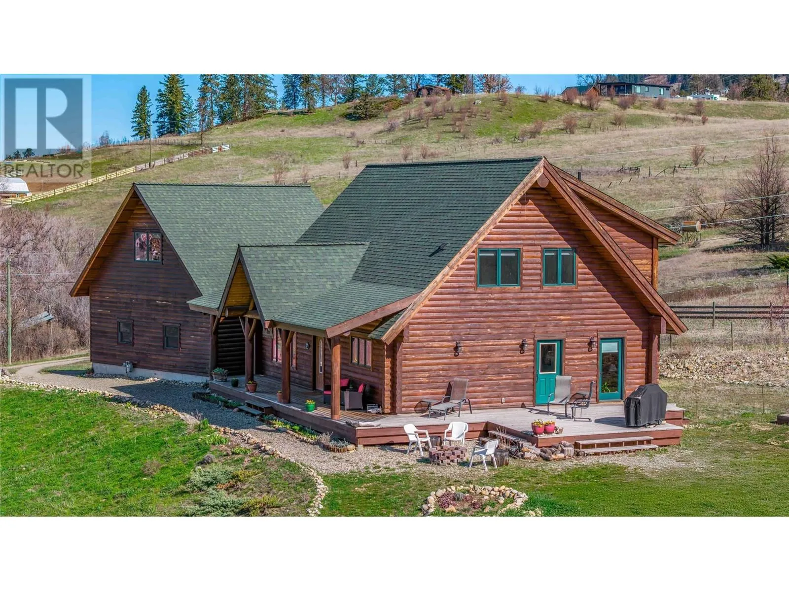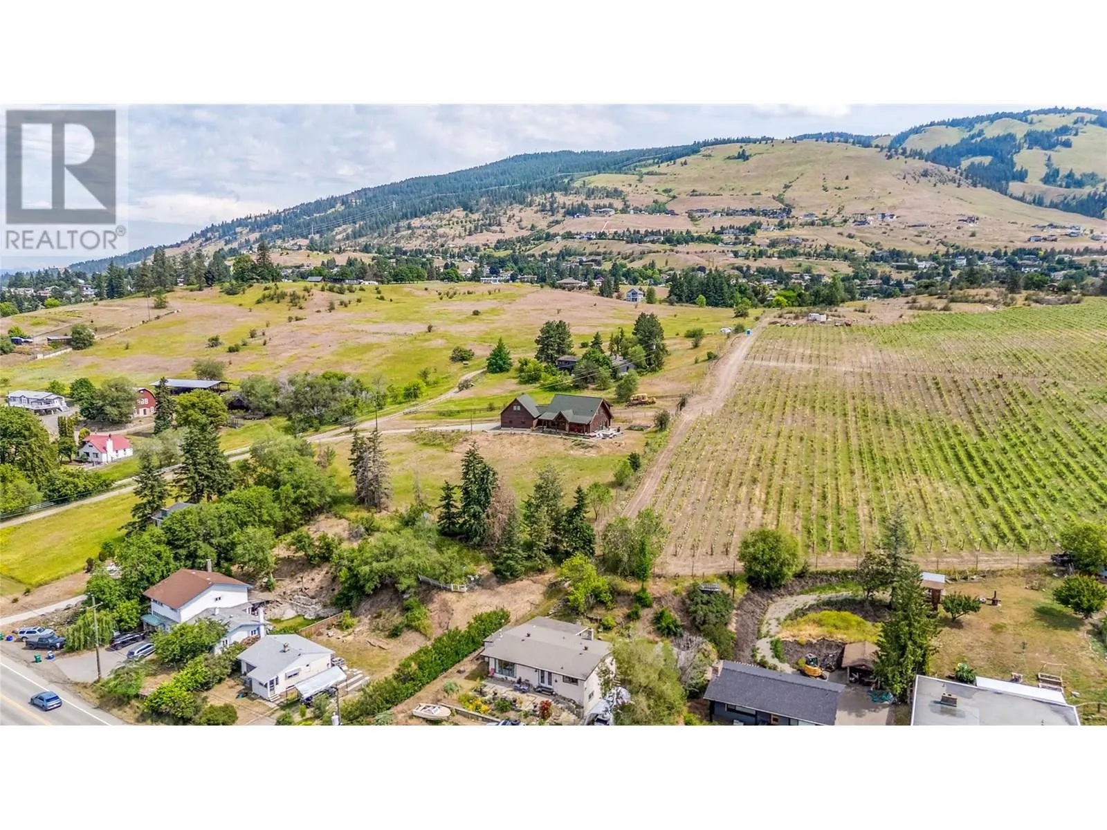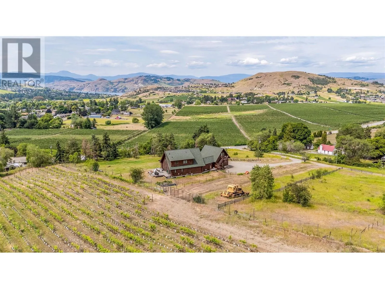 Welcome to your dream home, nestled on 2.47 acres of gently sloping pasture with breathtaking views across the Coldstream Valley. Crafted from eight-inch milled logs, this home combines timeless character along with excellent insulation, creating a warm and inviting living space. The open-concept main level features a bright and spacious living room with soaring vaulted ceilings. The dining area is ideal for hosting family and friends. The kitchen is complete with maple cabinetry, 8 ft island, under-cabinet lighting & ample storage. A large main-floor bedroom offers flexibility as a primary suite for convenient one level living or as a home office/den. A full bathroom and laundry room complete this level. Upstairs, a sunlit loft overlooks the living room below & leads to a spacious primary bedroom, a walk-thru full bathroom, and a third bedroom. The loft landing provides a cozy spot to relax with a book or enjoy the view. The unfinished basement offers endless potential to create a rec room, home gym, or additional living space, with a roughed-in bathroom ready for future expansion. A detached double garage (26â4 x 26â1) provides plenty of space for vehicles and storage and is connected to the main home via an enclosed breezeway. A private studio suite above the garage is perfect for guests, a home office, or a lucrative Airbnb rental. Take in the stunning views, with a neighboring organic vineyard adding to the charm. This property offers the perfect blend of rural tranquility and modern living, all while being just a short drive from local amenities. (id:27476)