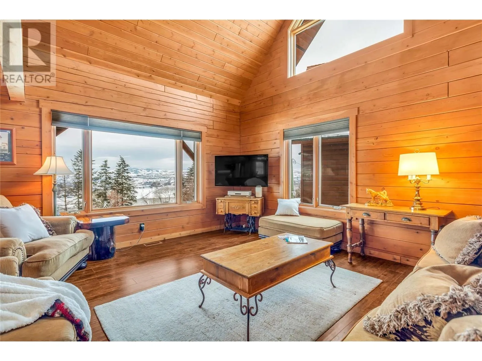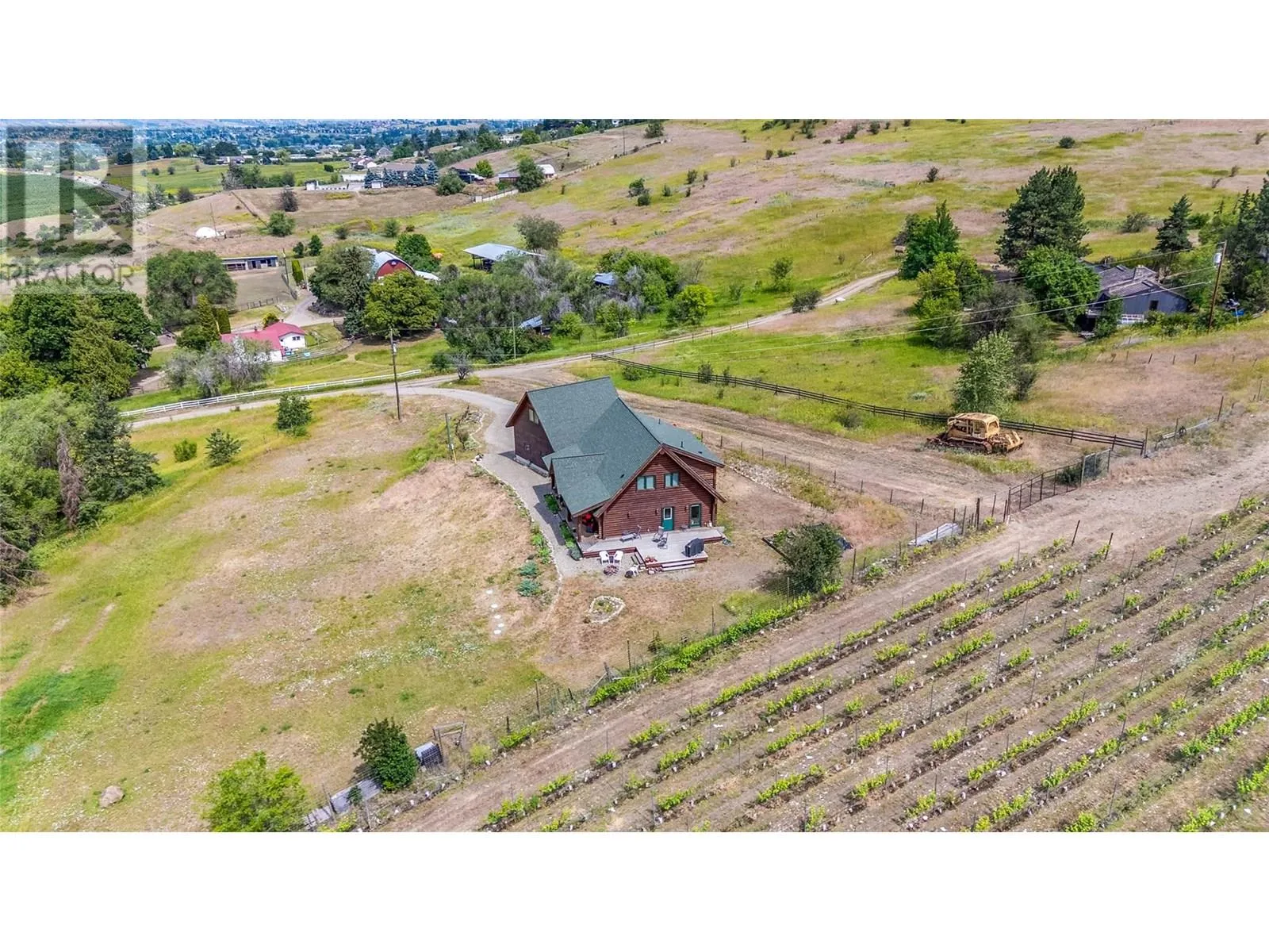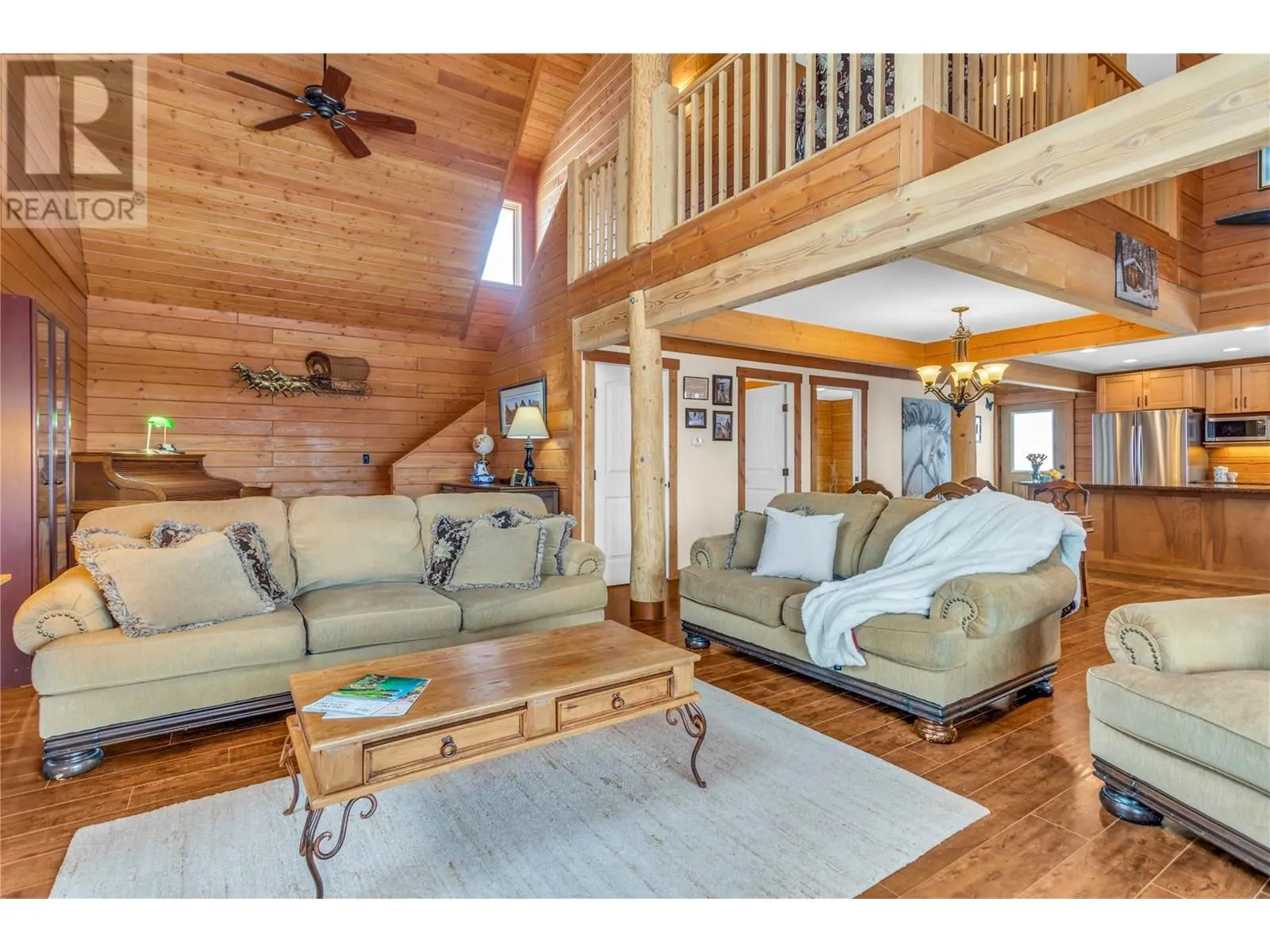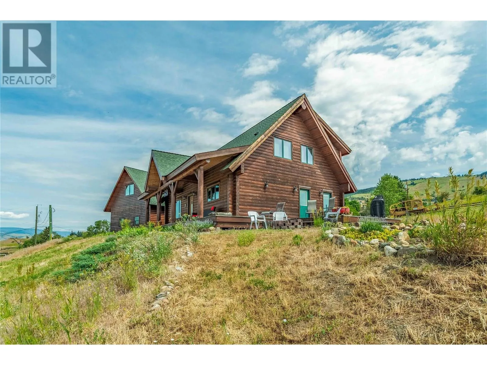 Welcome to your dream home, nestled on 2.47 acres of gently sloping pasture with breathtaking views across the Coldstream Valley. Crafted from eight-inch milled logs, this home combines timeless character along with excellent insulation, creating a warm and inviting living space. The open-concept main level features a bright and spacious living room with soaring vaulted ceilings. The dining area is ideal for hosting family and friends. The kitchen is complete with maple cabinetry, 8 ft island, under-cabinet lighting & ample storage. A large main-floor bedroom offers flexibility as a primary suite for convenient one level living or as a home office/den. A full bathroom and laundry room complete this level. Upstairs, a sunlit loft overlooks the living room below & leads to a spacious primary bedroom, a walk-thru full bathroom, and a third bedroom. The loft landing provides a cozy spot to relax with a book or enjoy the view. The unfinished basement offers endless potential to create a rec room, home gym, or additional living space, with a roughed-in bathroom ready for future expansion. A detached double garage (26â4 x 26â1) provides plenty of space for vehicles and storage and is connected to the main home via an enclosed breezeway. A private studio suite above the garage is perfect for guests, a home office, or a lucrative Airbnb rental. Take in the stunning views, with a neighboring organic vineyard adding to the charm. This property offers the perfect blend of rural tranquility and modern living, all while being just a short drive from local amenities. (id:27476)