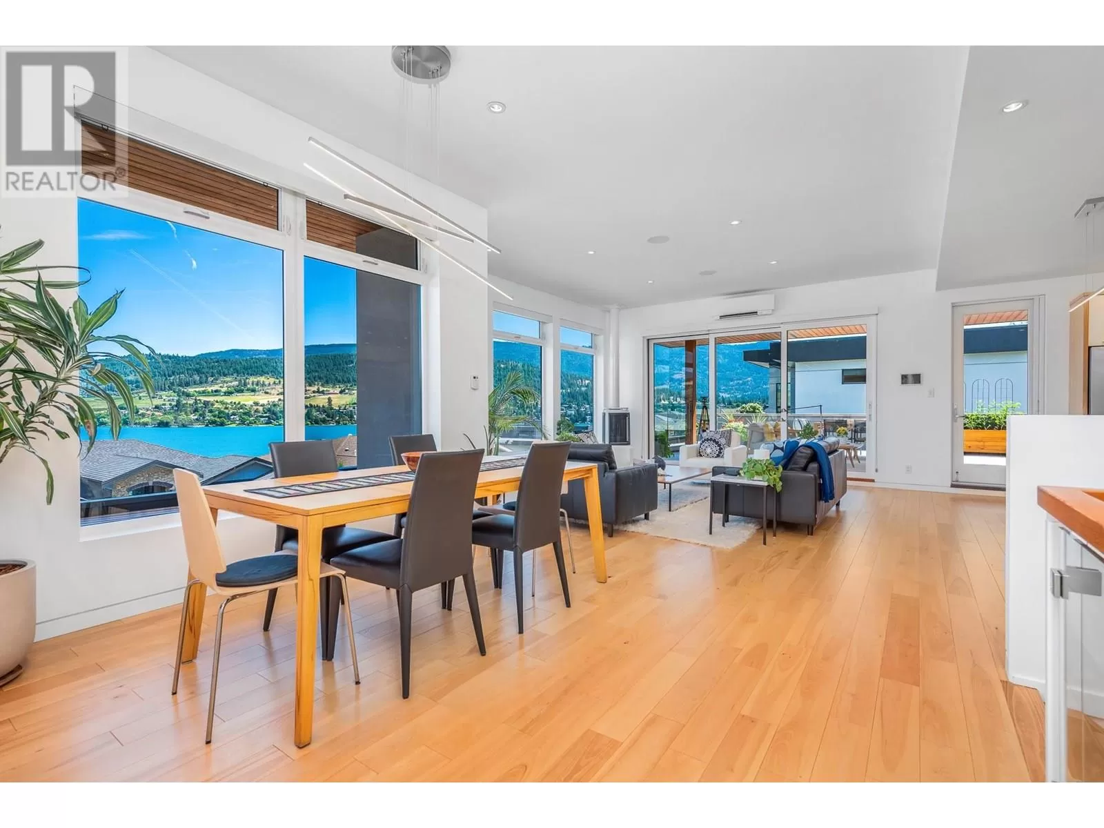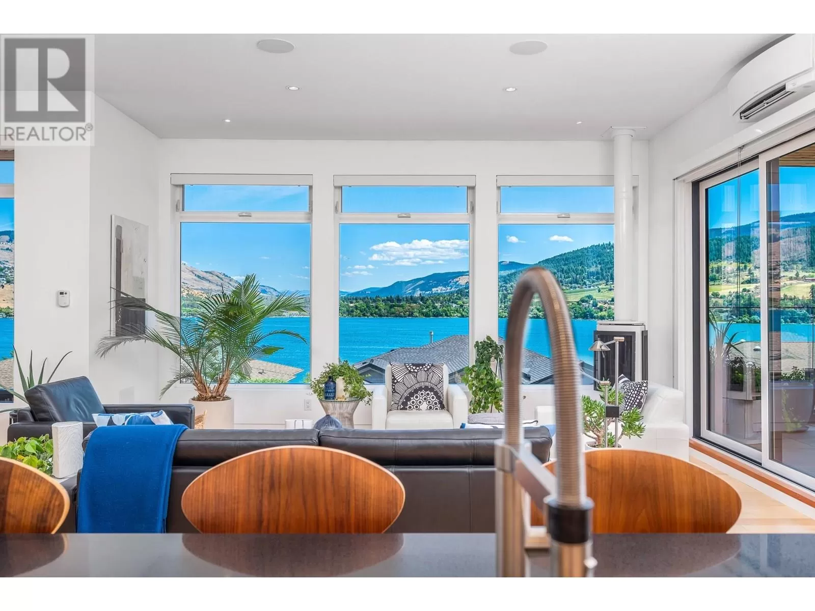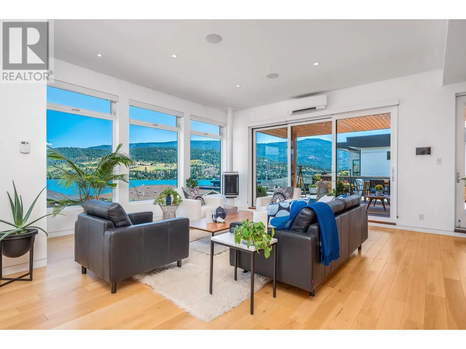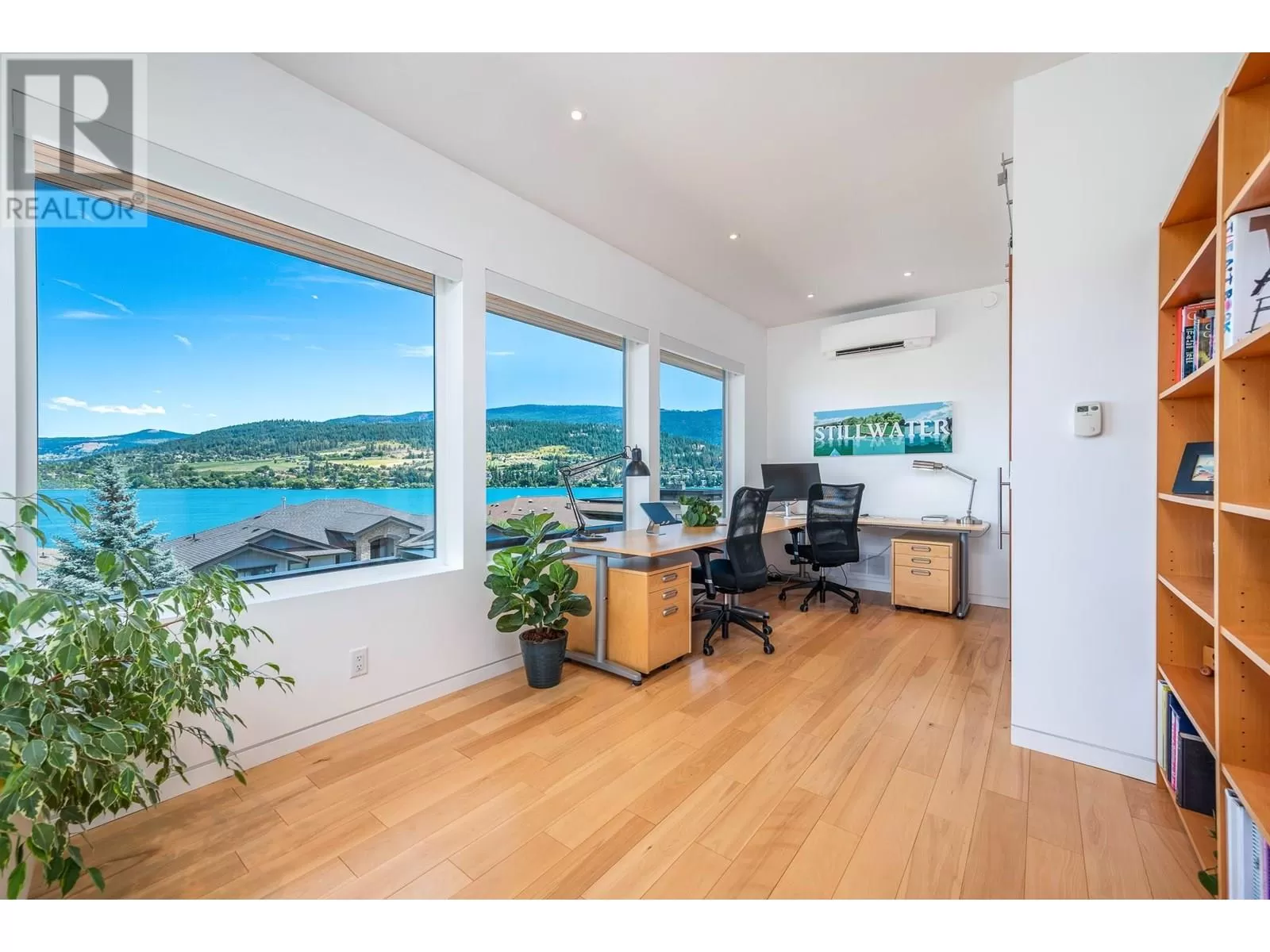 Drawing inspiration from Frank Lloyd Wright, this architecturally stunning home blends modern elegance with intelligent design. The exterior features custom metal privacy screens, cedar soffits with pot lighting, concrete planters, and exposed aggregate pathways with integrated stair lighting. A large, covered deck with glass railings captures breathtaking views of the Kalamalka Lake, Coldstream Valley, and Monashee Mountains. Inside, 2x8 double-staggered stud construction, 9 zone radiant in-floor heating and home automation for lighting, vertical blinds, water sensors, sound systems, TV, Security cameras, climate and home monitoring for comfort and efficiency. A private elevator connects all floors, including garage-to-kitchen access. Beech plank and tile flooring flow throughout, with rubberized tile in the gym. The top-floor kitchen features Miele appliances including a combi oven and steam oven, black quartz countertops, and a spacious island with a chefâs sink. The open living/dining area is surrounded by windows and features 3 panel sliding door making an 8â opening to a 24x24â partially covered deck with BBQ hookup and ceiling heater. The primary suite includes patio access, steam shower, dual vanity, and built-in cabinetry. 2 additional bedrooms, a full bathroom, den, large office, and gym round out the space. Thoughtfully integrated storage, an epoxy-finished garage, ductless AC, HRV and humidifier systems, and a hot water boiler complete this exceptional smart home. (id:27476)