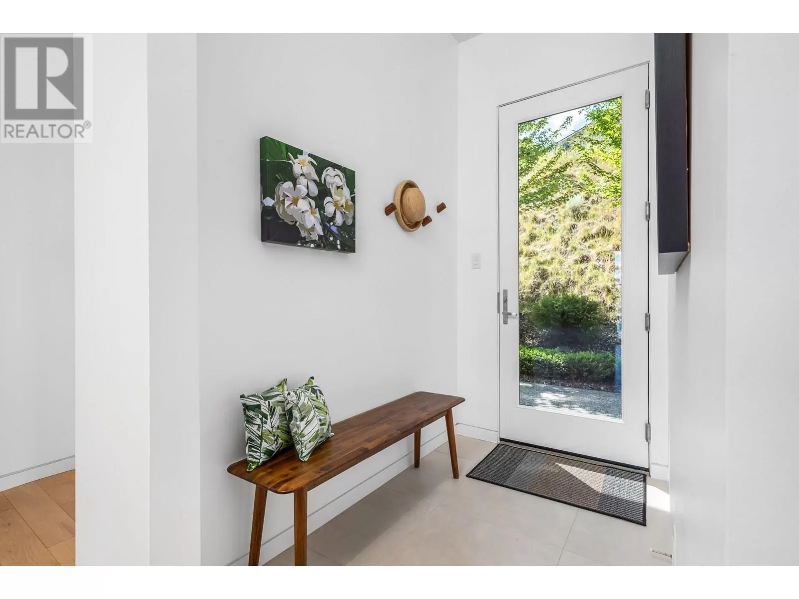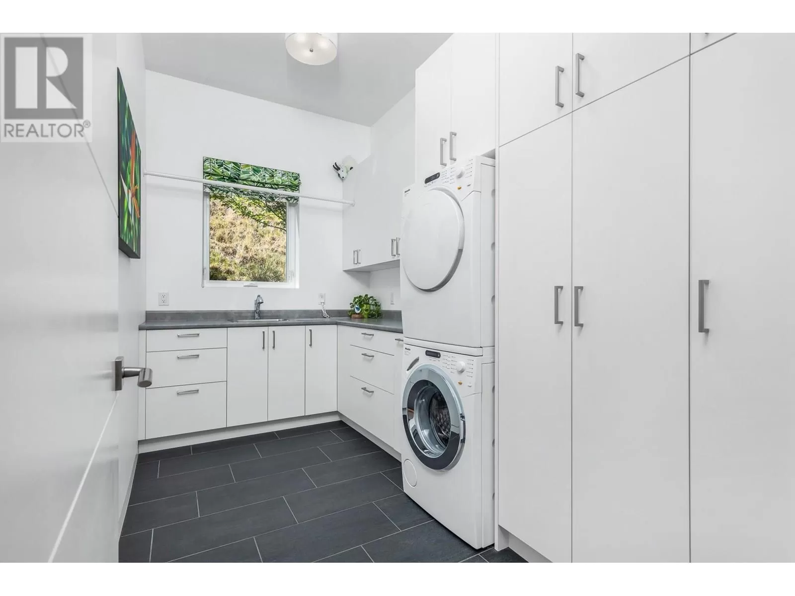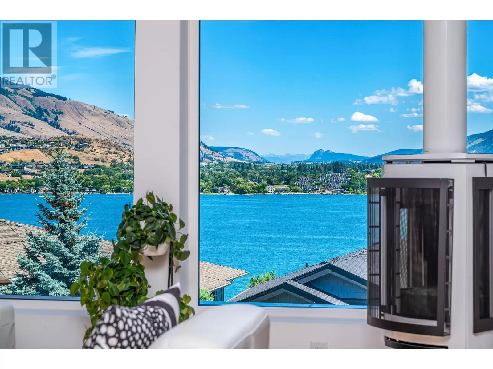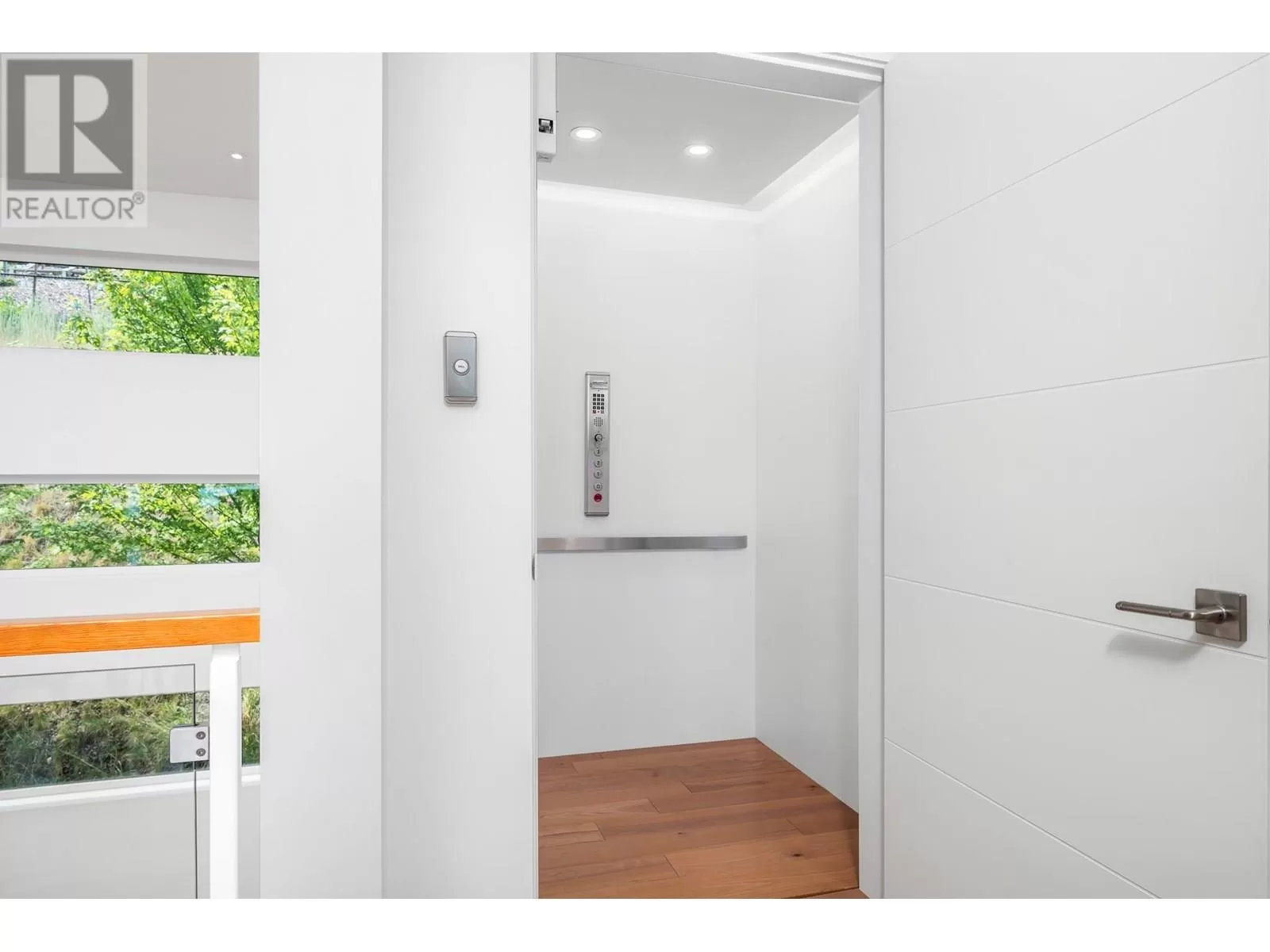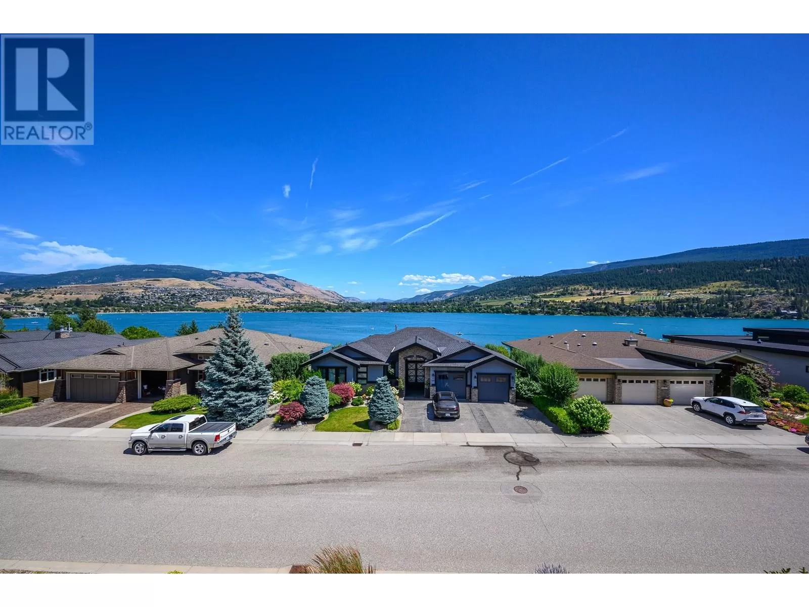Drawing inspiration from Frank Lloyd Wright, this architecturally stunning home blends modern elegance with intelligent design. The exterior features custom metal privacy screens, cedar soffits with pot lighting, concrete planters, and exposed aggregate pathways with integrated stair lighting. A large, covered deck with glass railings captures breathtaking views of the Kalamalka Lake, Coldstream Valley, and Monashee Mountains. Inside, 2x8 double-staggered stud construction, 9 zone radiant in-floor heating and home automation for lighting, vertical blinds, water sensors, sound systems, TV, Security cameras, climate and home monitoring for comfort and efficiency. A private elevator connects all floors, including garage-to-kitchen access. Beech plank and tile flooring flow throughout, with rubberized tile in the gym. The top-floor kitchen features Miele appliances including a combi oven and steam oven, black quartz countertops, and a spacious island with a chefâs sink. The open living/dining area is surrounded by windows and features 3 panel sliding door making an 8â opening to a 24x24â partially covered deck with BBQ hookup and ceiling heater. The primary suite includes patio access, steam shower, dual vanity, and built-in cabinetry. 2 additional bedrooms, a full bathroom, den, large office, and gym round out the space. Thoughtfully integrated storage, an epoxy-finished garage, ductless AC, HRV and humidifier systems, and a hot water boiler complete this exceptional smart home. (id:27476)