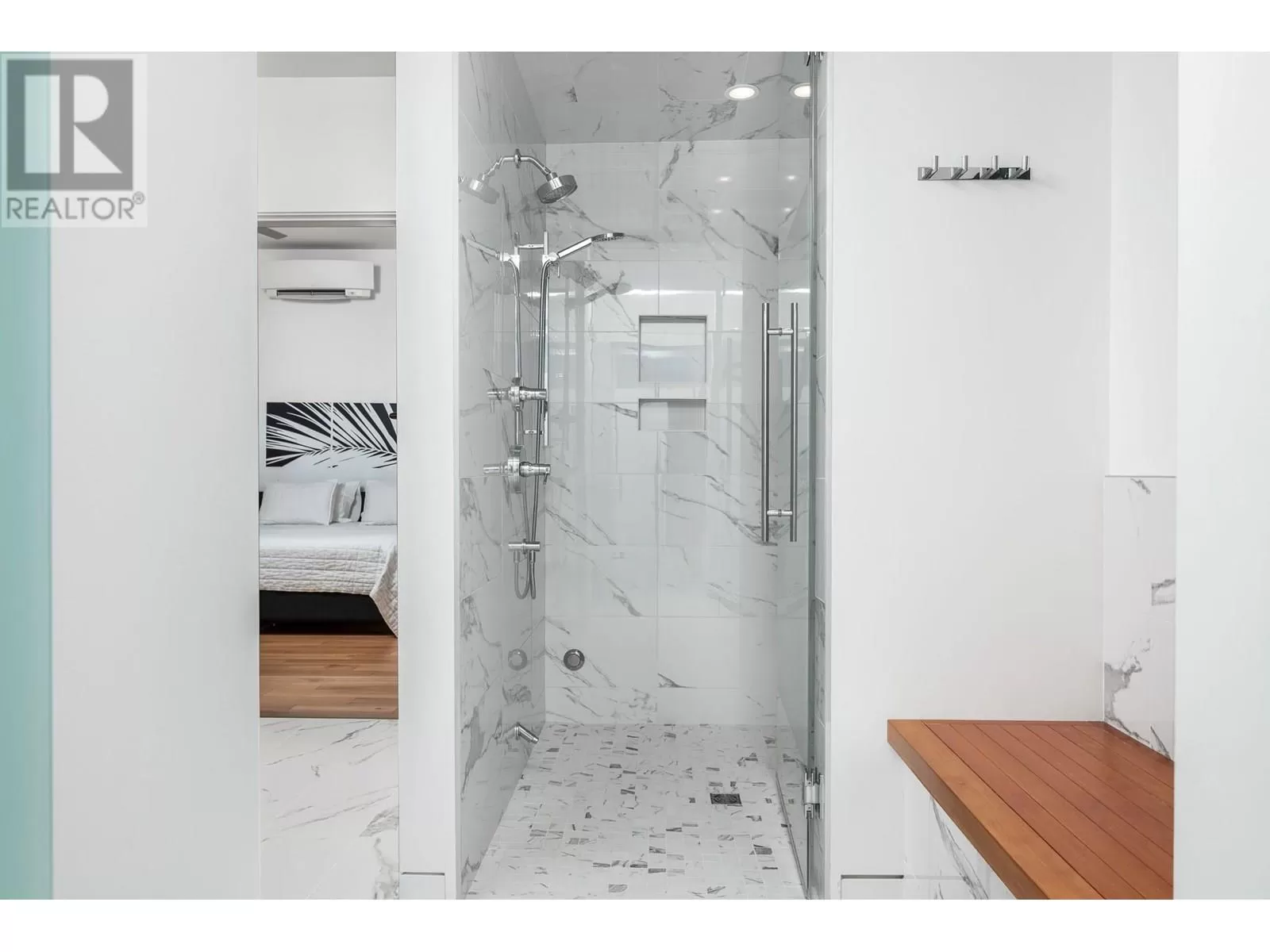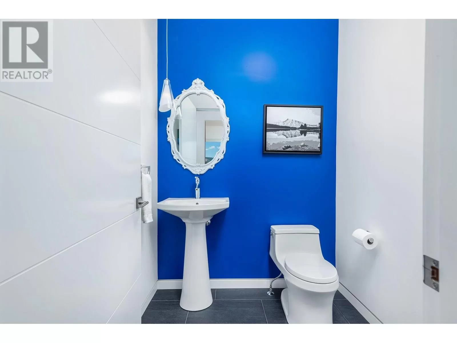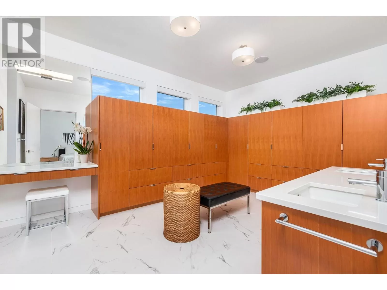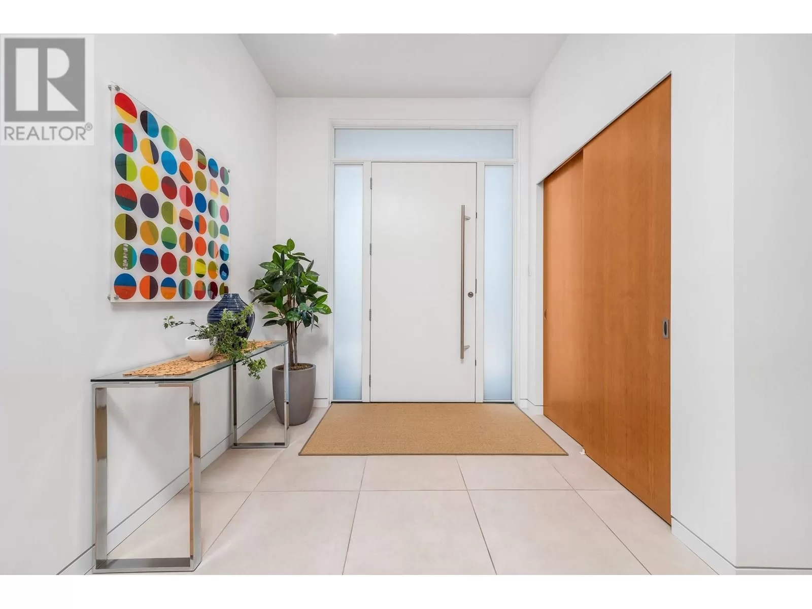 Drawing inspiration from Frank Lloyd Wright, this architecturally stunning home blends modern elegance with intelligent design. The exterior features custom metal privacy screens, cedar soffits with pot lighting, concrete planters, and exposed aggregate pathways with integrated stair lighting. A large, covered deck with glass railings captures breathtaking views of the Kalamalka Lake, Coldstream Valley, and Monashee Mountains. Inside, 2x8 double-staggered stud construction, 9 zone radiant in-floor heating and home automation for lighting, vertical blinds, water sensors, sound systems, TV, Security cameras, climate and home monitoring for comfort and efficiency. A private elevator connects all floors, including garage-to-kitchen access. Beech plank and tile flooring flow throughout, with rubberized tile in the gym. The top-floor kitchen features Miele appliances including a combi oven and steam oven, black quartz countertops, and a spacious island with a chefâs sink. The open living/dining area is surrounded by windows and features 3 panel sliding door making an 8â opening to a 24x24â partially covered deck with BBQ hookup and ceiling heater. The primary suite includes patio access, steam shower, dual vanity, and built-in cabinetry. 2 additional bedrooms, a full bathroom, den, large office, and gym round out the space. Thoughtfully integrated storage, an epoxy-finished garage, ductless AC, HRV and humidifier systems, and a hot water boiler complete this exceptional smart home. (id:27476)