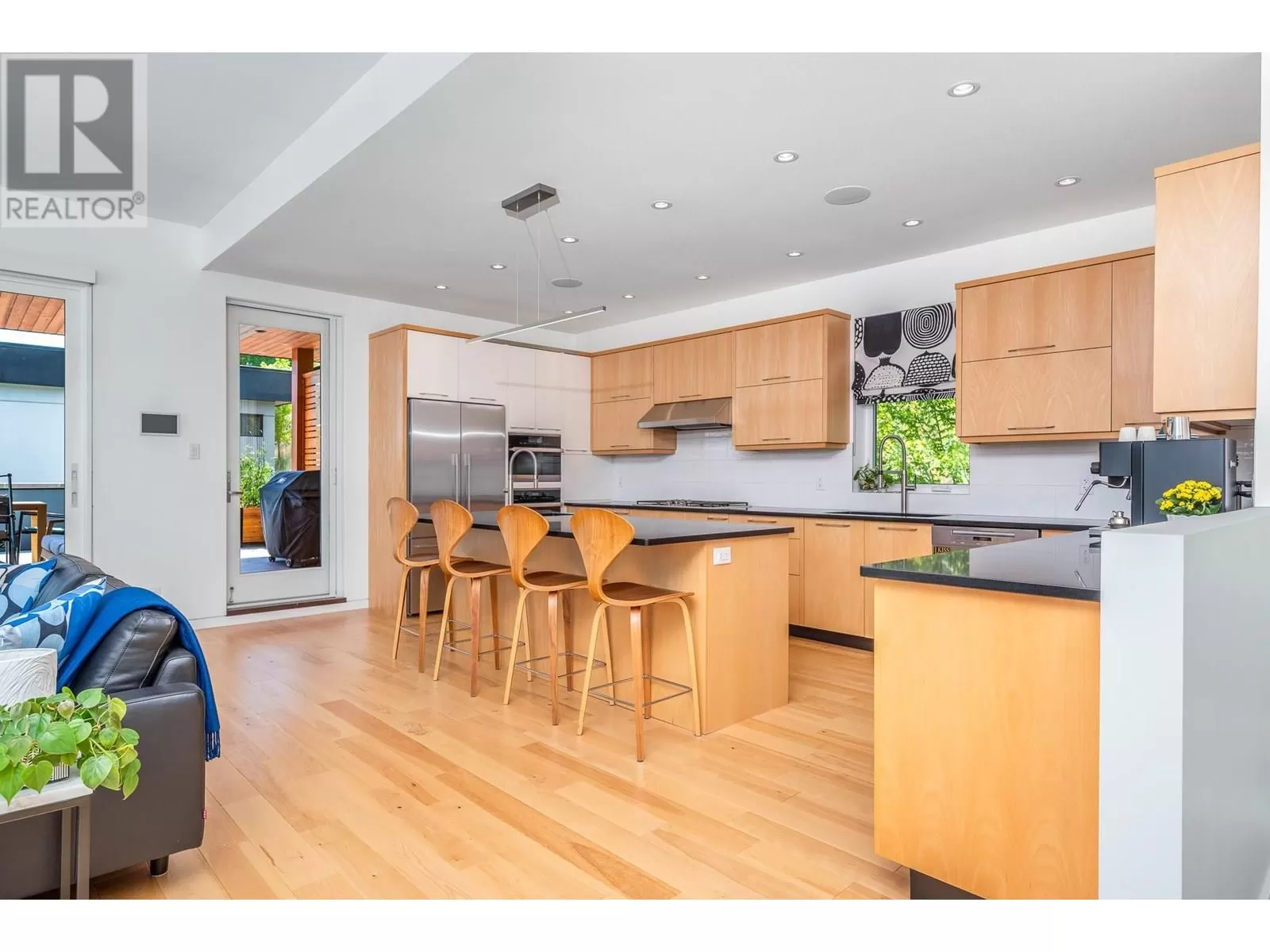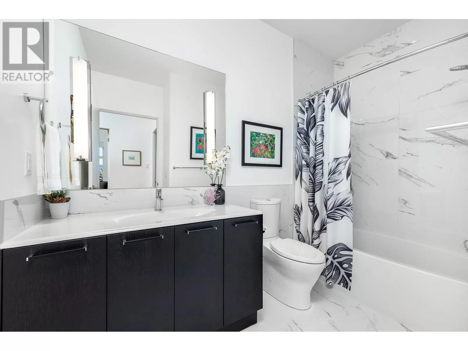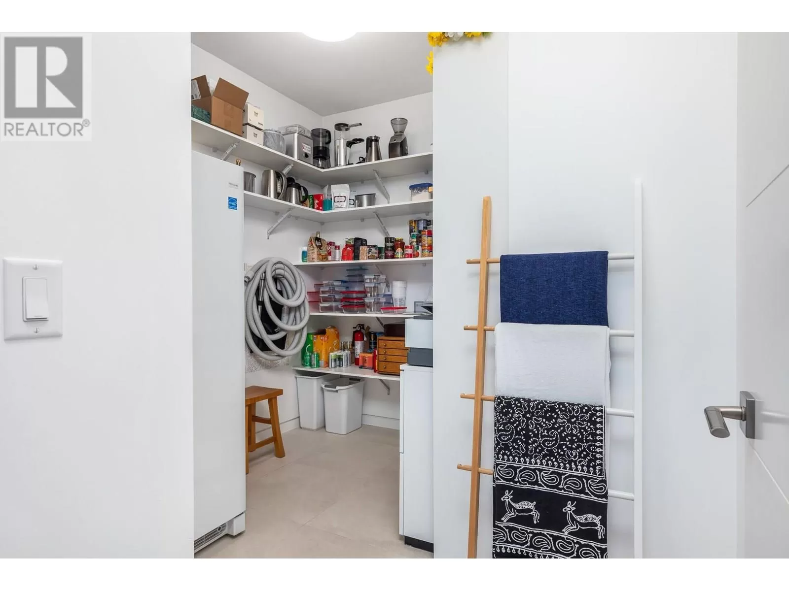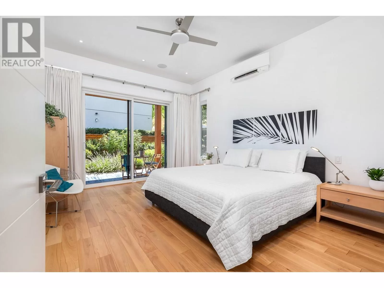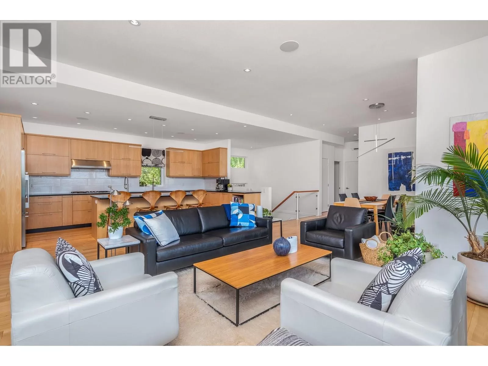 Drawing inspiration from Frank Lloyd Wright, this architecturally stunning home blends modern elegance with intelligent design. The exterior features custom metal privacy screens, cedar soffits with pot lighting, concrete planters, and exposed aggregate pathways with integrated stair lighting. A large, covered deck with glass railings captures breathtaking views of the Kalamalka Lake, Coldstream Valley, and Monashee Mountains. Inside, 2x8 double-staggered stud construction, 9 zone radiant in-floor heating and home automation for lighting, vertical blinds, water sensors, sound systems, TV, Security cameras, climate and home monitoring for comfort and efficiency. A private elevator connects all floors, including garage-to-kitchen access. Beech plank and tile flooring flow throughout, with rubberized tile in the gym. The top-floor kitchen features Miele appliances including a combi oven and steam oven, black quartz countertops, and a spacious island with a chefâs sink. The open living/dining area is surrounded by windows and features 3 panel sliding door making an 8â opening to a 24x24â partially covered deck with BBQ hookup and ceiling heater. The primary suite includes patio access, steam shower, dual vanity, and built-in cabinetry. 2 additional bedrooms, a full bathroom, den, large office, and gym round out the space. Thoughtfully integrated storage, an epoxy-finished garage, ductless AC, HRV and humidifier systems, and a hot water boiler complete this exceptional smart home. (id:27476)
