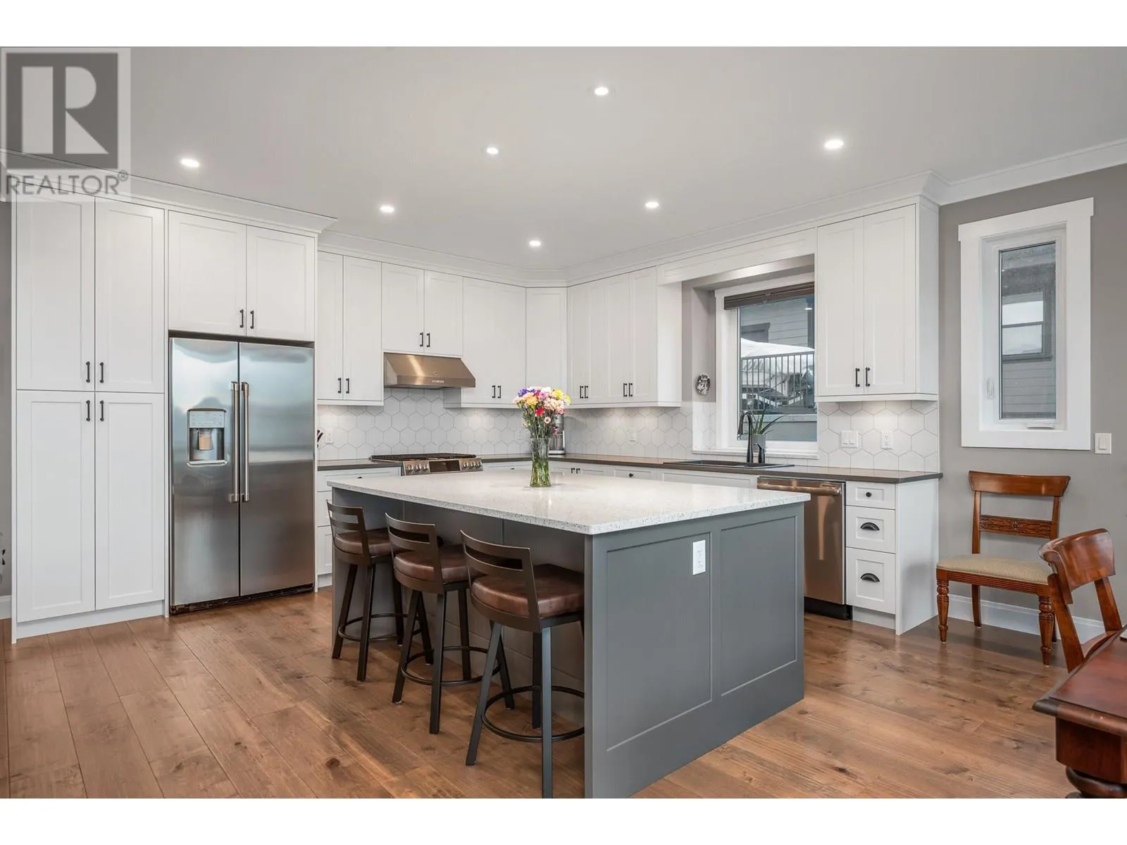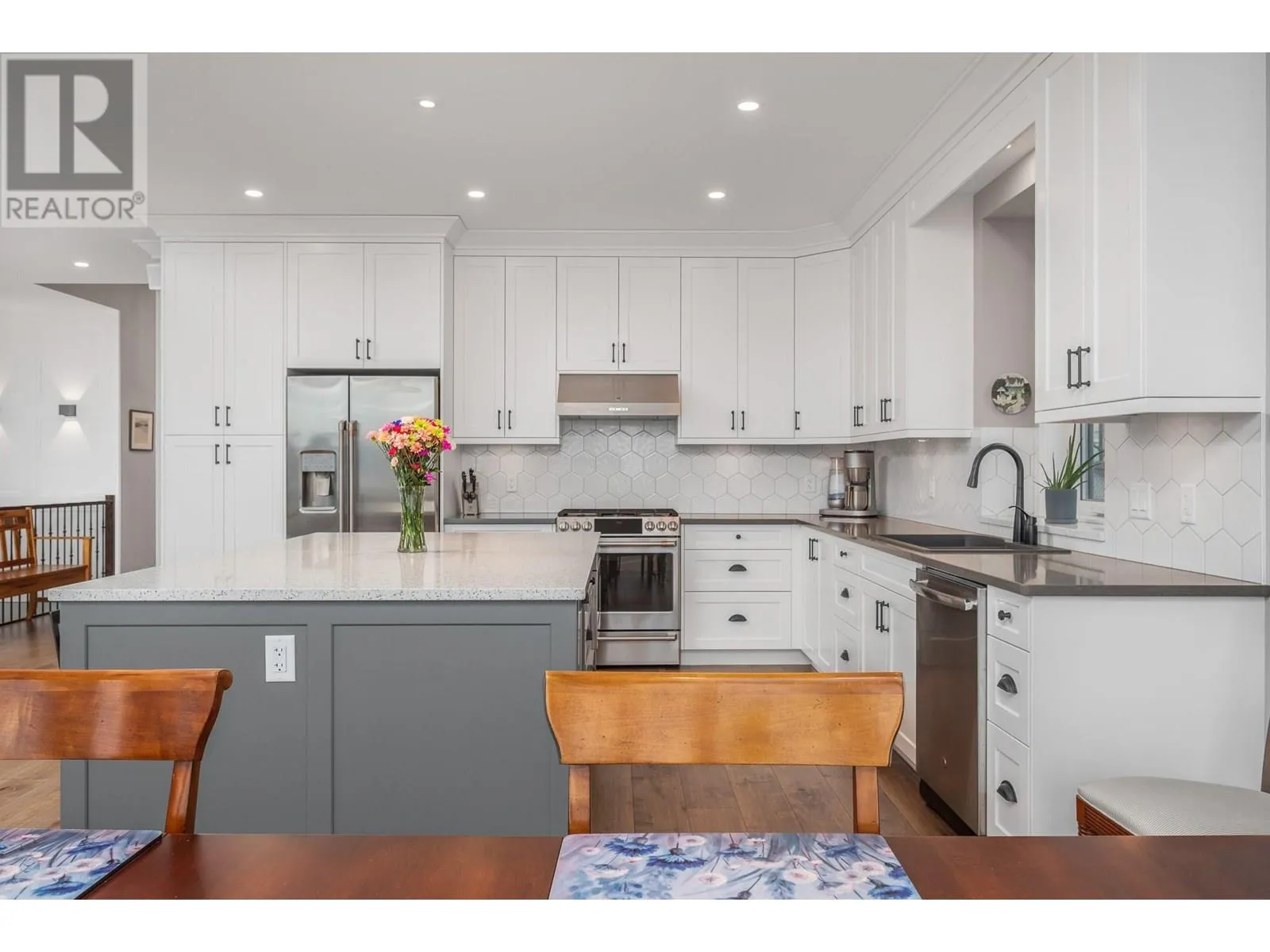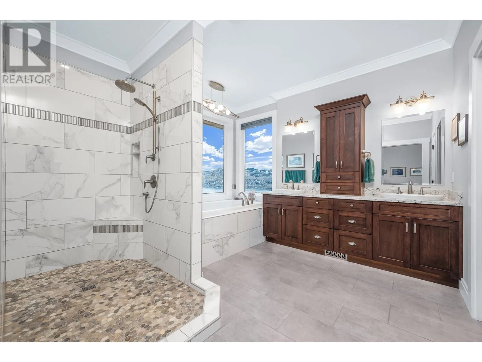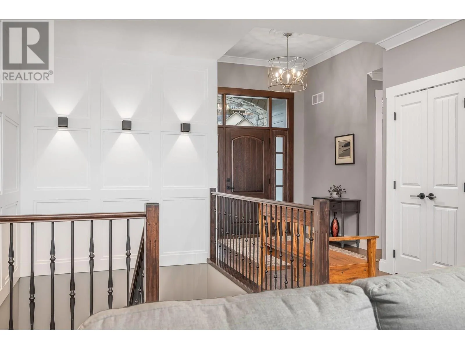 Welcome to your dream home in the heart of Coldstream, where jaw-dropping views of Kalamalka Lake take center stage. Thoughtfully designed and built in 2020, this 5-bedroom walkout rancher perfectly blends modern elegance with relaxed comfort, making it ideal for families, entertainers, and anyone who loves the outdoors. From the moment you walk through the door, youâre greeted with wall-to-wall windows that capture panoramic lake views and flood the space with natural light. The open-concept main floor showcases a stunning chefâs kitchen with quartz countertops, custom cabinetry, a large island, and a gas rangeâideal for cooking, hosting, or just hanging out with family. The living area is anchored by a floor-to-ceiling stone fireplace, creating warmth and ambiance year-round. The main floor primary suite is a true retreat with a spa-like ensuite featuring double vanities, a tiled walk-in shower, a soaker tub with lake views, and a spacious walk-in closet. Two additional bedrooms (or home office/flex space) and elevated details throughoutâlike engineered hardwood flooring, crown moldings, and designer lightingâadd to the refined but comfortable feel. Step outside to your covered deck and take in the unobstructed lake and valley viewsâperfect for morning coffee or sunset wine. Downstairs, the bright walkout level is packed with potential. With a roughed-in kitchen, itâs ideal for a future suite or multigenerational living. It includes a second gas fireplace, full bathroom with double vanity, large rec room, and two more generously sized bedroomsâeach with double closets. Other standout features include: Hot water on demand High-efficiency two-stage furnace Oversized double garage with lift-height ceilings RV/boat parking Quiet, desirable location close to Kal Lake, great schools, and the Okanagan Rail Trail If youâve been searching for a modern home with unbeatable views and everyday functionality, this is the one. Come experience Coldstream living at its finest. (id:27476)
