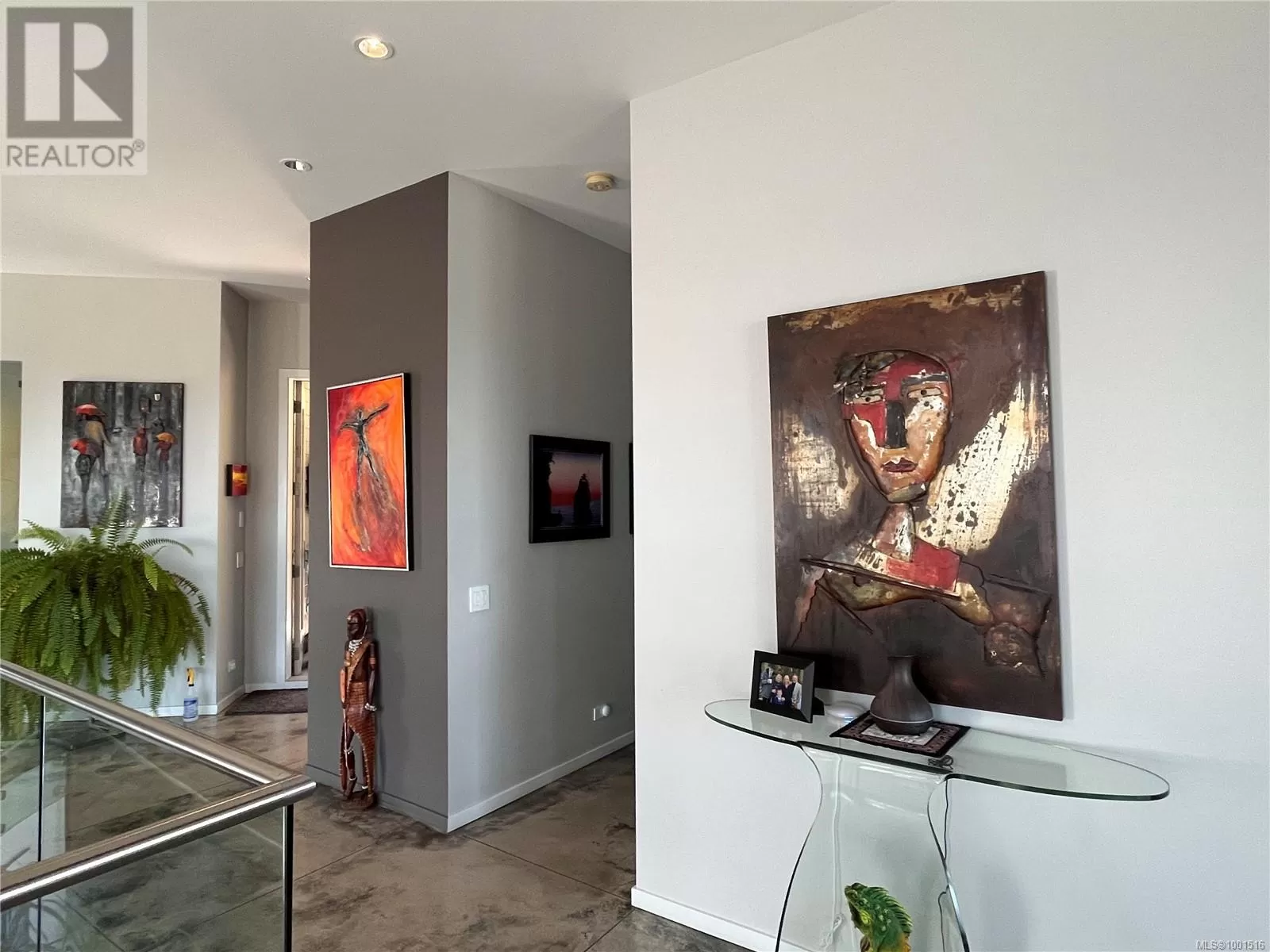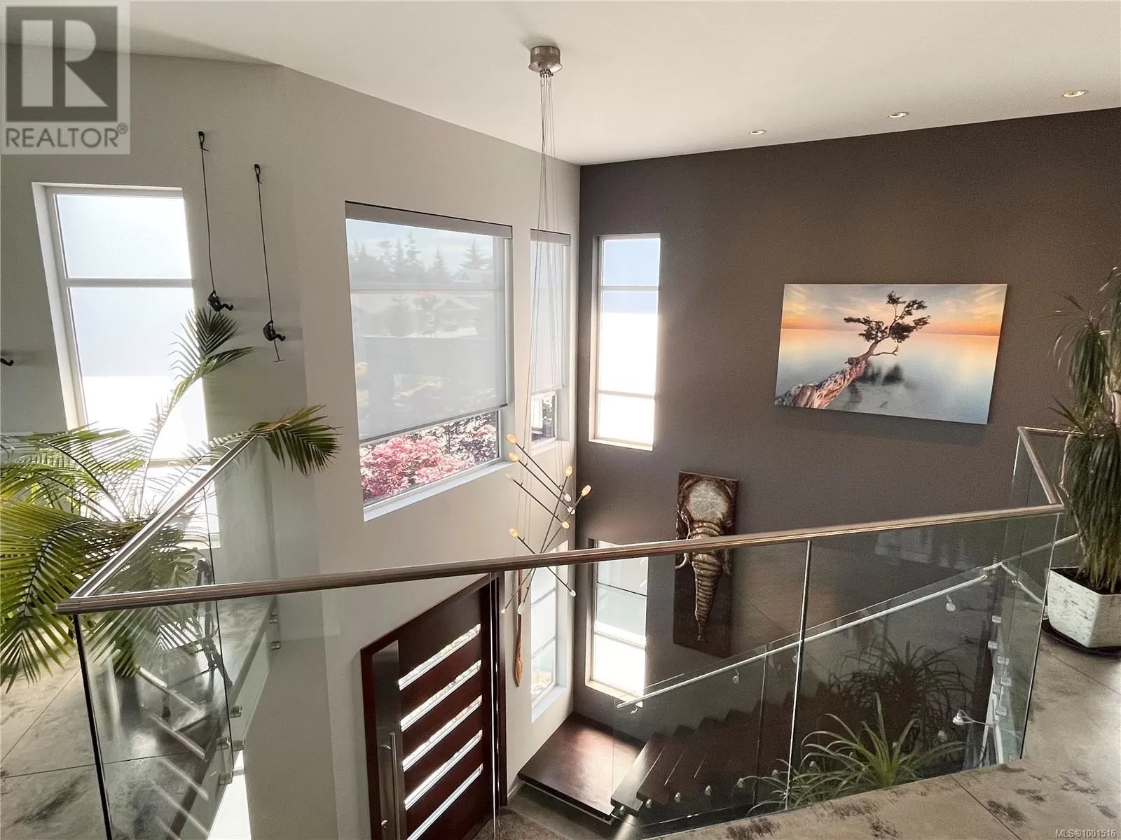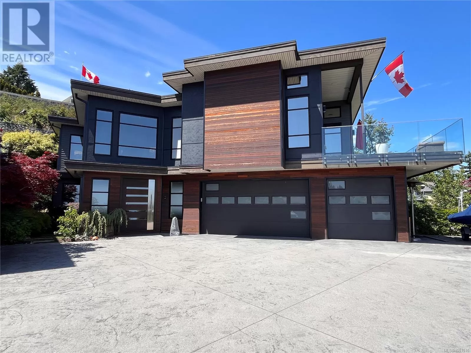 Experience elevated west coast living in this custom-built 2016 home offering stunning panoramic views of downtown Victoria, the Juan de Fuca Strait, and the Olympic Mountains. With over 3,200 sq ft of finished space, this 2-level residence is designed for flexibility, comfort and multigenerational living. Upper Level: The heart of the home features soaring 12-foot ceilings, a dramatic waterfall quartz island, 5-burner natural gas stove, and a modern water fireplace anchoring the open-concept living area. This level also includes the kitchen, dining area, home office, powder room, laundry room, and a spacious primary bedroom with a walk-in closet and a beautifully appointed en-suite. Lower Level: Perfect for guests, family, or private retreat, the lower level offers a second primary bedroom with ensuite, a third bedroom, and a versatile media room currently used as a hot yoga studio. A dedicated wine room and adjacent mechanical room provide added function and storage. Additional features include 4 bathrooms in total, a oversized double car garage, and the balance of the new home warranty. Located in a peaceful enclave, this home delivers breathtaking views, refined finishes, and thoughtful design throughout. (id:27476)