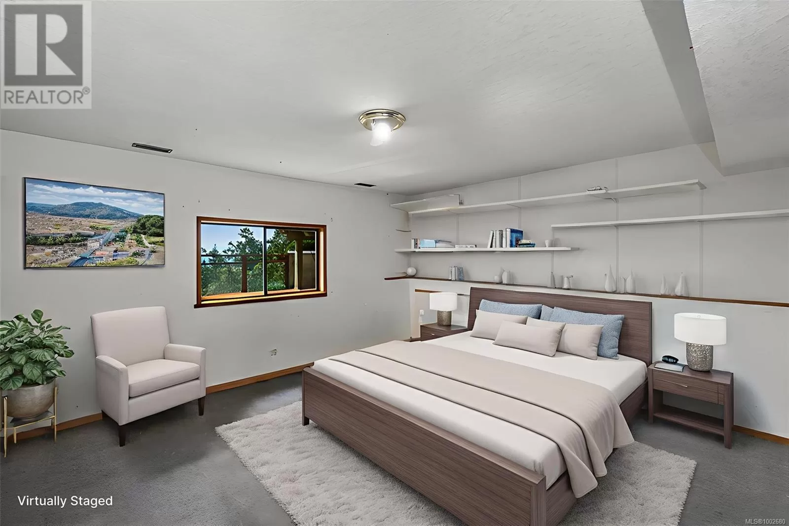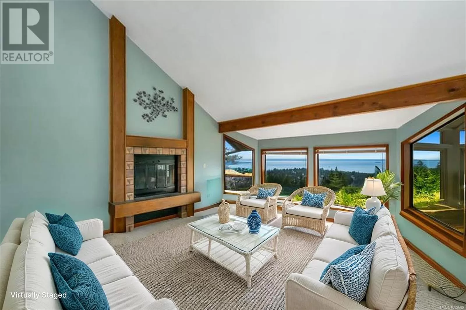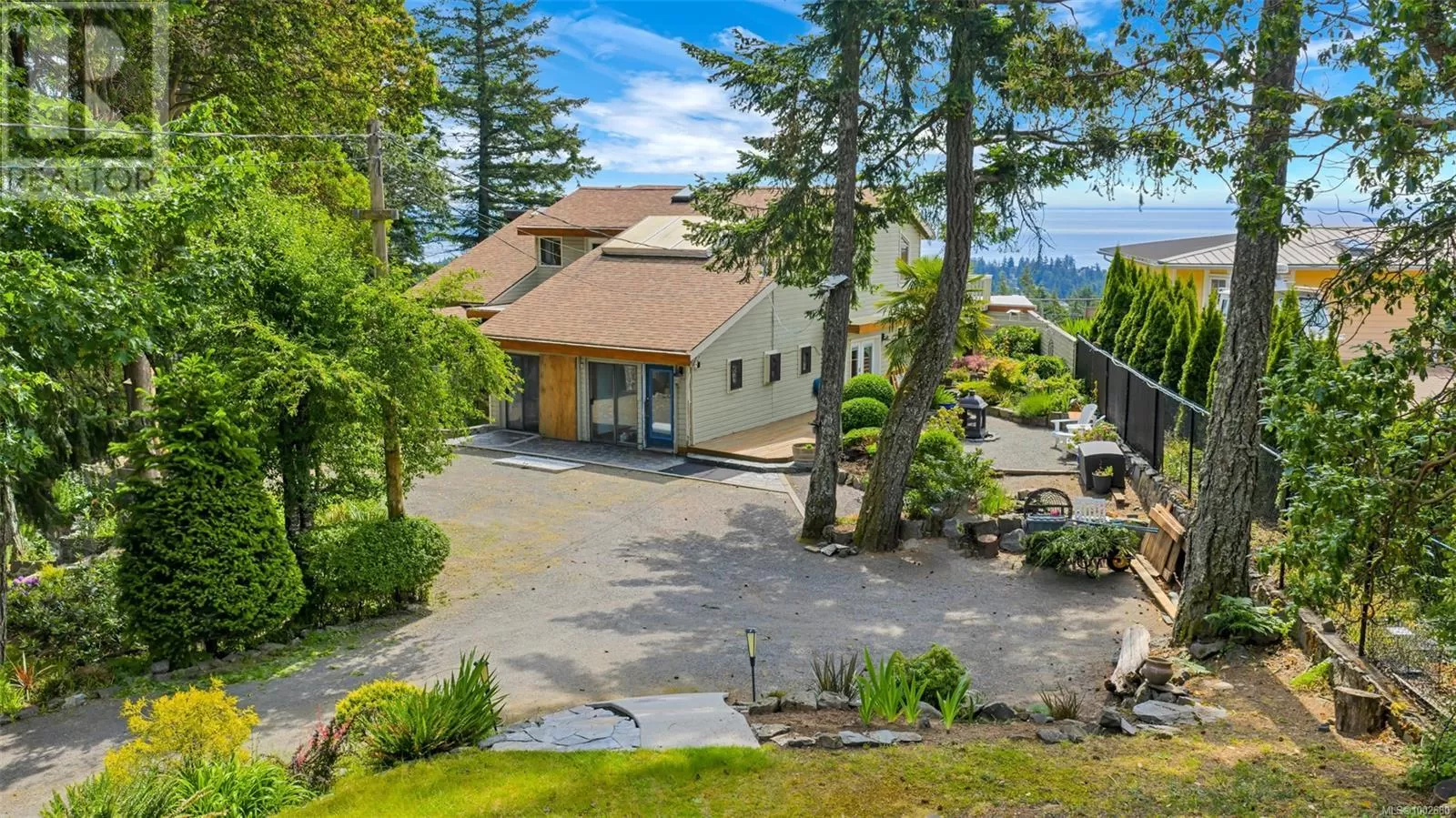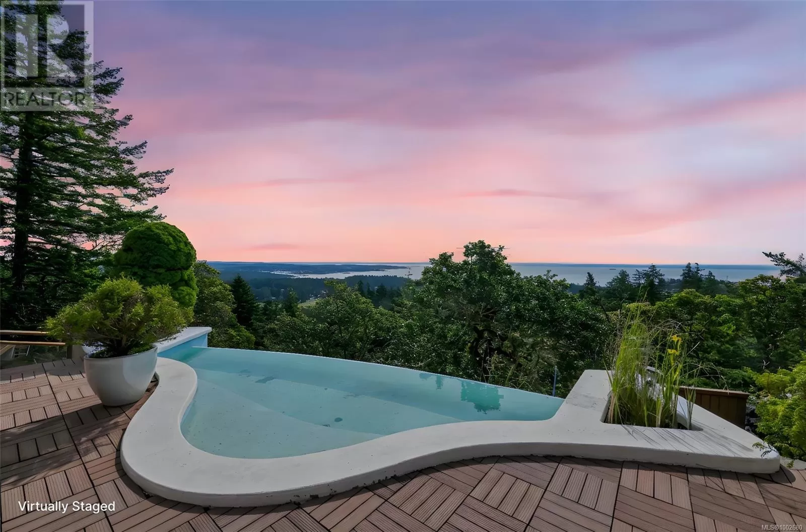 Perched at the peak of prestigious Triangle Mountain, where sky and sea converge, this one-of-a-kind West Coast home situated on .94 acre-offers an unrivaled vantage point with panoramic views stretching from the Olympic Mountains, across the Salish Sea, to the twinkling skyline of downtown Victoria. Thoughtfully designed to maximize natural light and the ever-changing coastal backdrop, the main level showcases a striking dining area framed by floor-to-ceiling windows and set on elegant slated tile. The upper gallery landing overlooks the bright, spacious living areas below, with a skylight feature flooding the home in warm light. Wood-burning fireplaces throughout provide cozy character, while tiled flooring offers both function and West Coast flair. Upstairs, several bedrooms are thoughtfully arranged, with the primary suite offering a private sanctuary complete with walk-in closet, ensuite bath, enclosed sunroom, and an intimate deck with front-row seats to Victoriaâs night lights. A convenient top-floor laundry area enhances functionality. Outside, serenity unfolds in layered garden terraces, hidden nooks, and a peaceful water feature beside a mature palm tree. The private plunge pool is an unexpected luxuryâperfect for soaking in the sun and the scene. Sundecks and patios flow naturally, creating an ideal blend of outdoor living and inspiration. Yes, some deferred maintenance and updates are neededâbut the bones, design, and location are truly extraordinary. This is a rare opportunity for the discerning buyer to restore and personalize a masterpiece in an elite location. Properties with these views and this potential do not come along often. Let your vision breathe new life into something truly special. (id:27476)