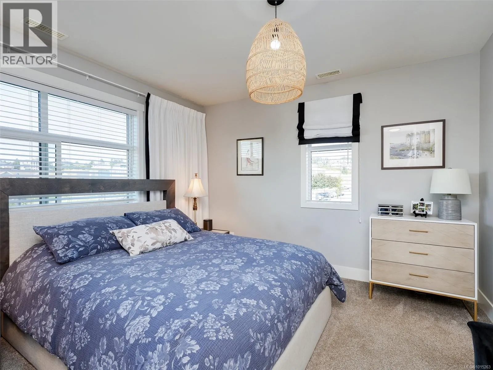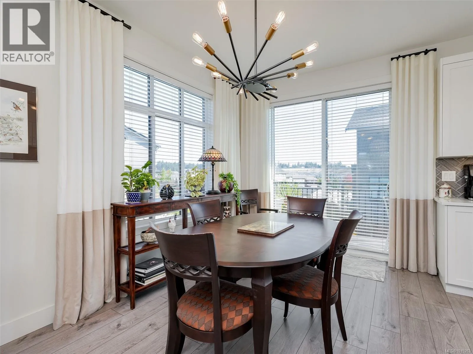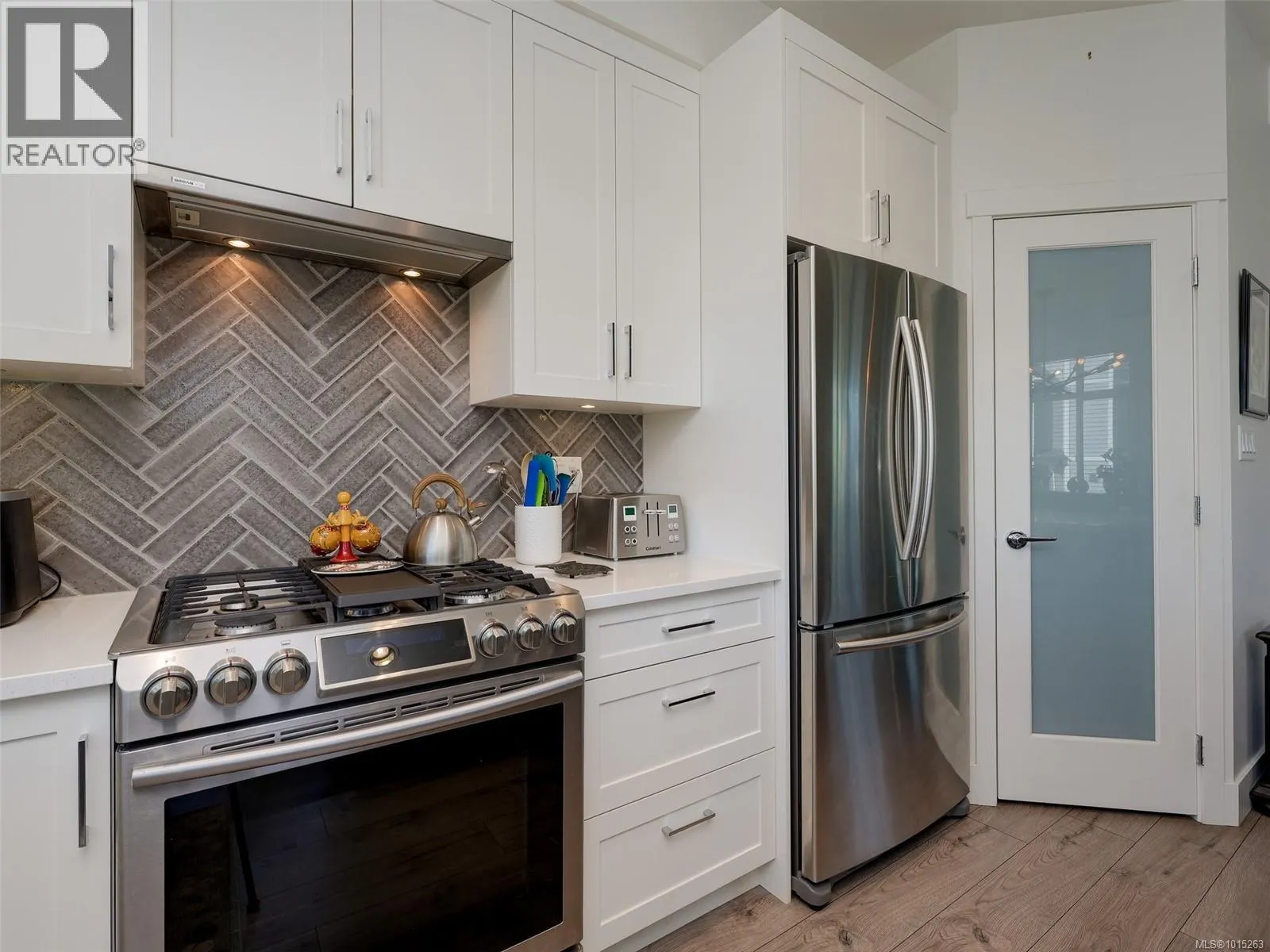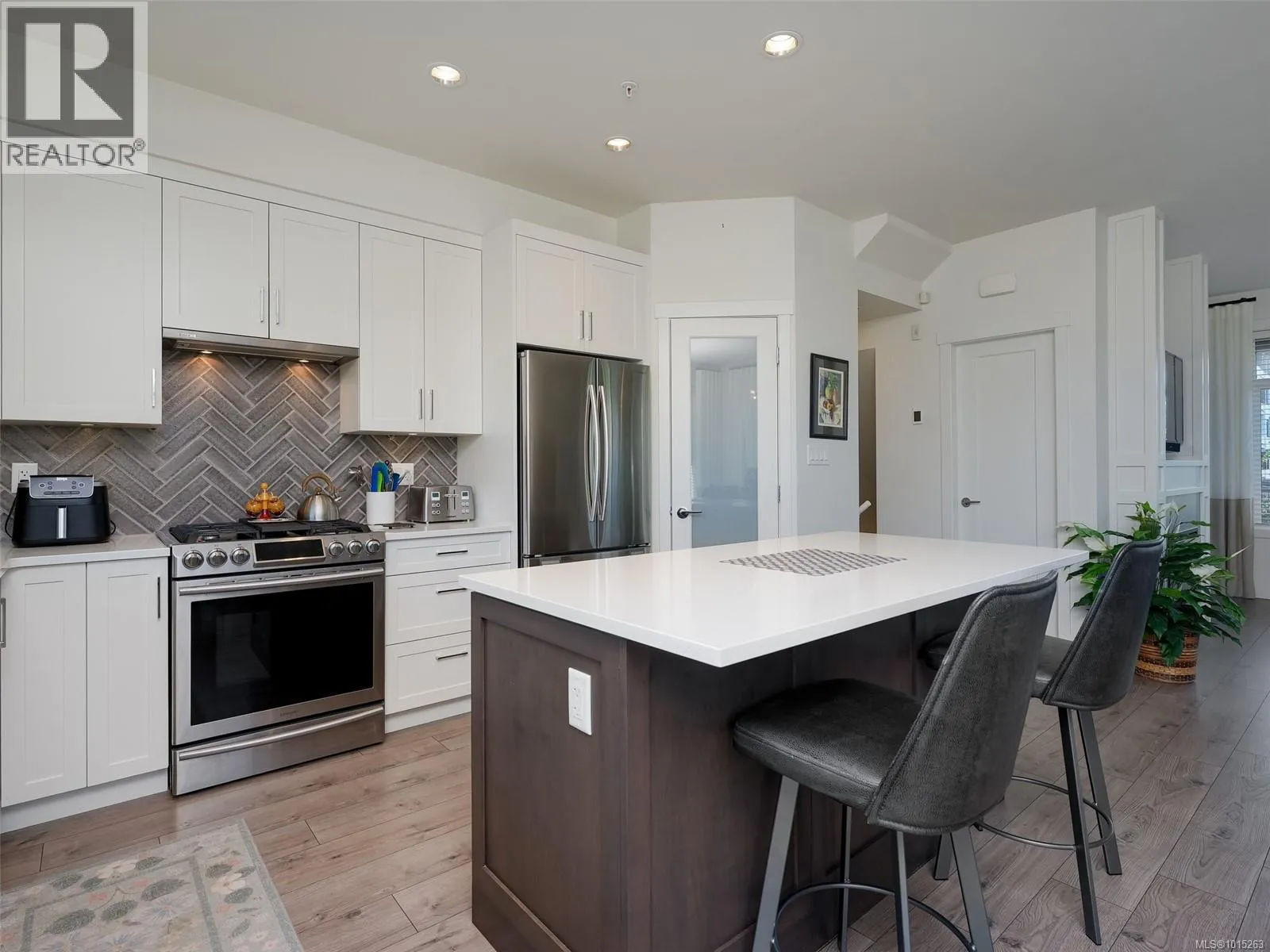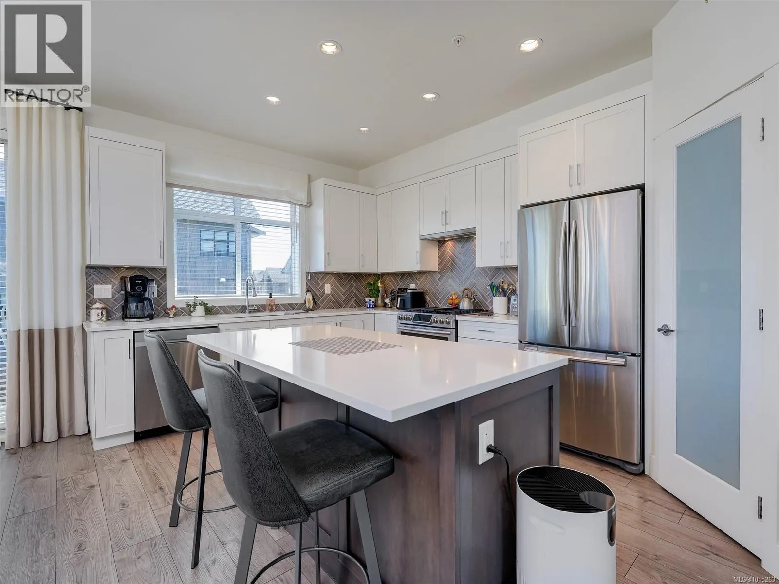 CORNER UNIT 4 bed, 3 bath townhome with 2 CAR GARAGE at the highly sought after Mariner at Royal Bay! The original Show Home with BRAND NEW HEAT PUMP! Inside you will get a true sense of quality with 9' ceilings on the main, large & open luxurious kitchen with quartz countertops, natural gas stove, stainless steel appliances, & beautiful electric fireplace with floor to ceiling feature wall! Excellent layout - 3 BEDROOMS UPSTAIRS including side by side laundry & double sink ensuite for primary bedroom. Downstairs has 4th bedroom that gives you lots of options such as home office or guest bedroom. Very well-maintained with extras such as heated 2 car garage, gas BBQ outlet, forced-air heat pump & large kitchen island. Outside you'll find a fenced private yard with covered entry & deck off kitchen. Enjoy the seaside community of Royal Bay & the Beach lands with beach side parks, trails, Royal Bay HS & the convenience of shopping at âThe Commonsâ Retail Village Centre just steps away. (id:27476)