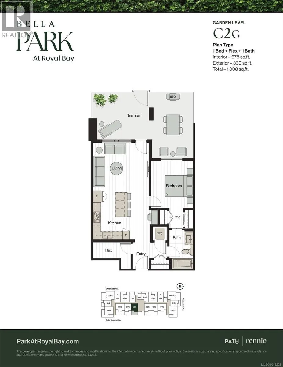 Step into the heart of Royal Bayâs vibrant seaside community at Bella Park, crafted by award-winning PATH Developments. This thoughtfully designed 1-bedroom + flex, garden-level home blends style, comfort, and functionality. The versatile flex room is perfect for extra storage, a dreamy walk-in closet, or a cozy reading retreat. Enjoy over-height ceilings and a large walk-out terrace offering a private entranceâideal for pet owners. The modern kitchen features quartz countertops, stainless steel appliances, an induction cooktop, and ample storage. Residents enjoy resort-style amenities, including a Clubhouse with a full kitchen and social lounge, fitness centre, yoga studio, co-working space, wellness spa with an outdoor hot tub, sauna, cold plunge, and shower, kayak storage and 2 guest suites. Set within 2+ acres of green space with walking paths and community gardens, just steps to the beach, walking trails, and all of your everyday amenities at the Commons. Price + GST. (id:27476)