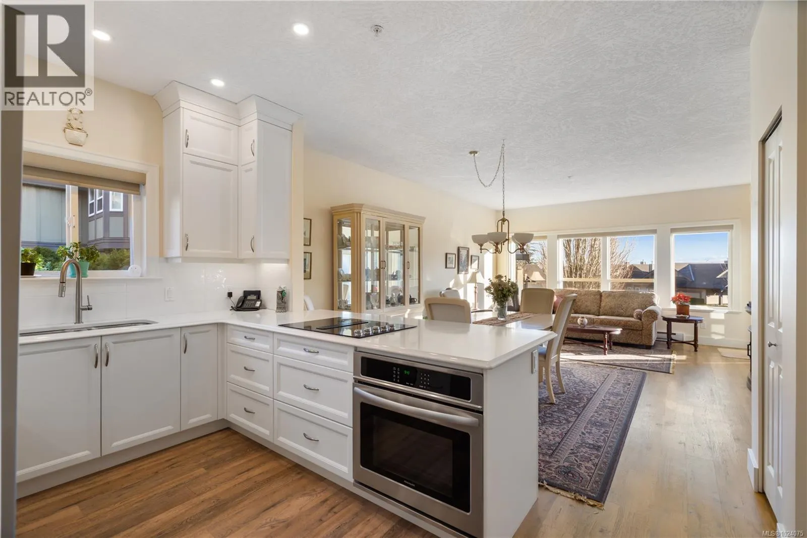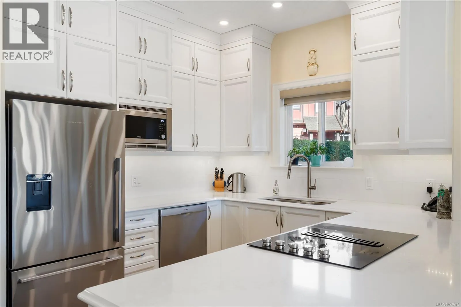Thoughtfully designed WestRidge townhome offering flexible, family-friendly living with true one-level convenience. The bright, open-concept main floor features a new kitchen with premium stainless steel appliances, Fisher & Paykel counter-depth fridge, granite countertops, white tile backsplash, under-cabinet lighting, and a separate electric cooktop with stainless built-in oven. Cozy gas fireplace anchors the living room, separate from the family and dining areas, which flow seamlessly to the glass-railed balcony. Spacious primary suite includes a walk-through closet and luxurious ensuite with marble countertops, porcelain tile, heated floors, and balcony access. The main floor also offers a convenient 2-piece powder room and laundry hidden in a closet for seamless one-level living. Downstairs, two large bedrooms share a full 4-piece bathroom, complemented by a versatile flex space ideal for a second family room, gym, homework area, or playroom. Private patios and mature landscaping create inviting outdoor living areas, including ample room for potted plants or a small garden. The home enjoys abundant natural light through plentiful glass, connecting indoor and outdoor spaces. Two sets of doors from the family room and primary bedroom lead to the balcony, while a separate balcony off the living room offers elevated views. Situated on a quiet, no-through road, this home is steps from the fully renovated playground and surrounded by nature and mature hedging, providing privacy and serenity often lacking in newer, tightly packed developments. Enjoy proximity to Royal Bay amenities including schools, restaurants, grocery stores, and the ocean, all while benefiting from thoughtful spaces designed for comfort, style, and everyday living. Perfect for families, entertaining, or those seeking the flexibility to age in place. (id:27476)